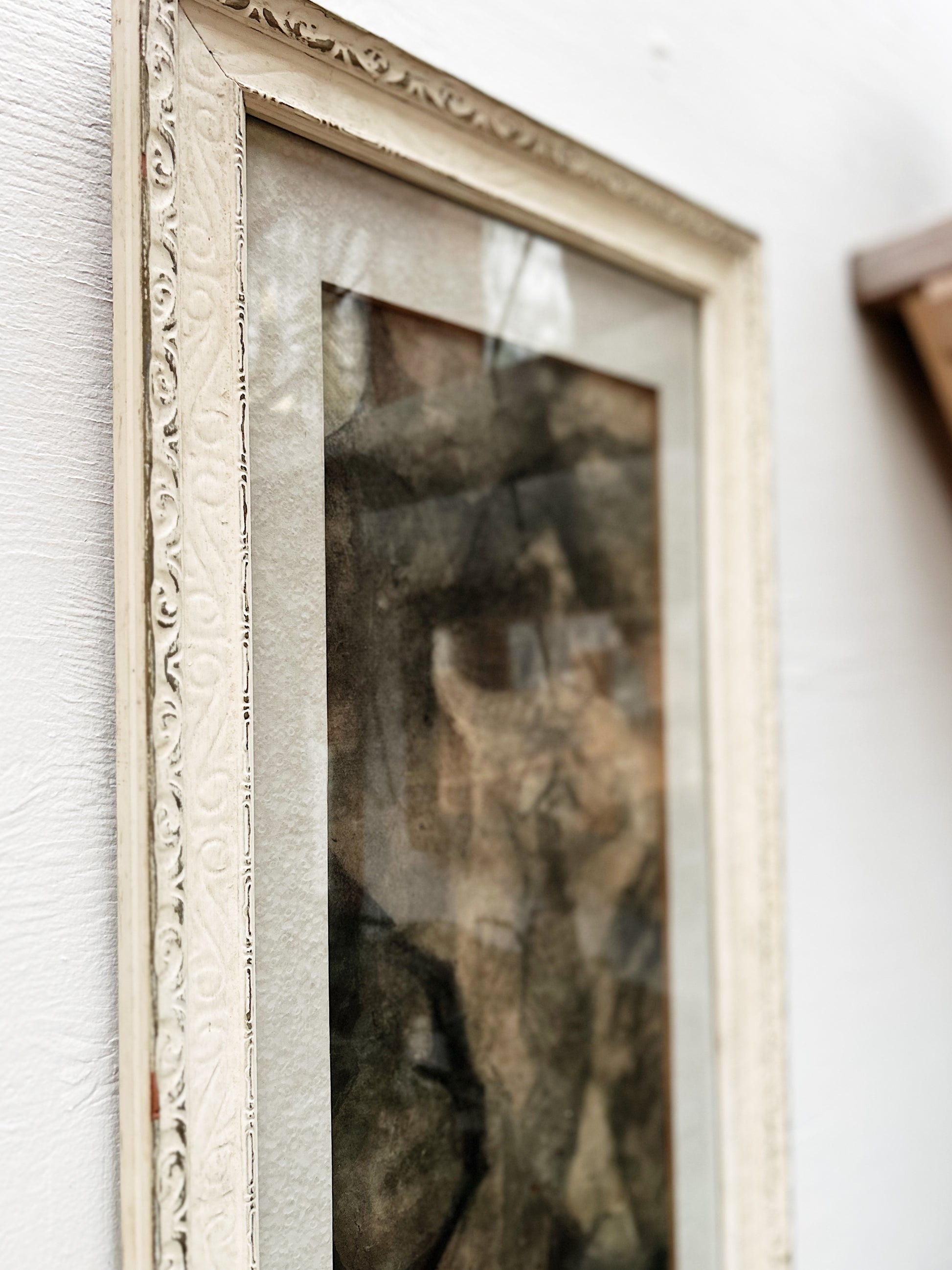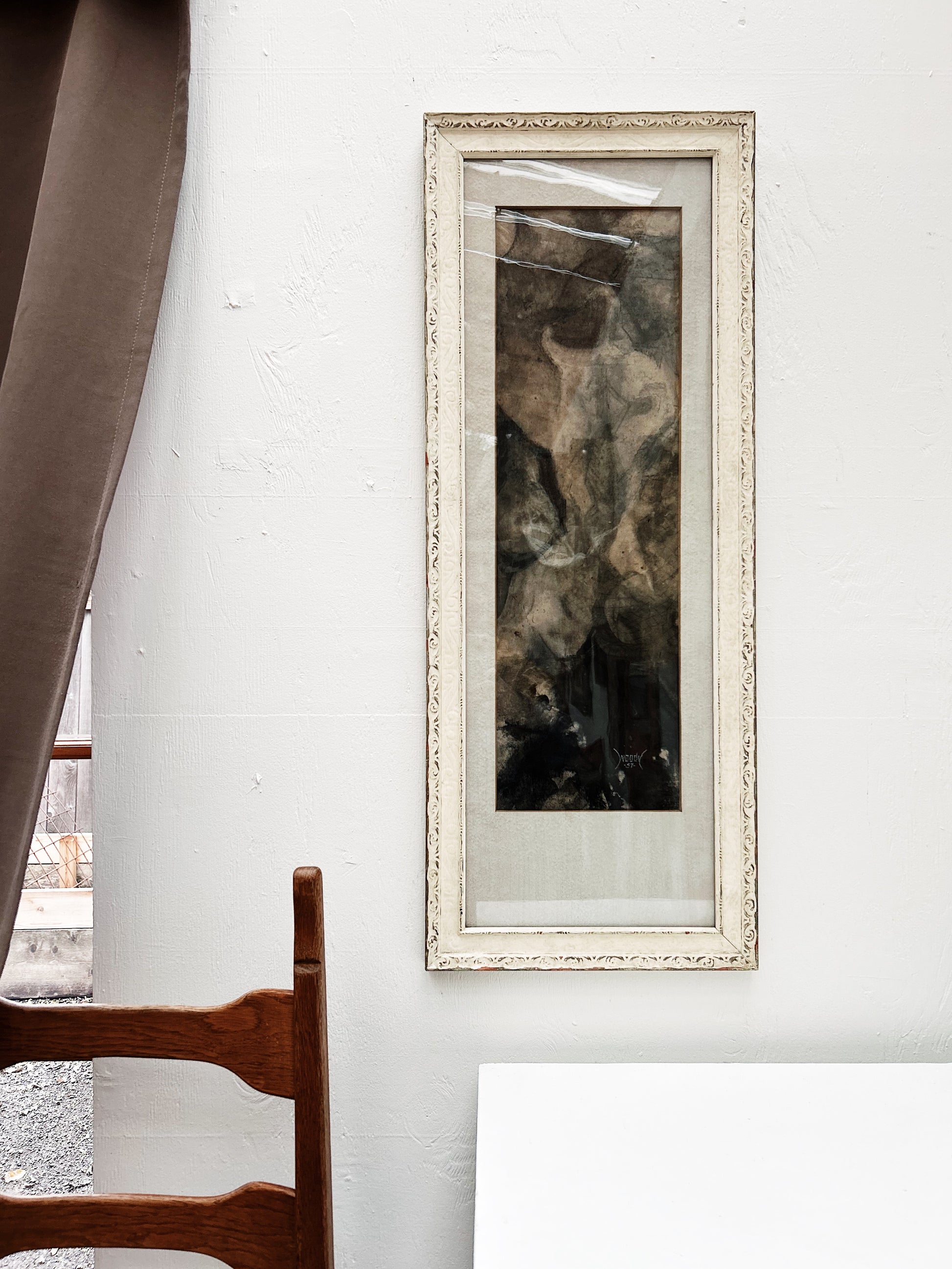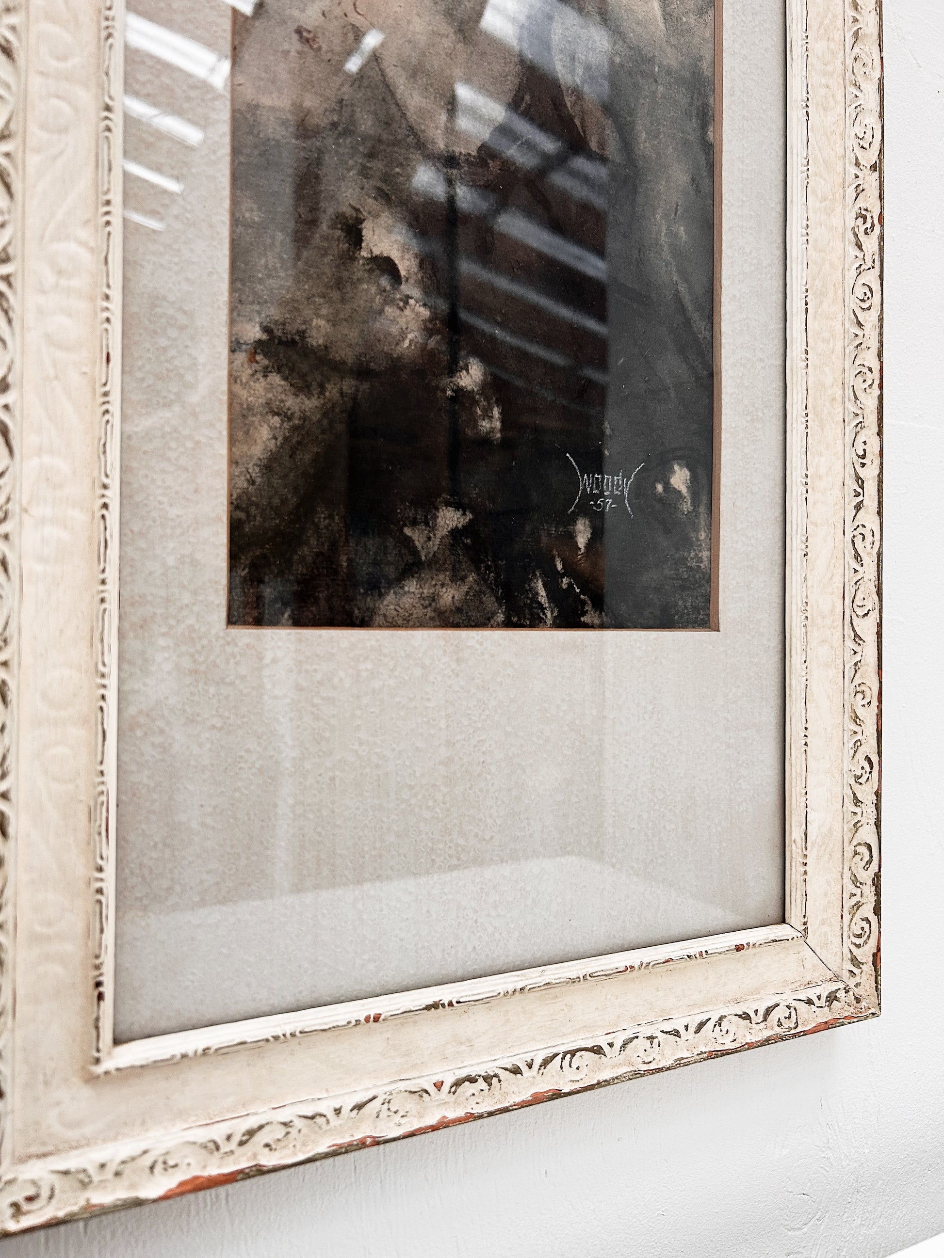 Woody Tallman ethereal smoke like painting. Watercolor and ink on board presented in an antique wood frame under wavy old glass. Signed, 1957.