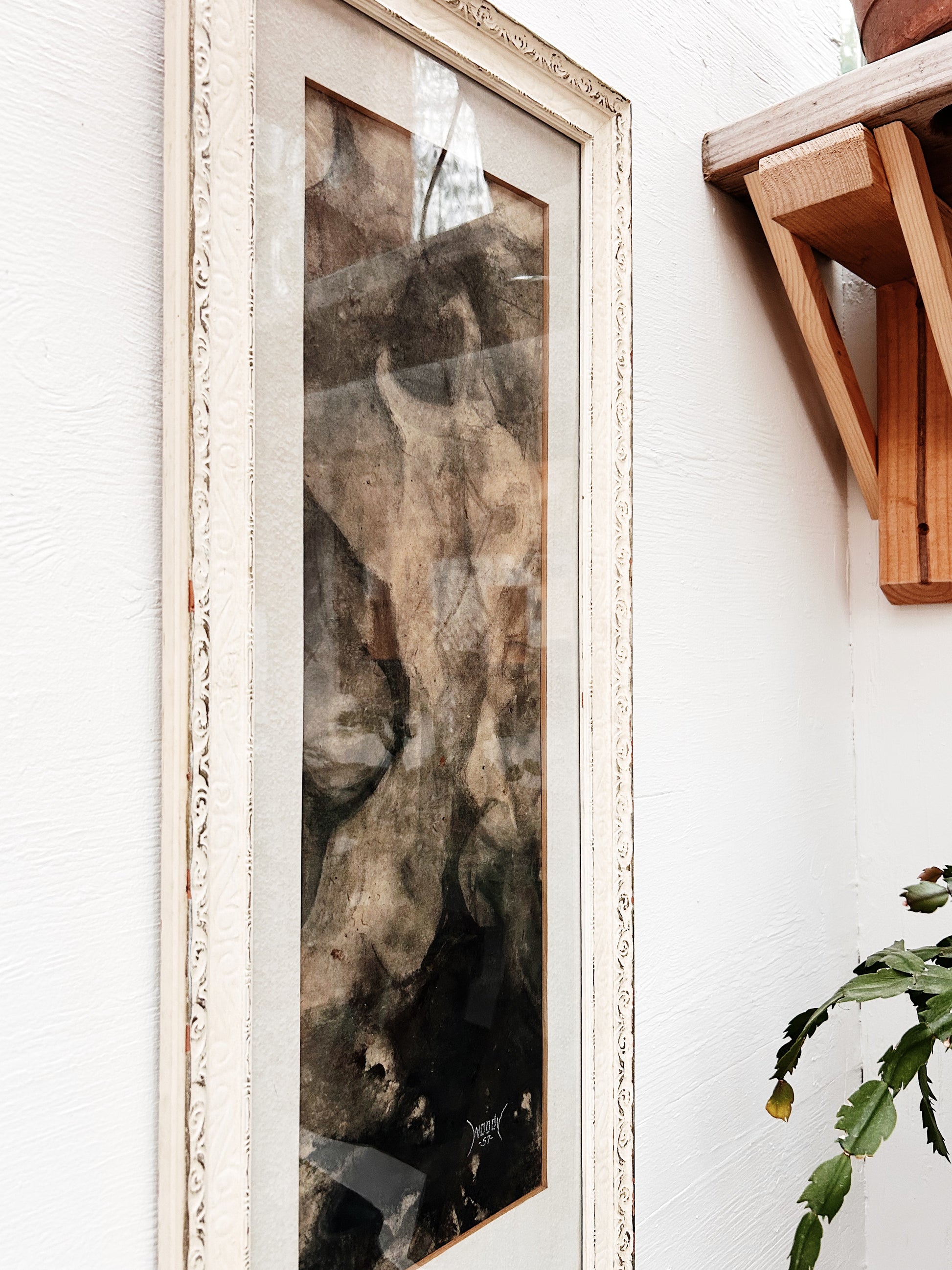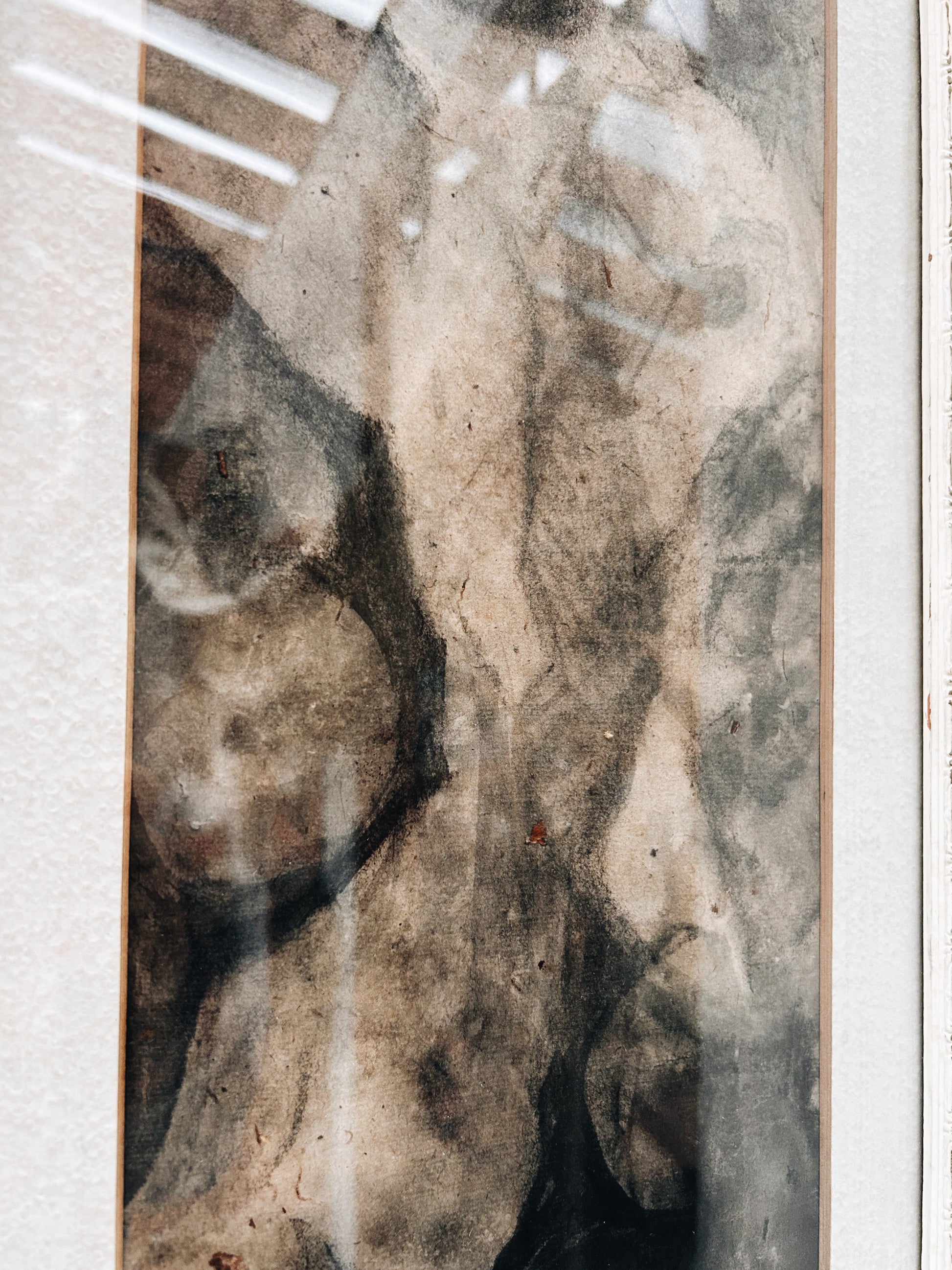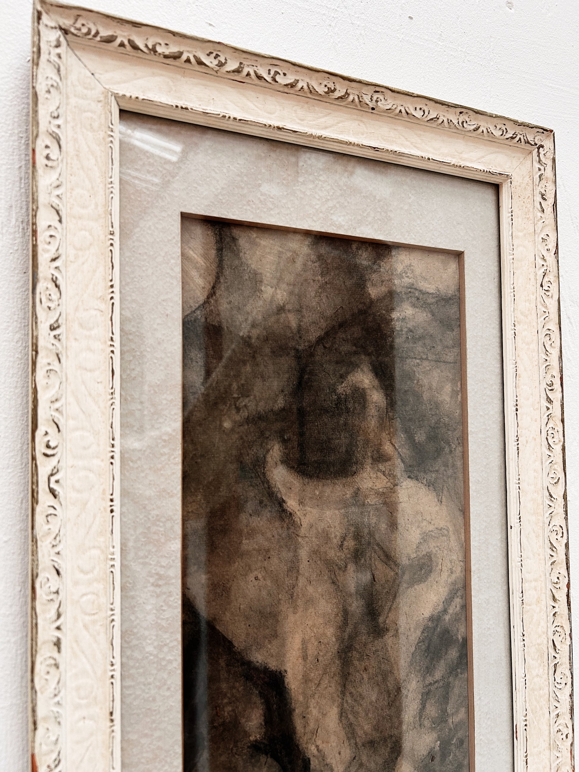 Woody Tallman ethereal smoke like painting. Watercolor and ink on board presented in an antique wood frame under wavy old glass. Signed, 1957.