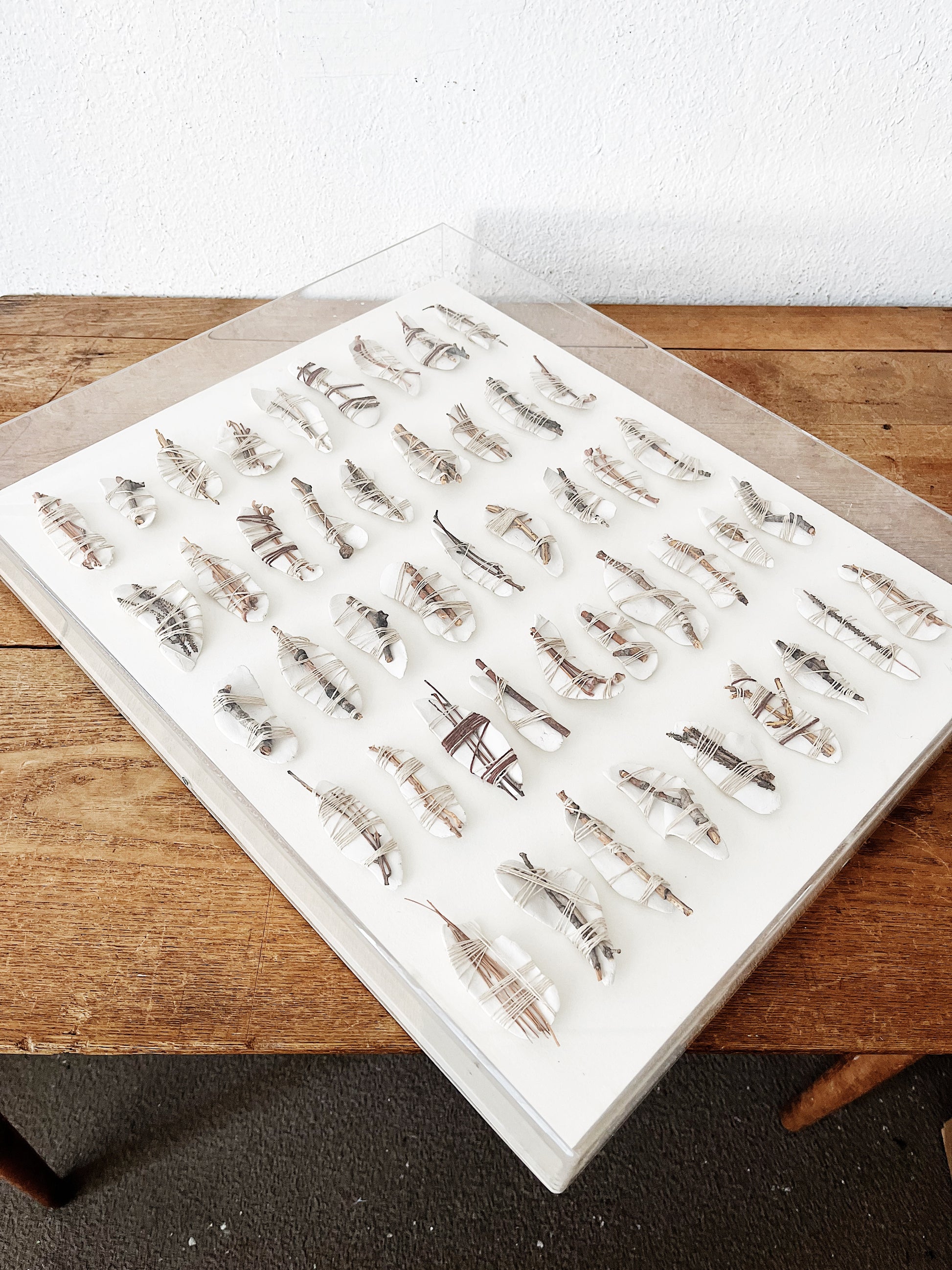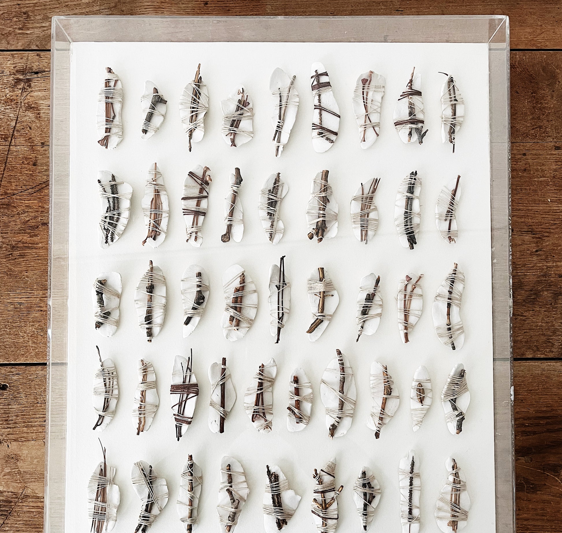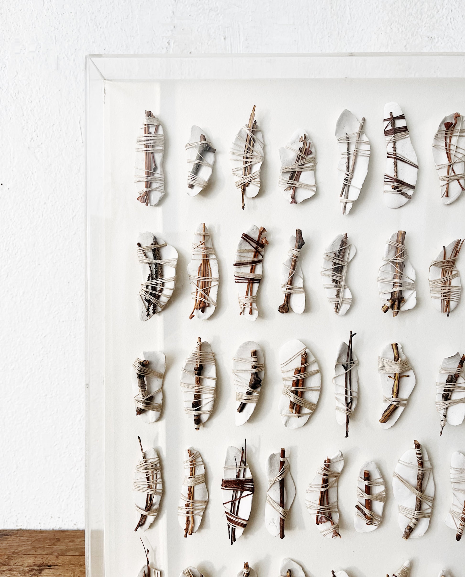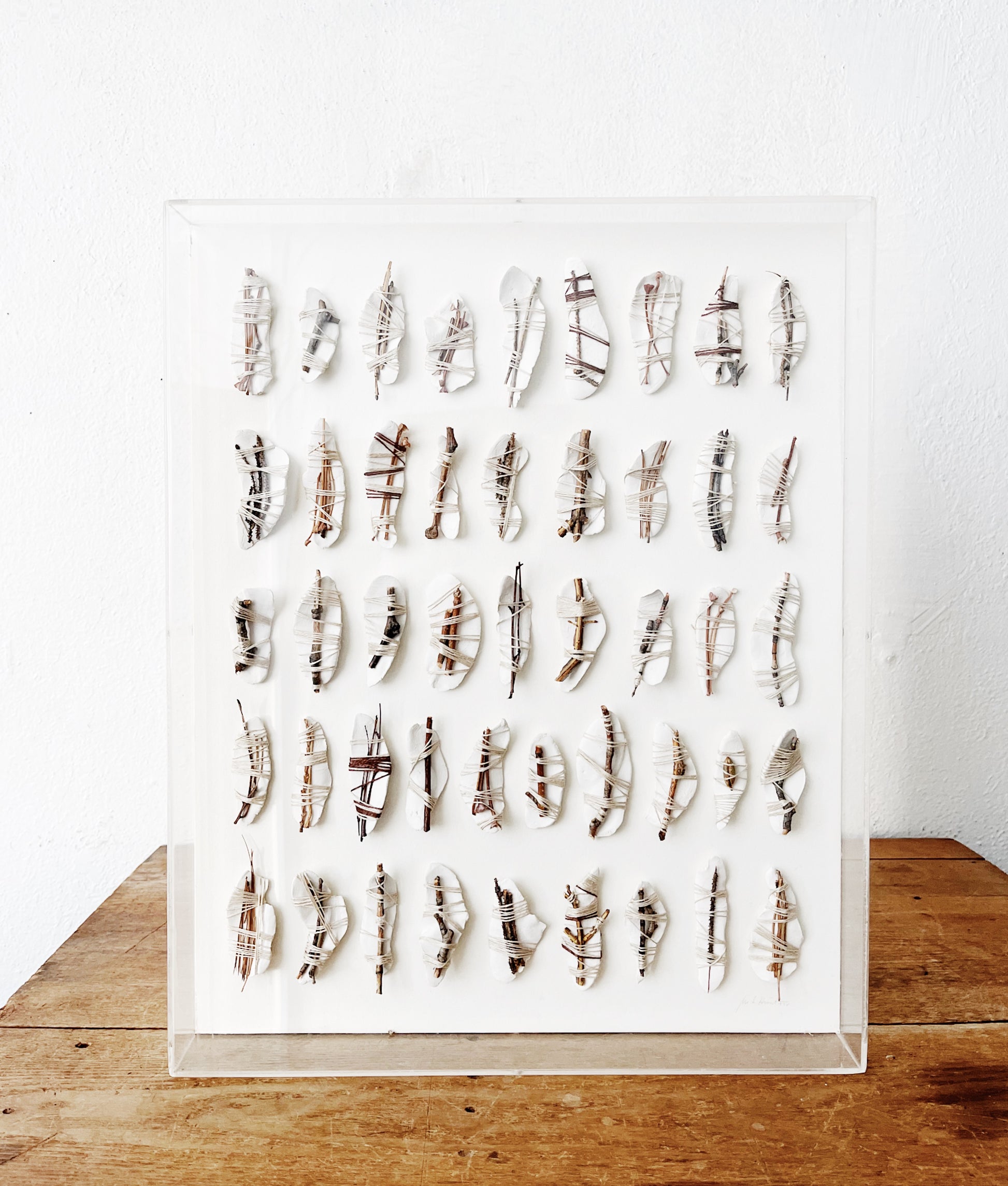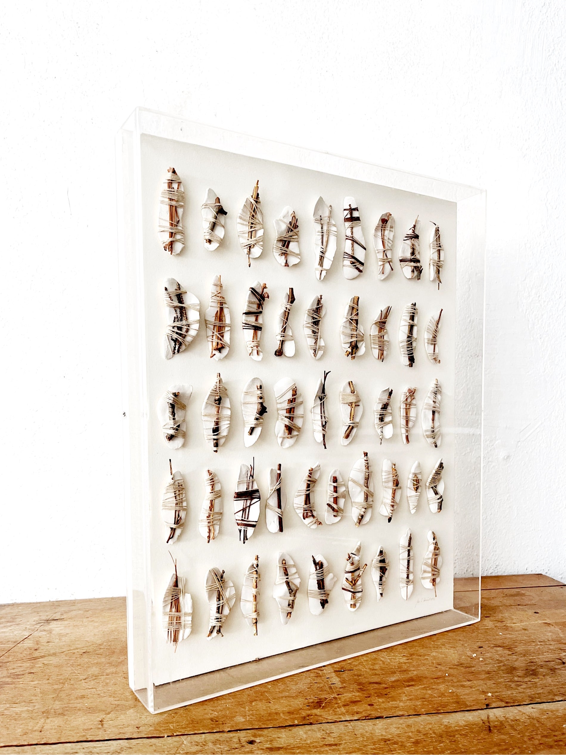 Beautiful organic based mixed media artwork. Ceramic leaves tied with jute string and branch. Framed in a thick plexi Shadowbox. Signed and dated 1978