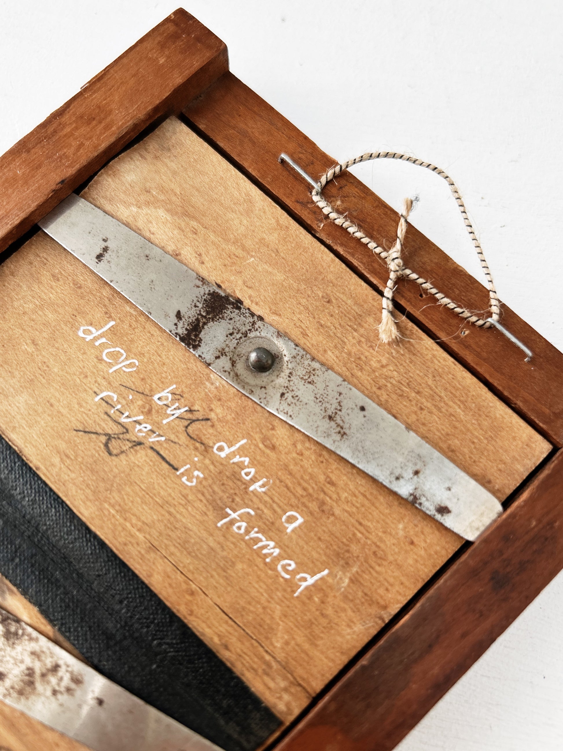 This is an original and part of a collection of abstract collages titled 'Drop by drop, a river is formed'. You may find scraps of drawings or photographs, threads and fabric. Look deeply. Framed in antique wooden glass negative plates