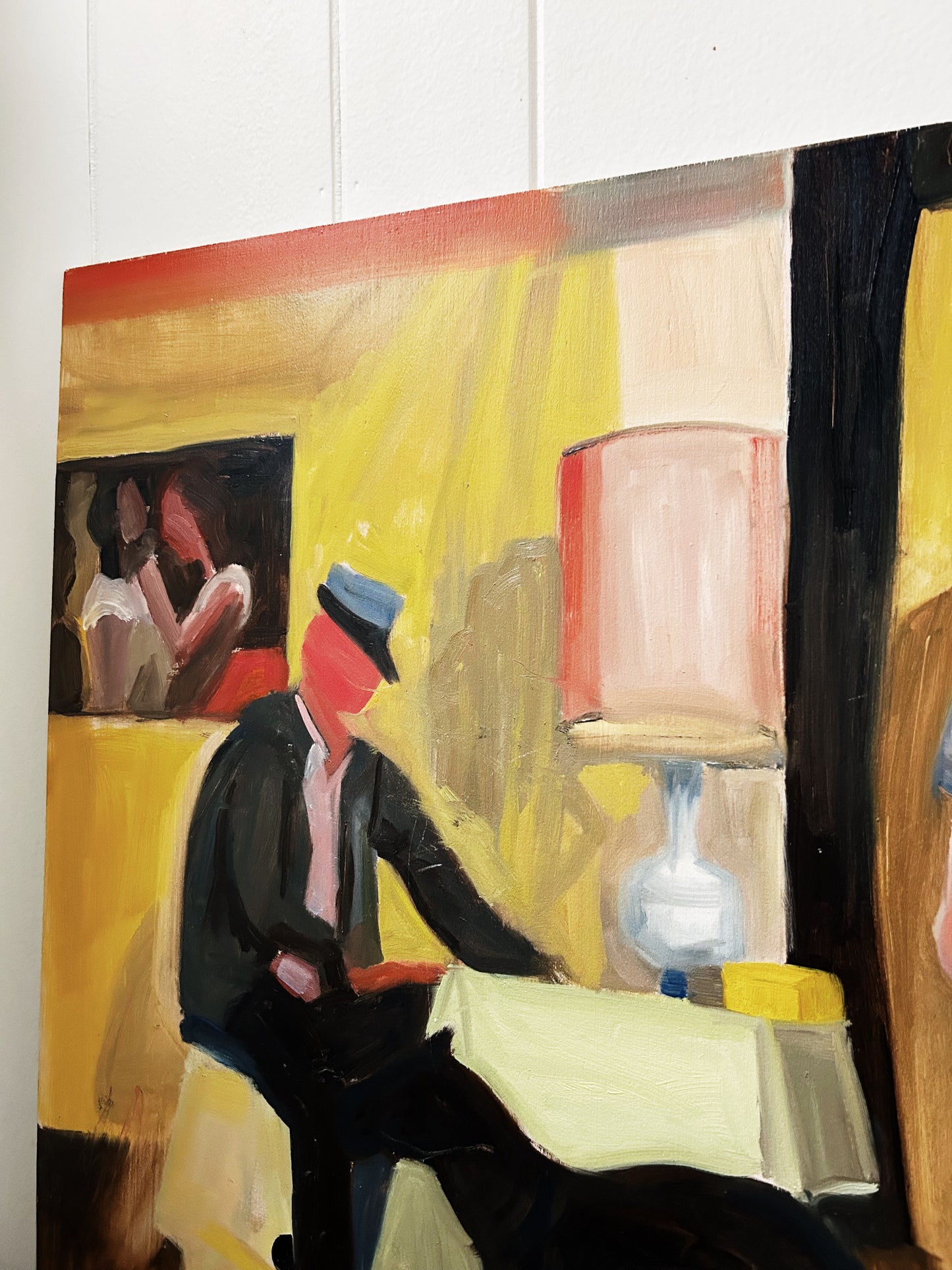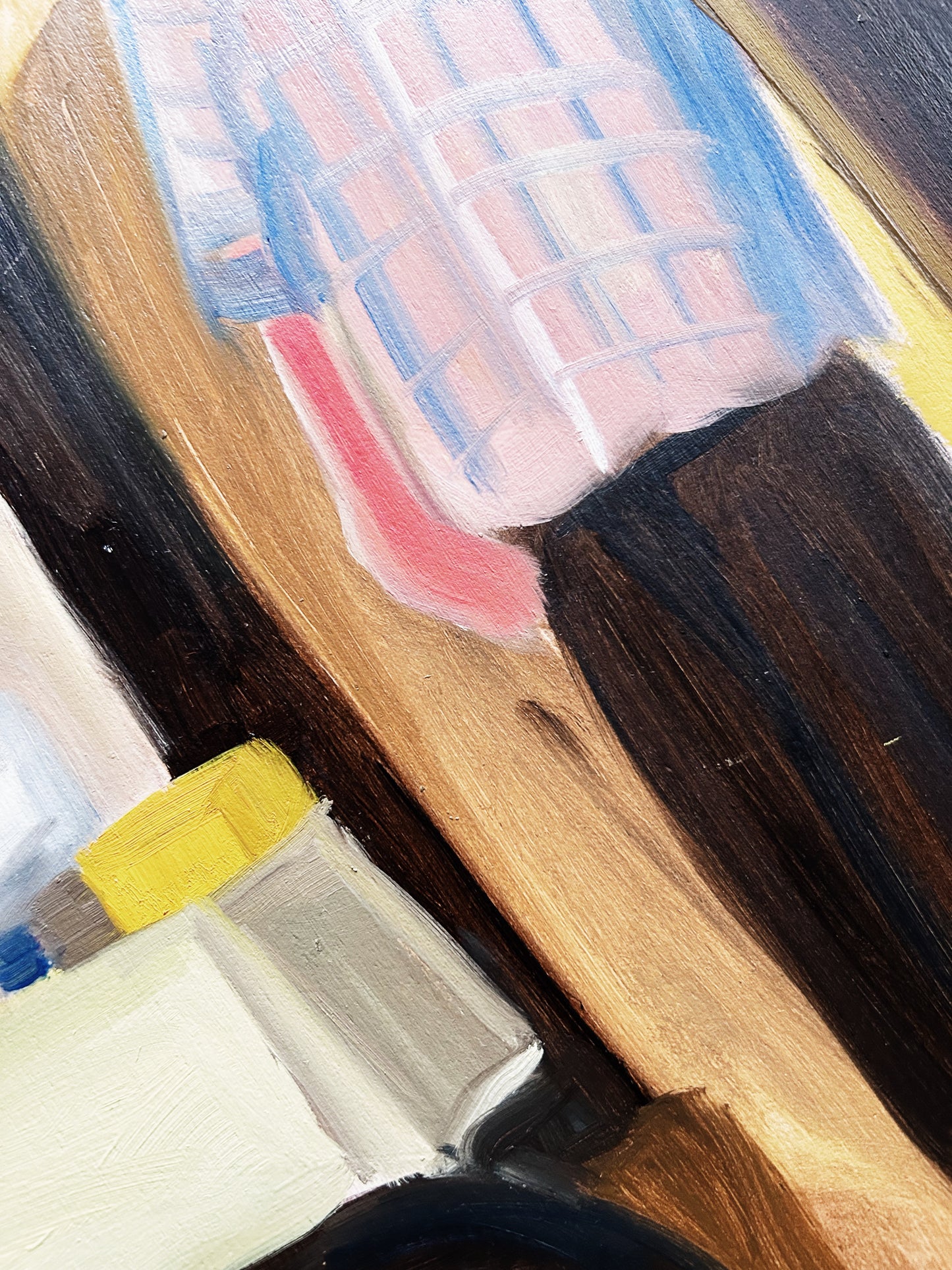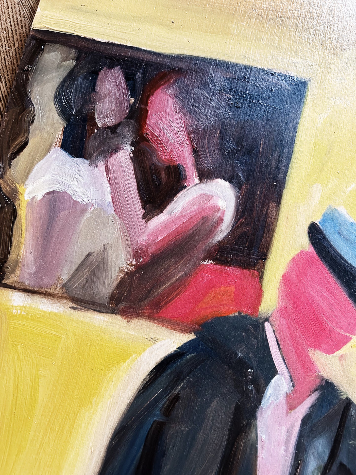 Picture in a picture in a picture. Dreamy colors. Blocky fauvism throughout. Oil on board