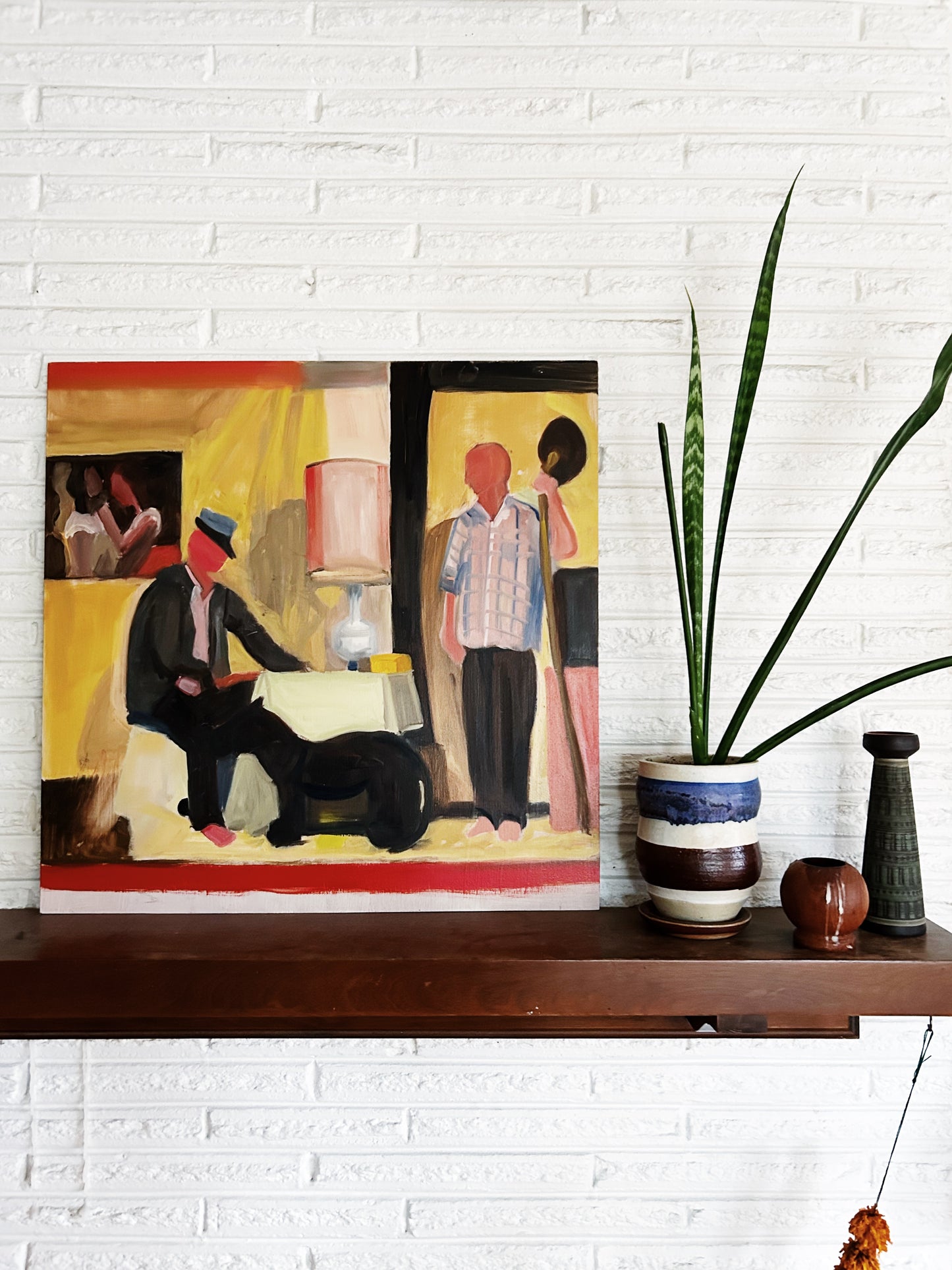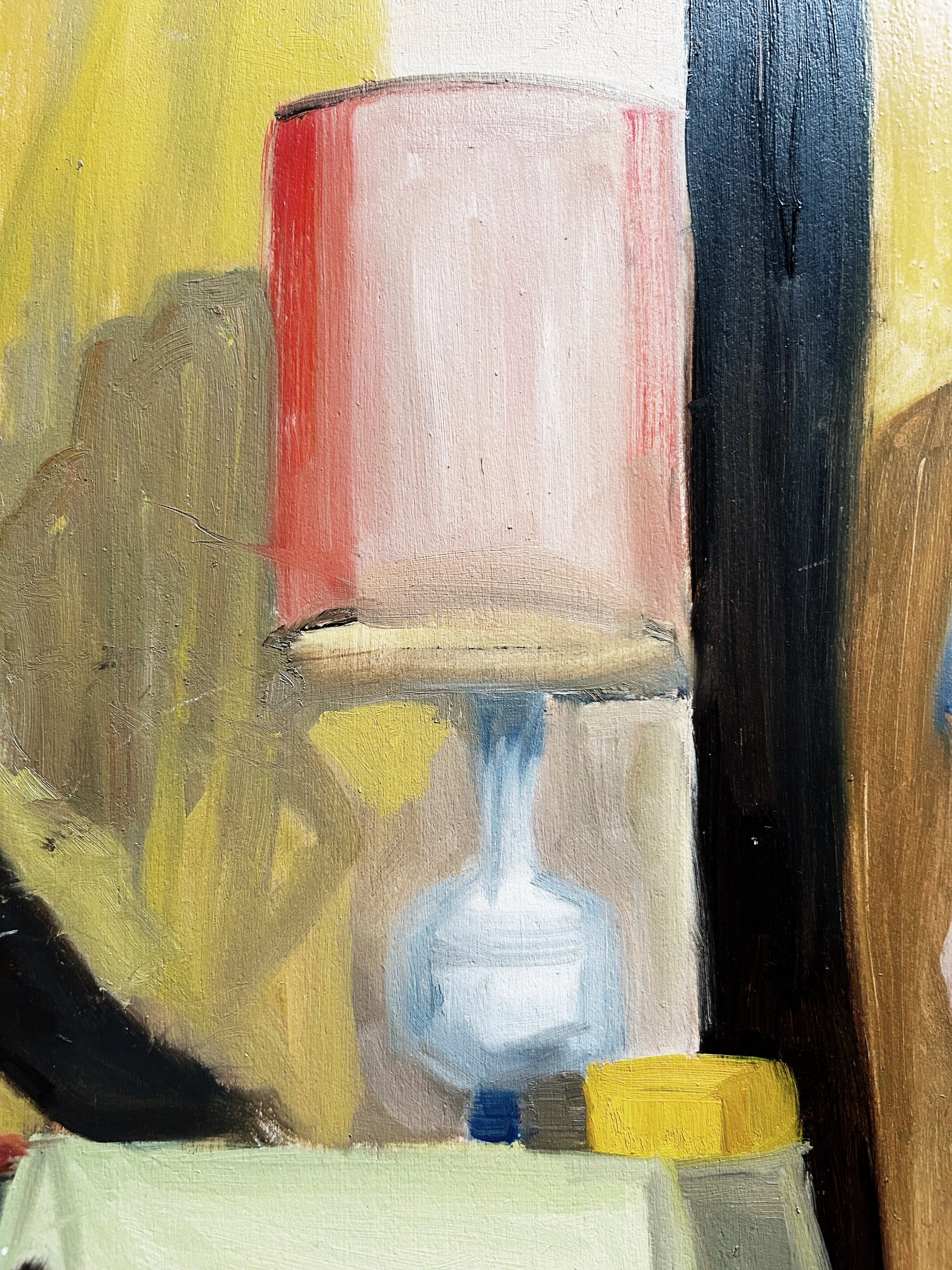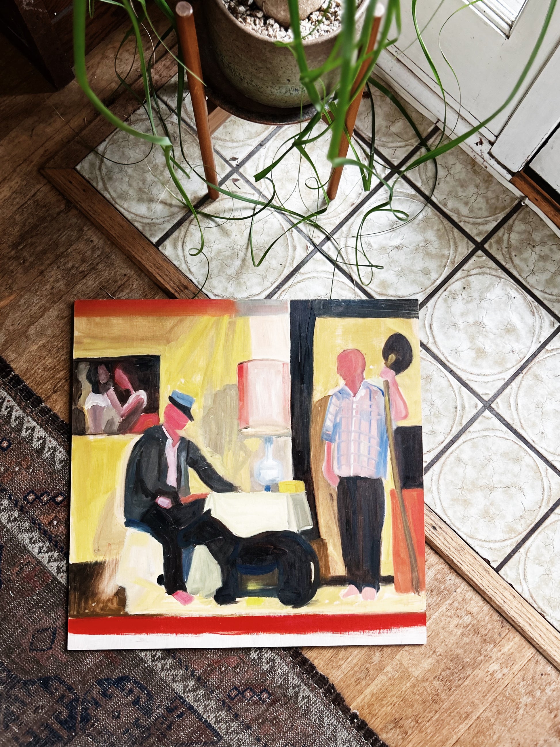 Picture in a picture in a picture. Dreamy colors. Blocky fauvism throughout. Oil on board