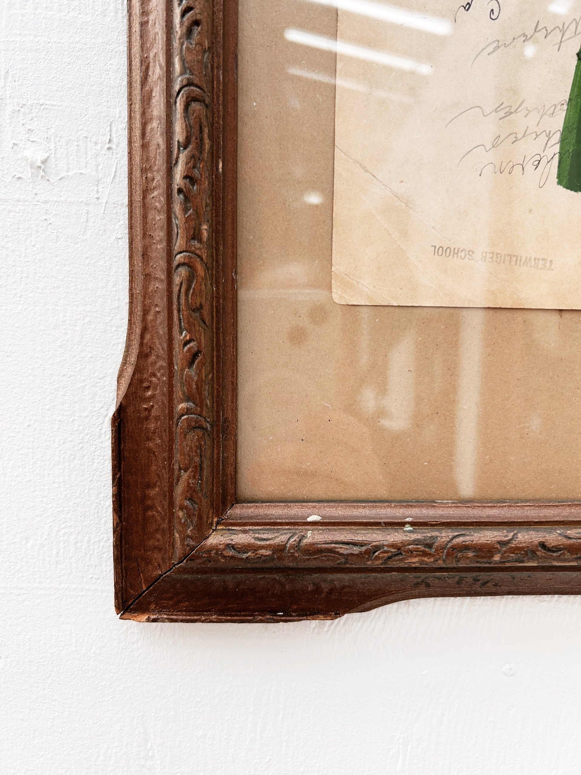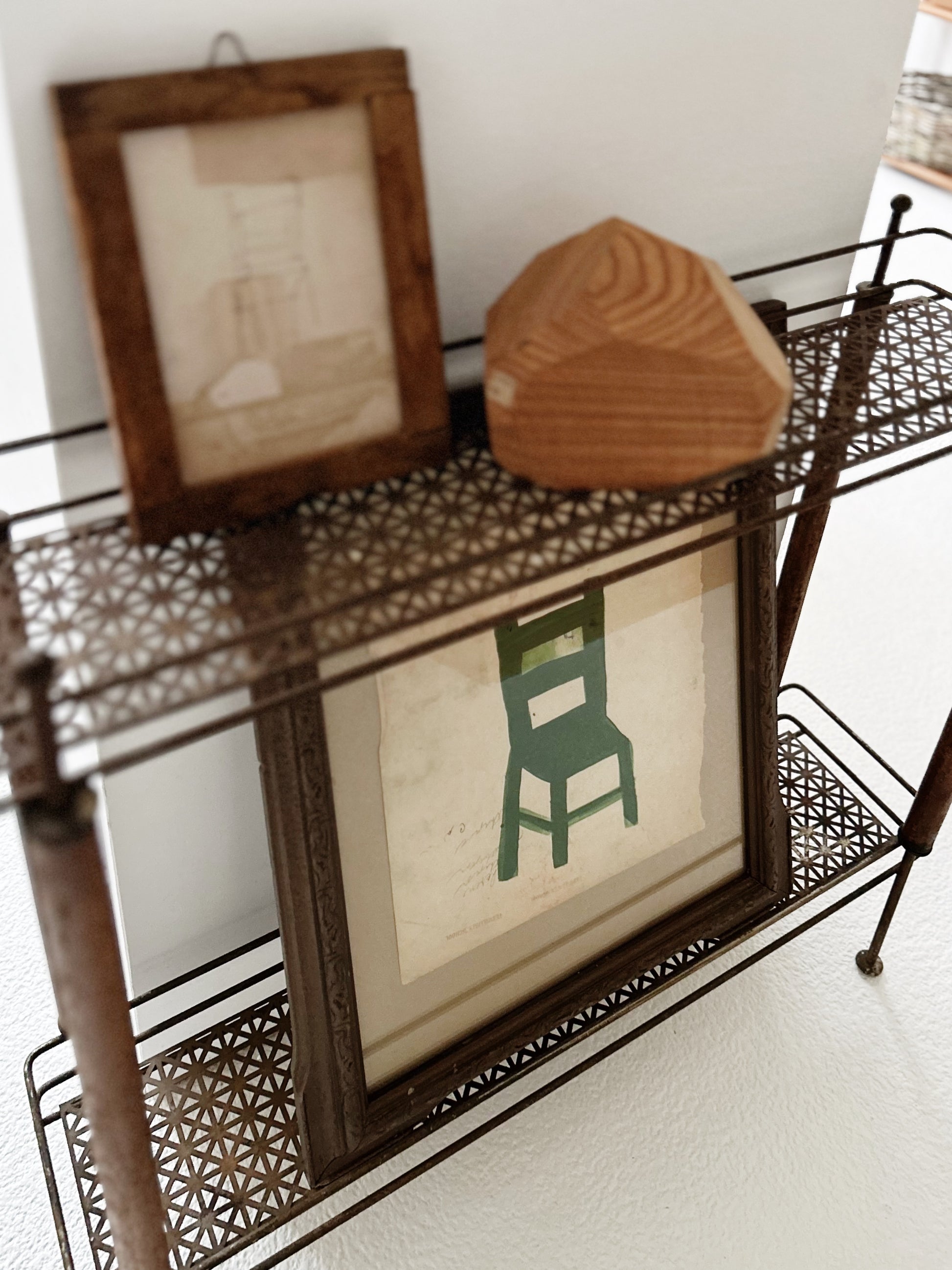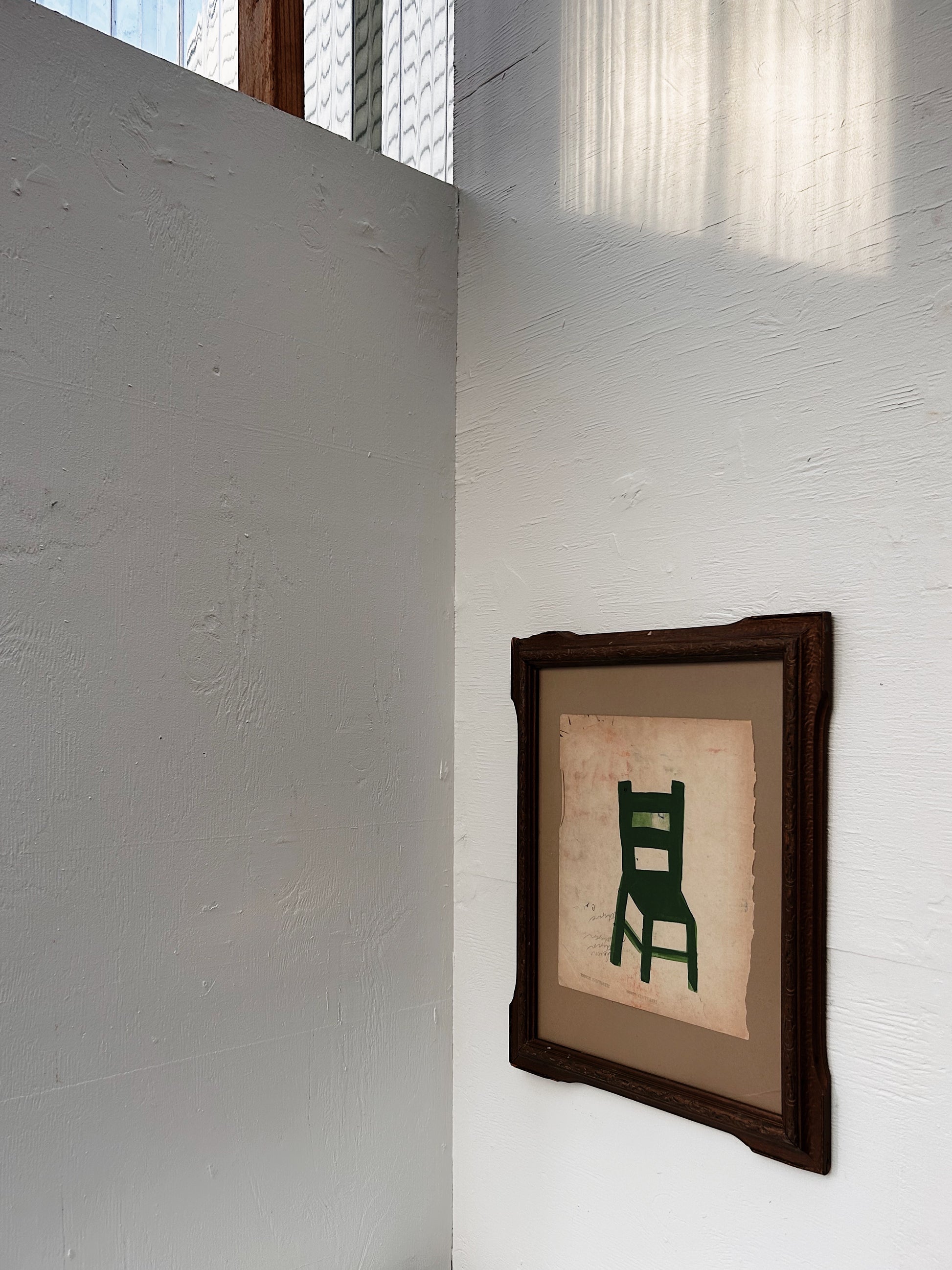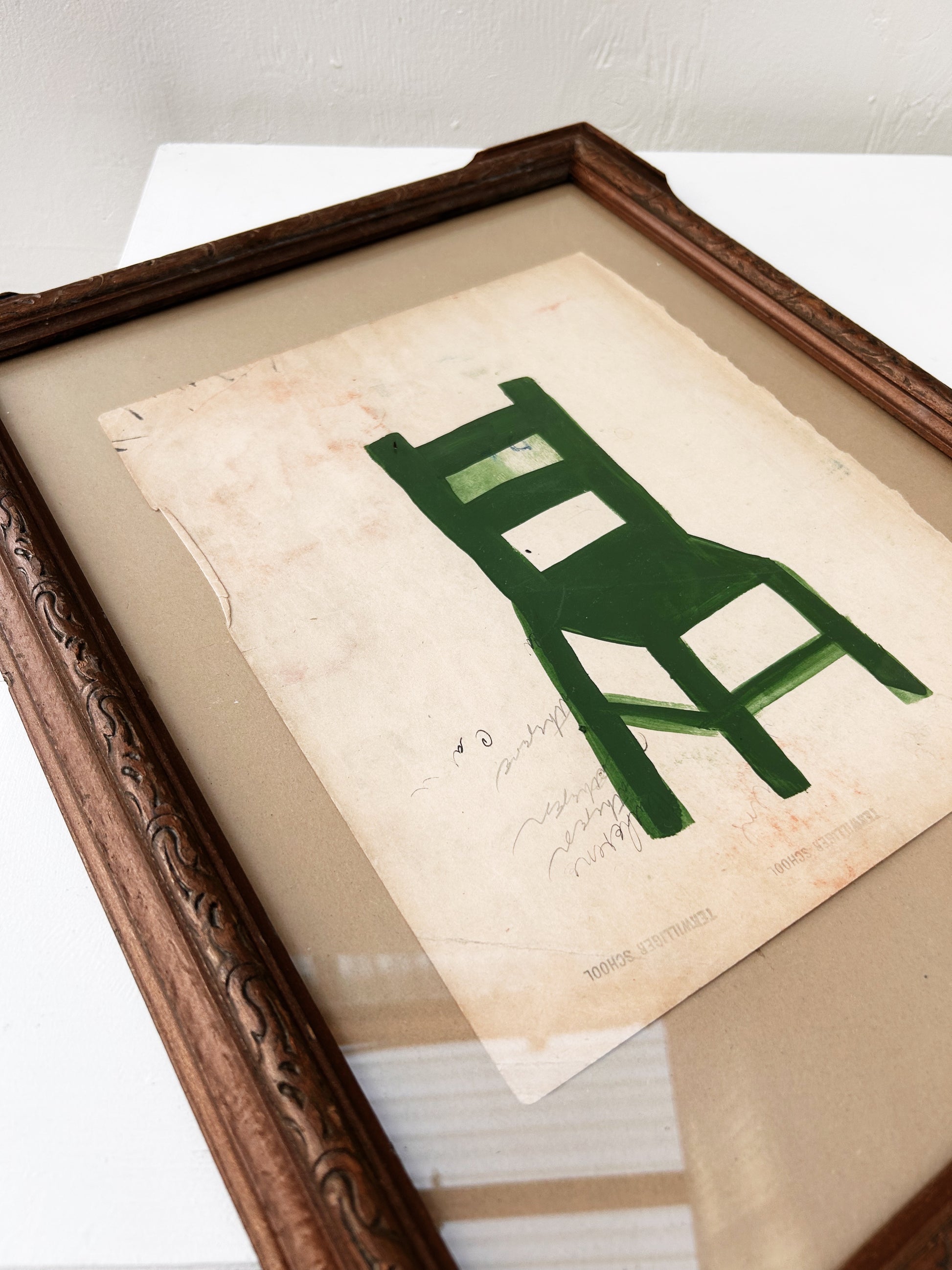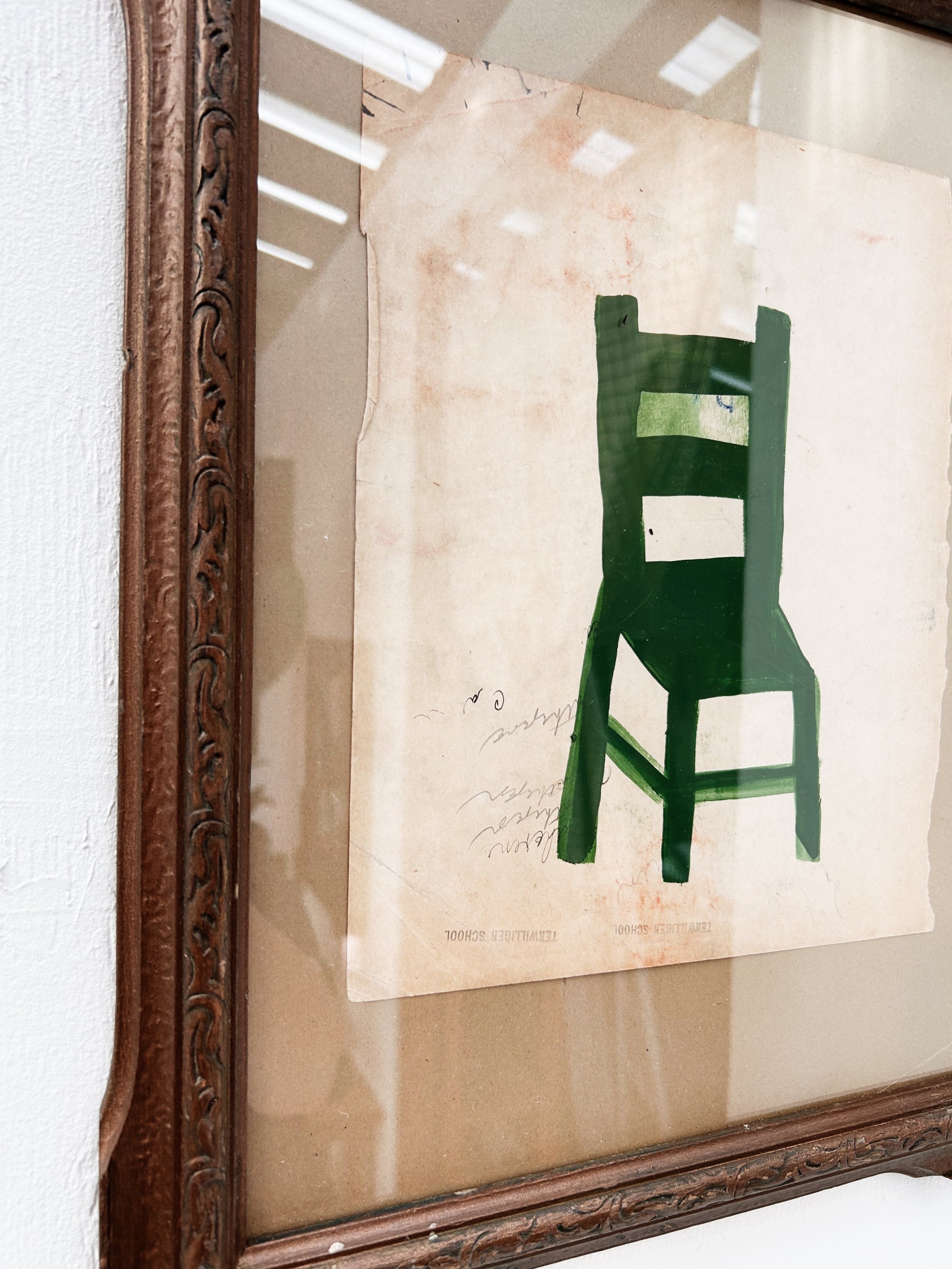 This is an original and part of a collection of chairs done in various mediums. This, paint and old paper. Framed under glass in antique wood frame