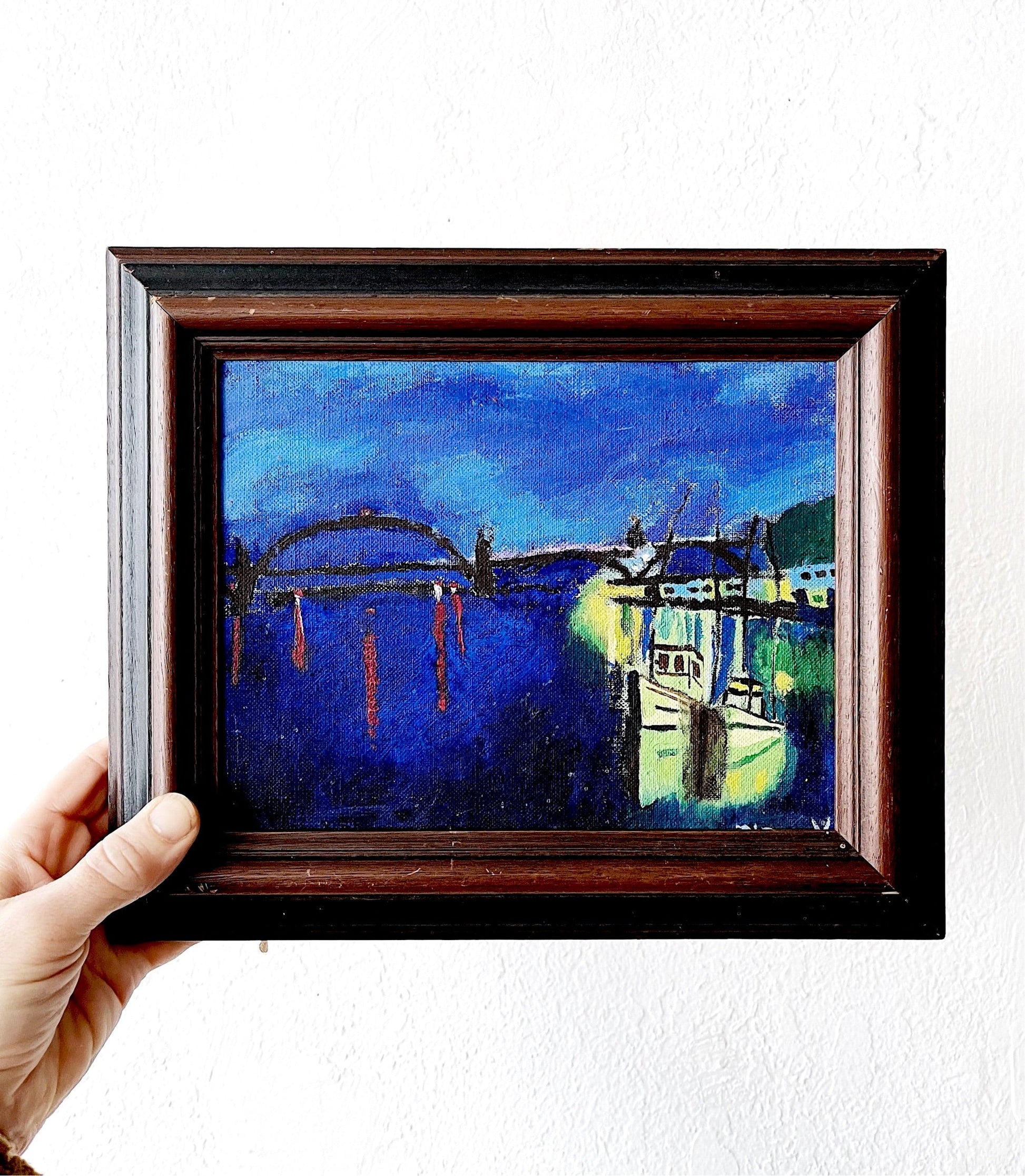 Portland’s iconic St John’s bridge at night, waterfront ships. Acrylic on canvas board, framed in wood. Signed below the frame margin