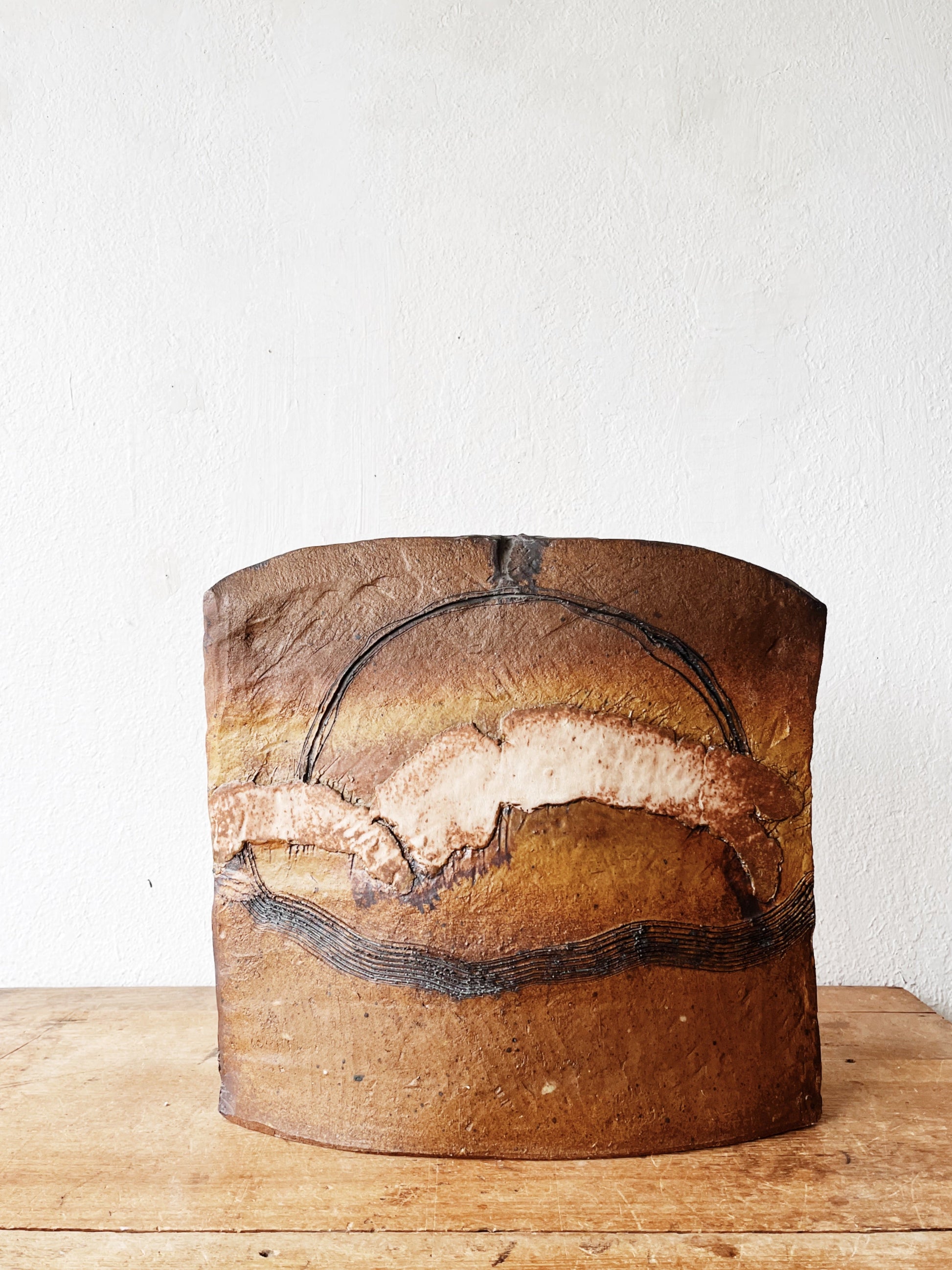 Beautiful abstract ceramic sculpture by Marie Gregory. Most likely form the 1960s. Abstract with a vague landscape composition… perhaps alluding to her treasured home on the Oregon coast. Unique shape and oversized. Tape with ‘mrs william gregory’ is present inside. She was the wife of noted Oregonian Bill Gregory but we could find little else about her.