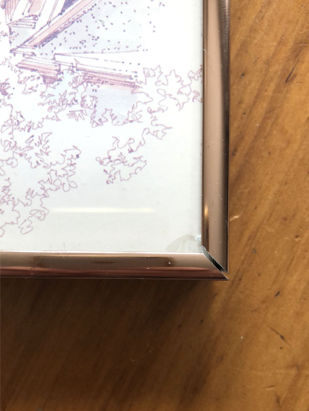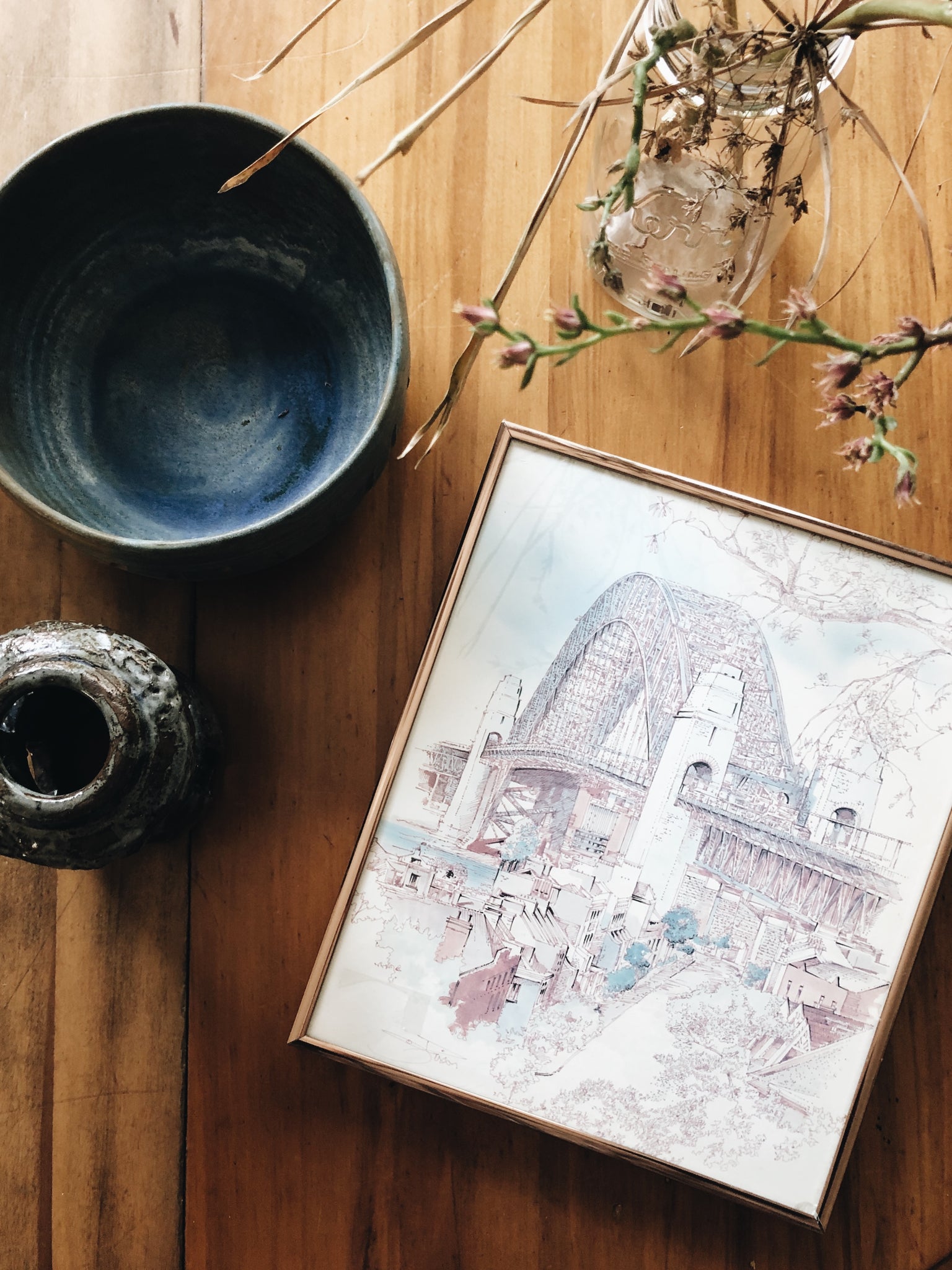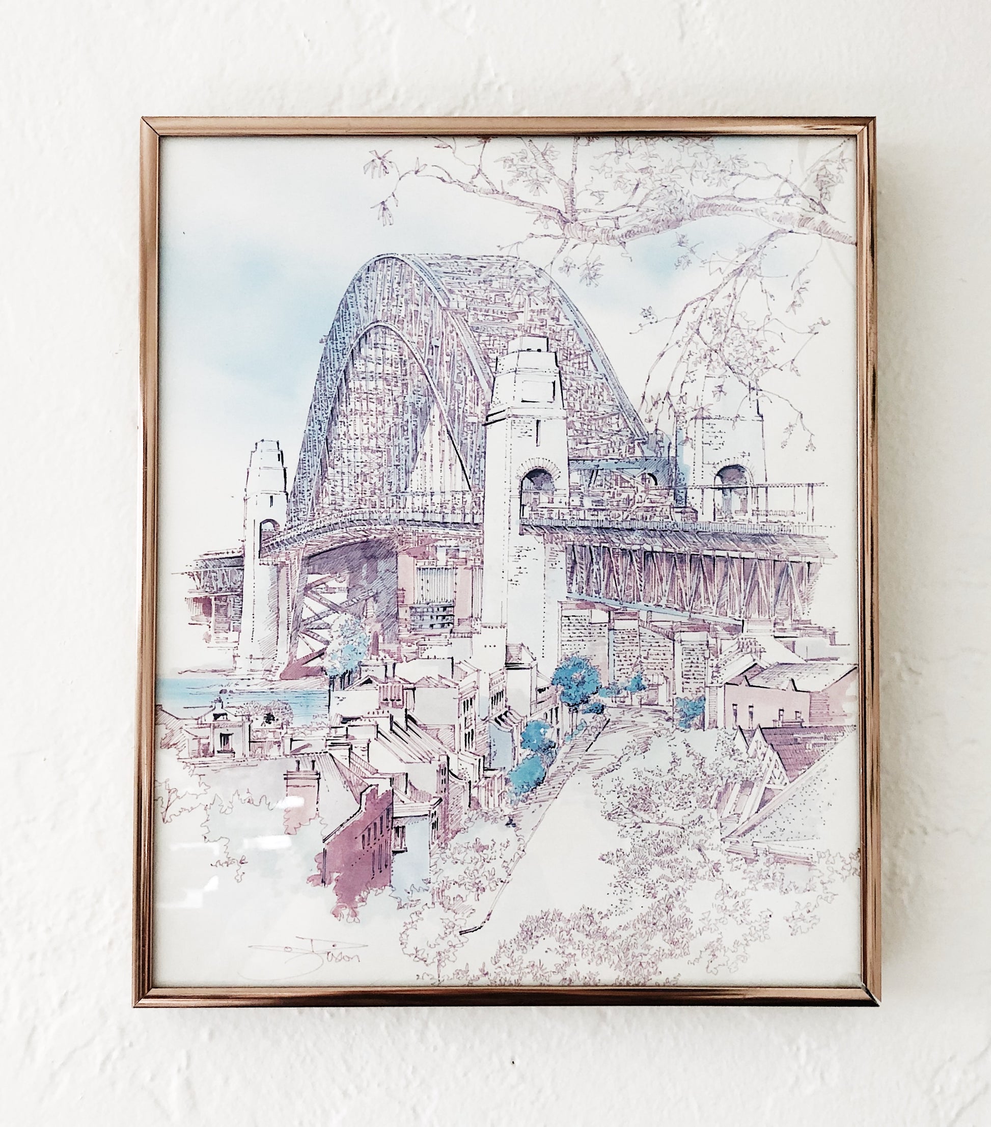 A charming print of an original drawing. Sydney Harbour Bridge, Australia. Signed and framed under glass in rose gold metal. Small flaw at corner