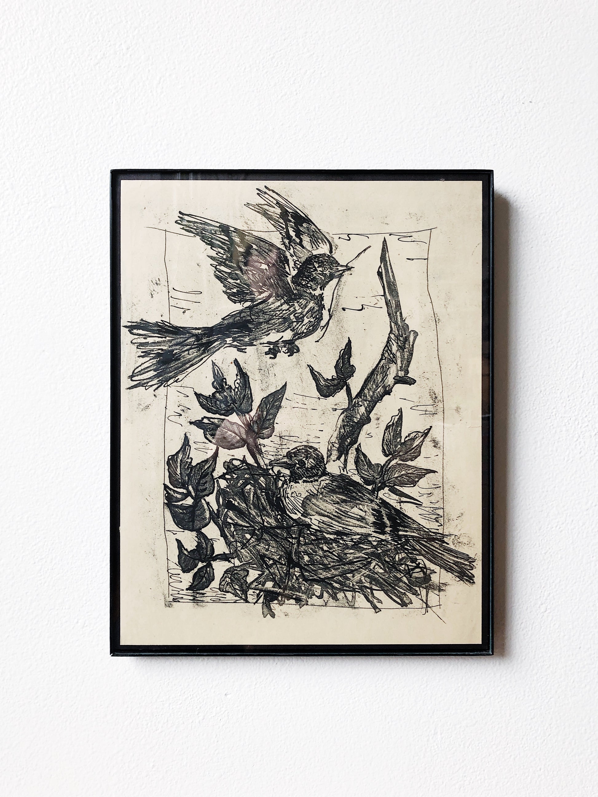 A beautifully drawn original vintage artwork rendered in charcoal. Pretty scene with birds in the trees...Spring is just around the corner! Framed in a simple glass clip frame
