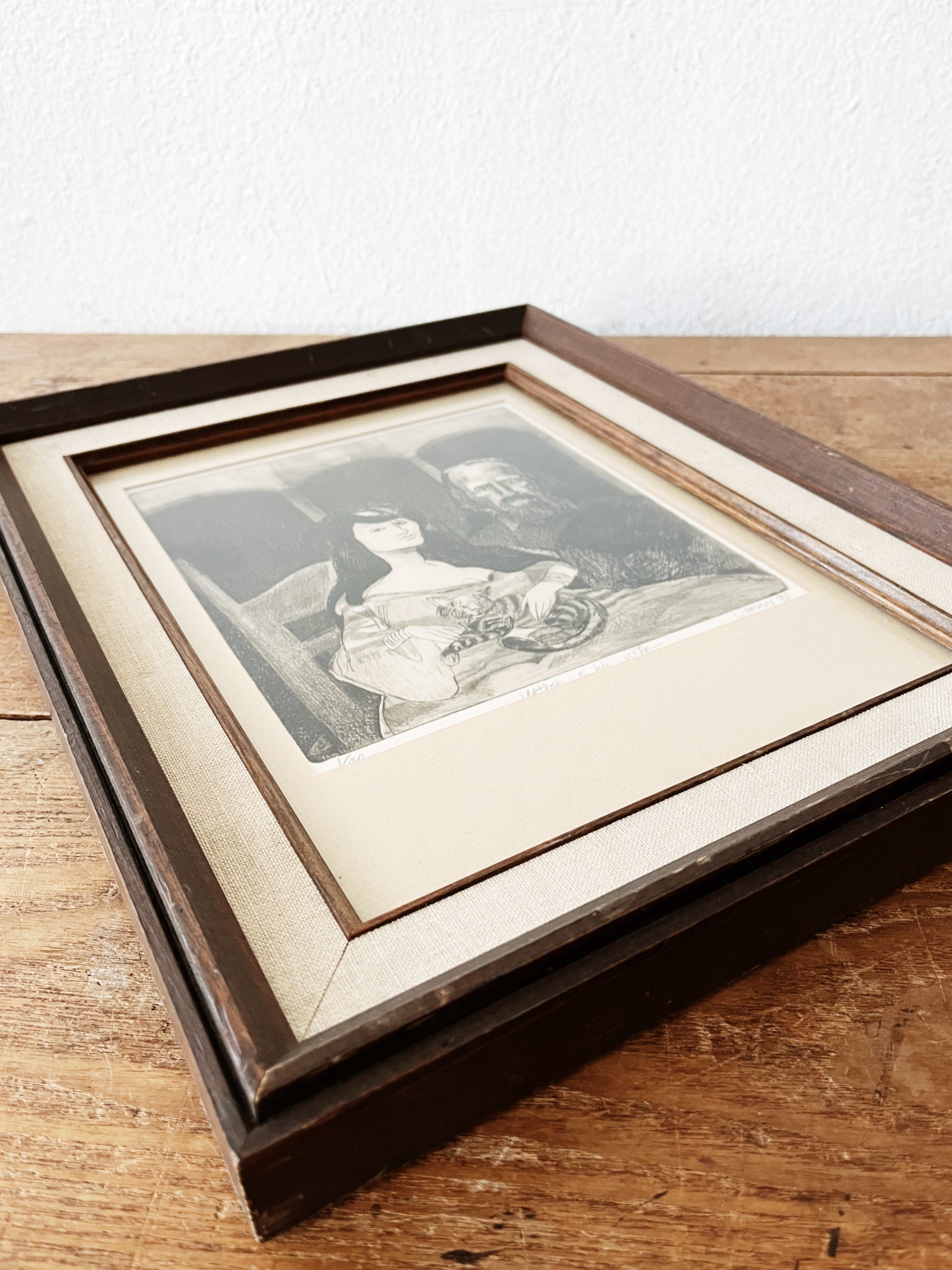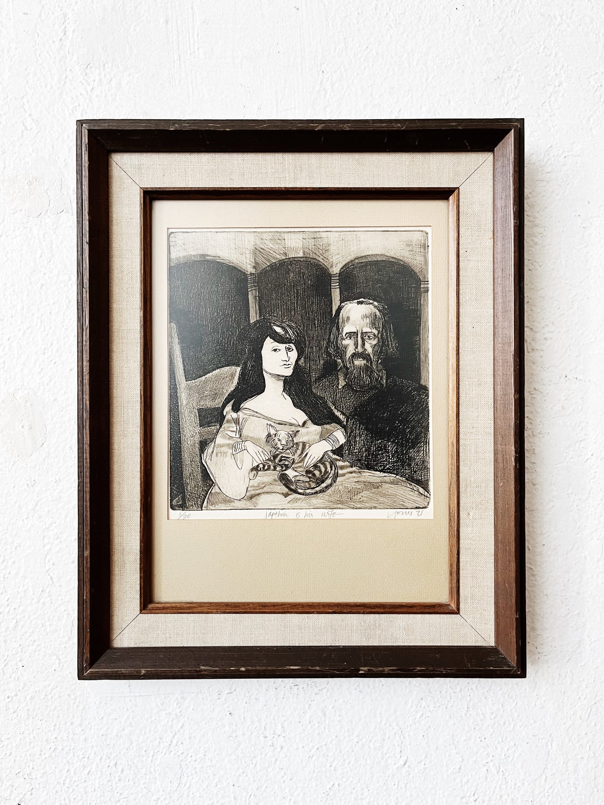 Original etching ‘Japtheh and his Wife’. Number 1 of 20. Dated 1975 and signed L Jones. Framed under non glare glass in a vintage wood and linen frame