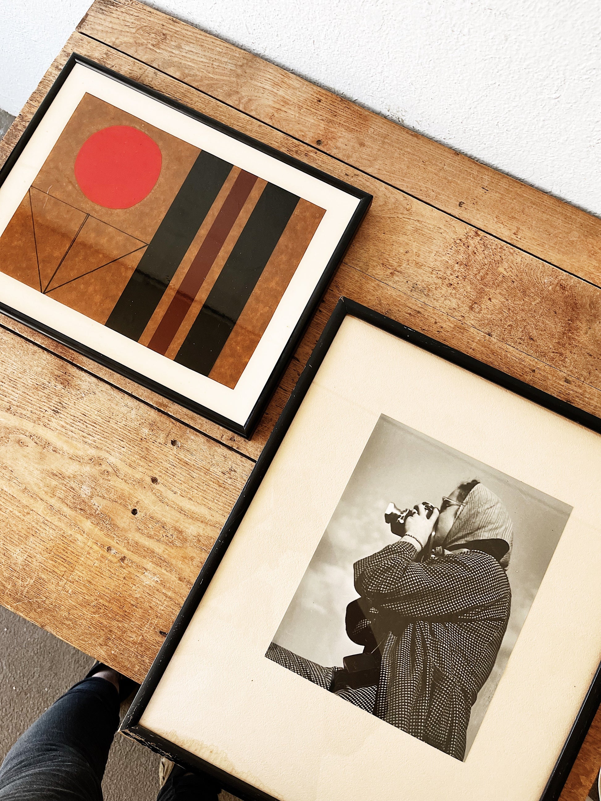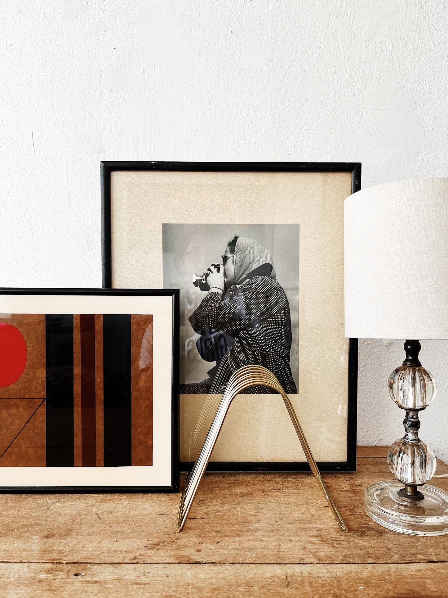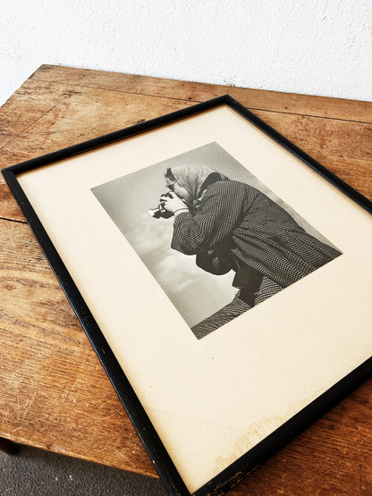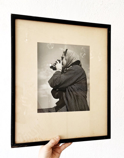 Old film photo of a gal with her vintage camera. Nice graphic quality with the polka dots and black and white film. Framed in simple black wood under glass.