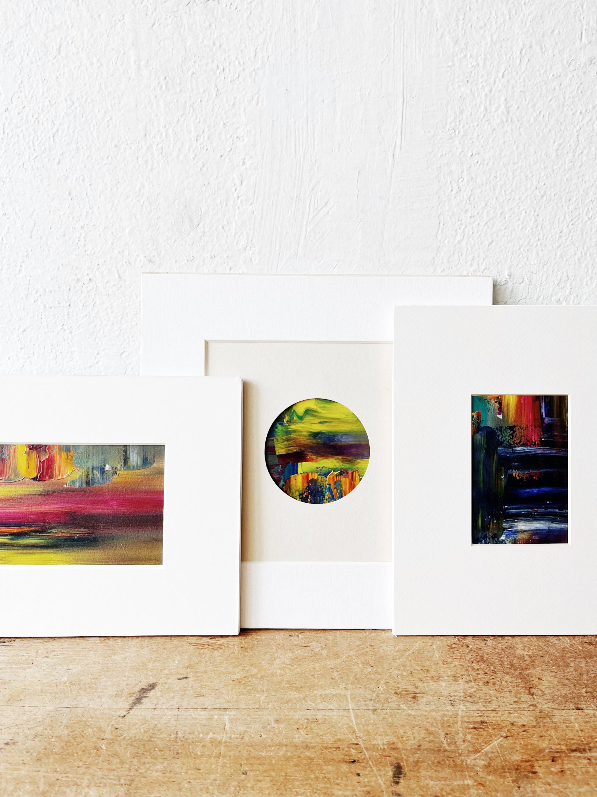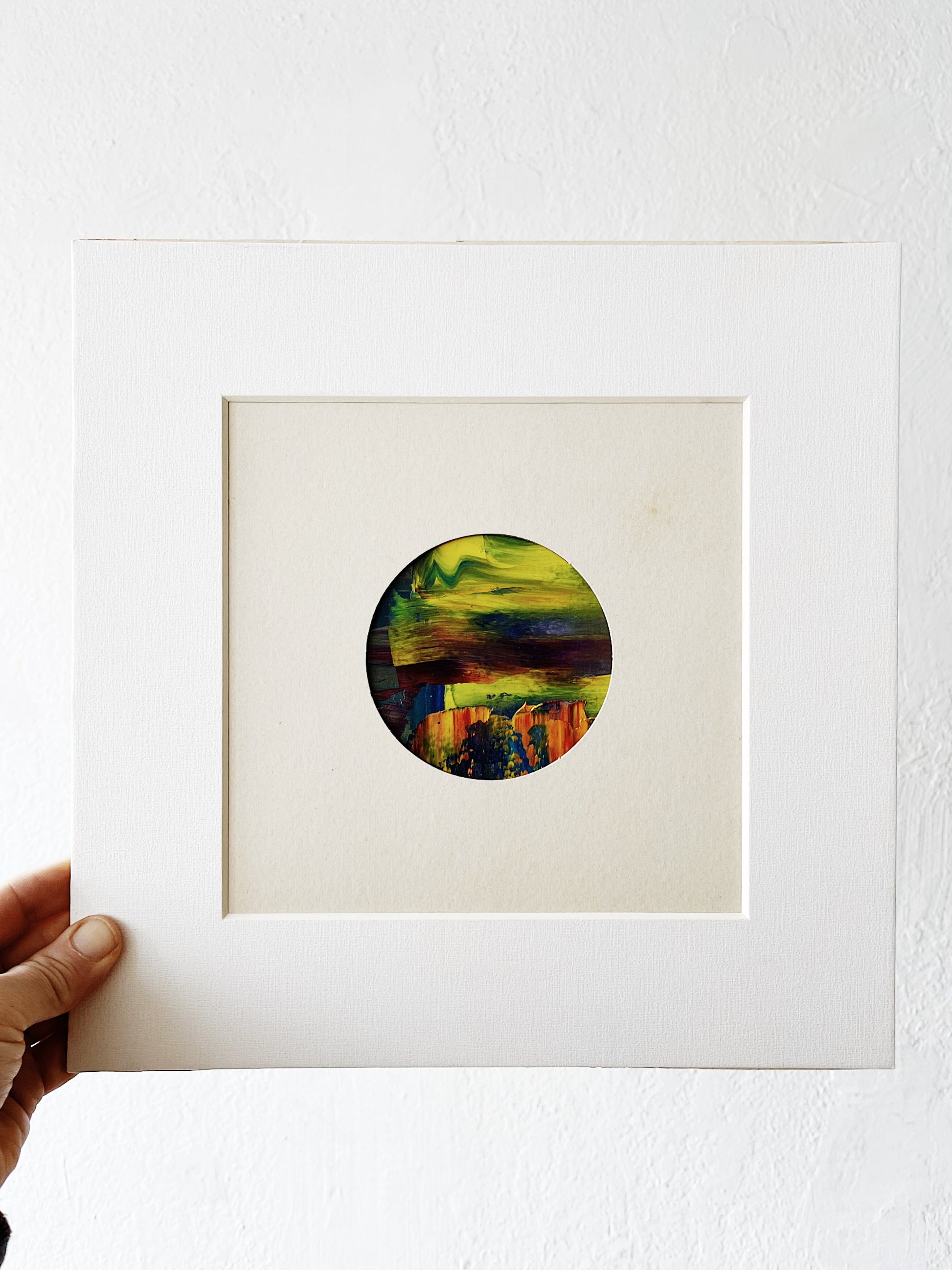 Original work, oil on canvas and matted in thick art board. Layered warm tones. The paint colors are deep, moody and cheerful all at once. Evidence of thick paint strokes are a lovely detail. Display in any orientation that suits you.