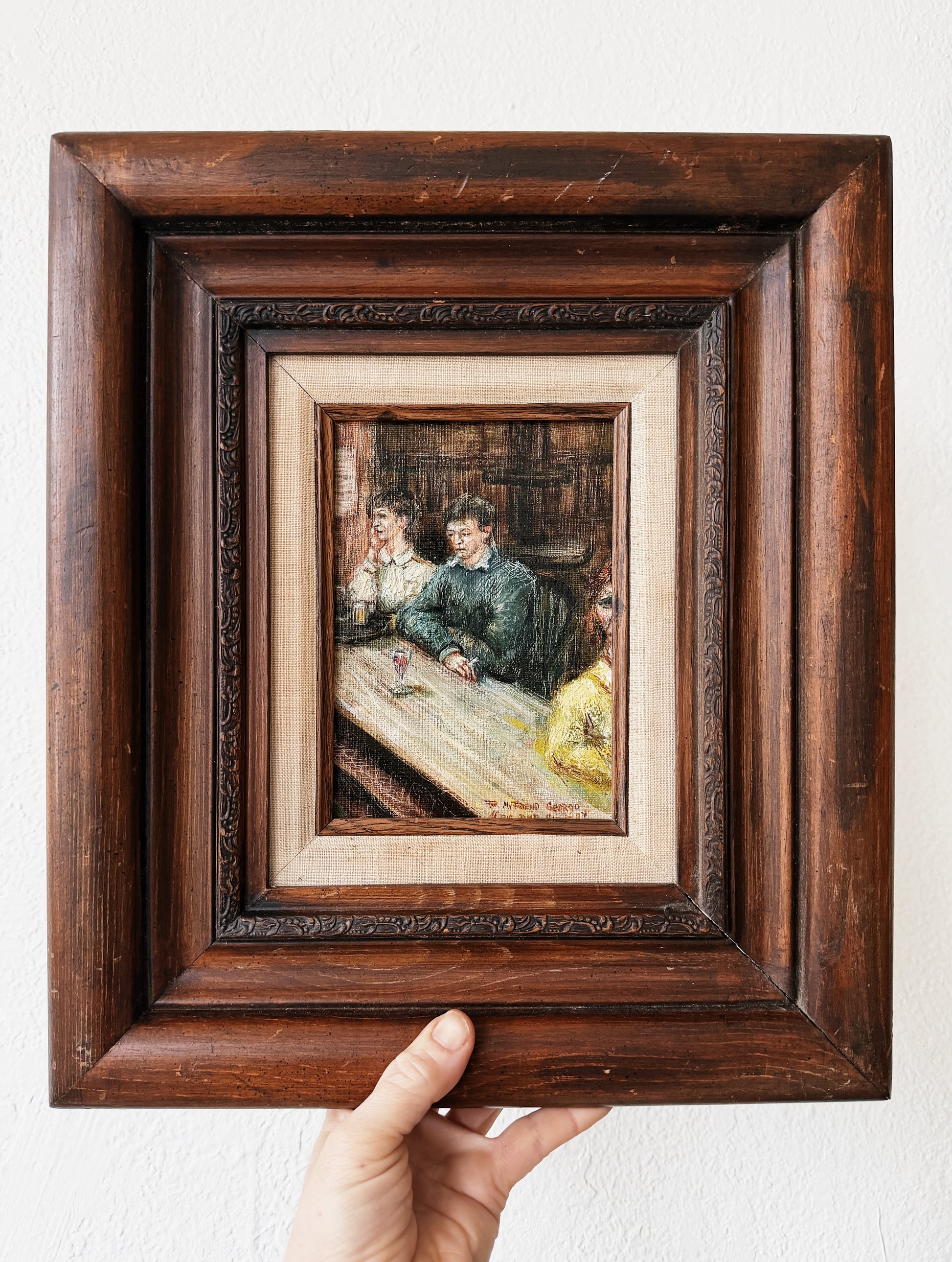 Original oil painting titled My Friend George 'The Bar Scene'. Intricately painted snapshot of a moment in time. Love the tiny bits of color that pop up here and there. Very charming. Presented in a thick carved wood frame from Mexico.