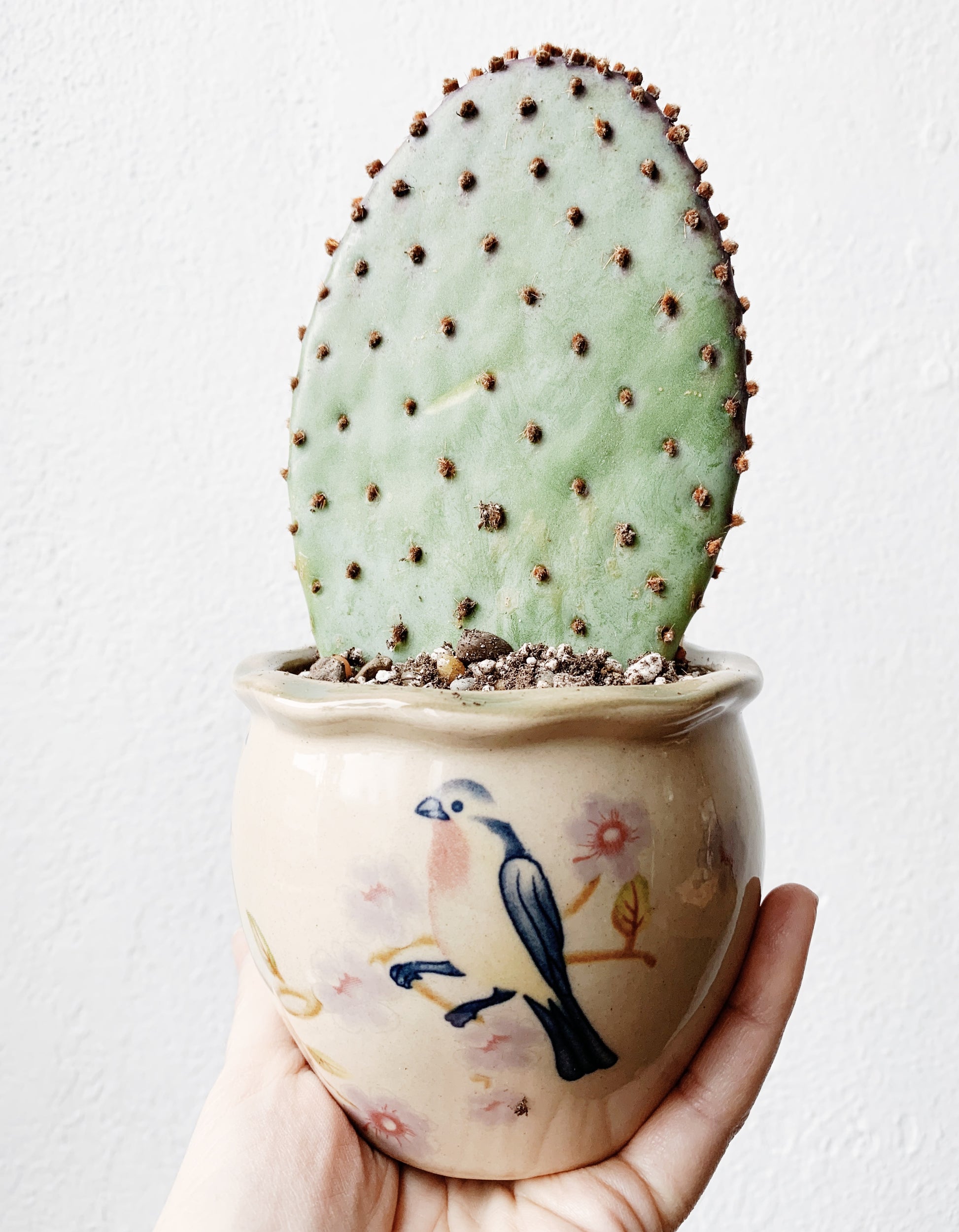 Happy prickly pear paddle cactus in a sweetly hand painted vintage pot.