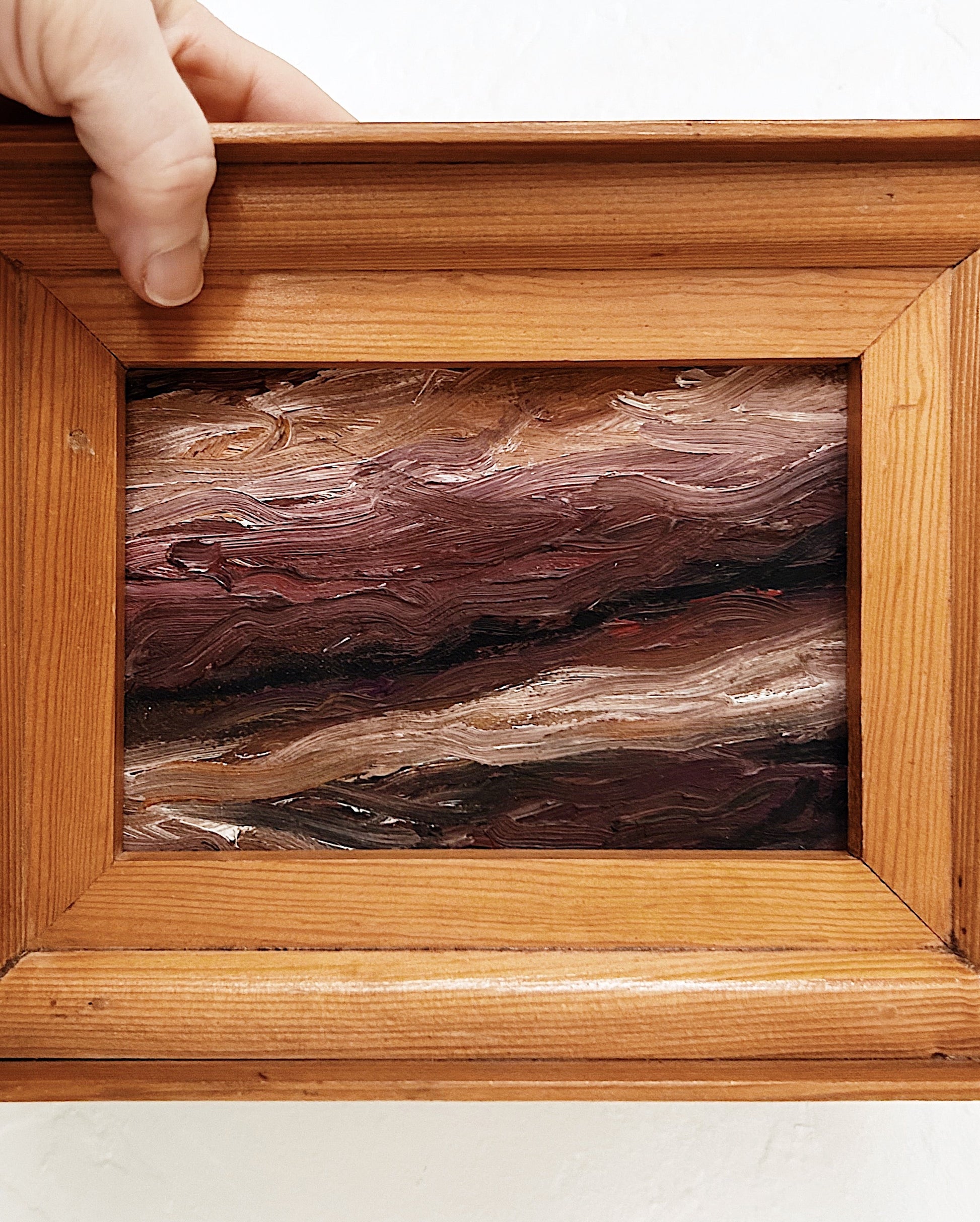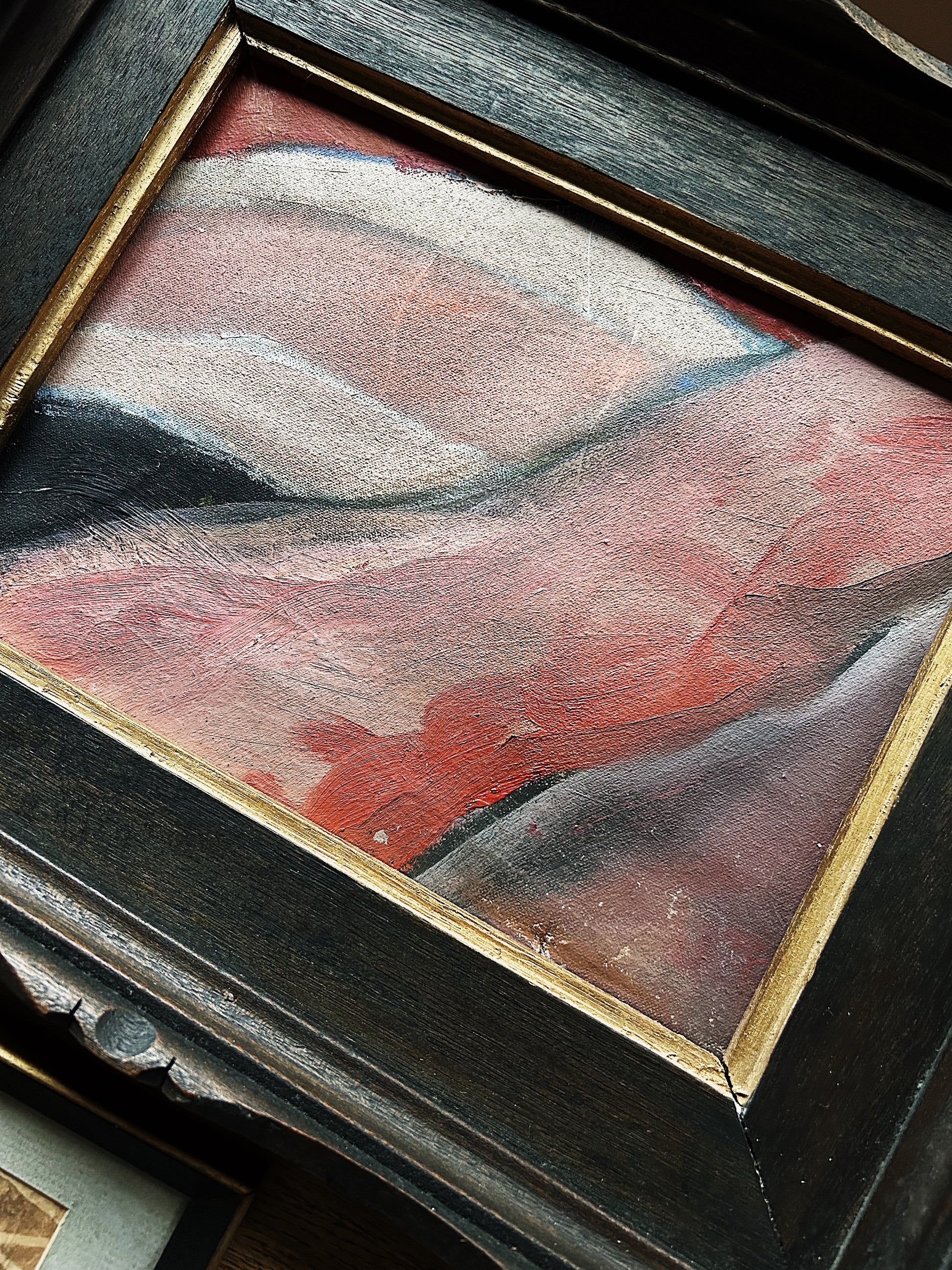 Two vintage abstracts done in oil on canvas. Varying hues of coral grounded by charcoal on one. Striations landscape of earthy colors on the other.