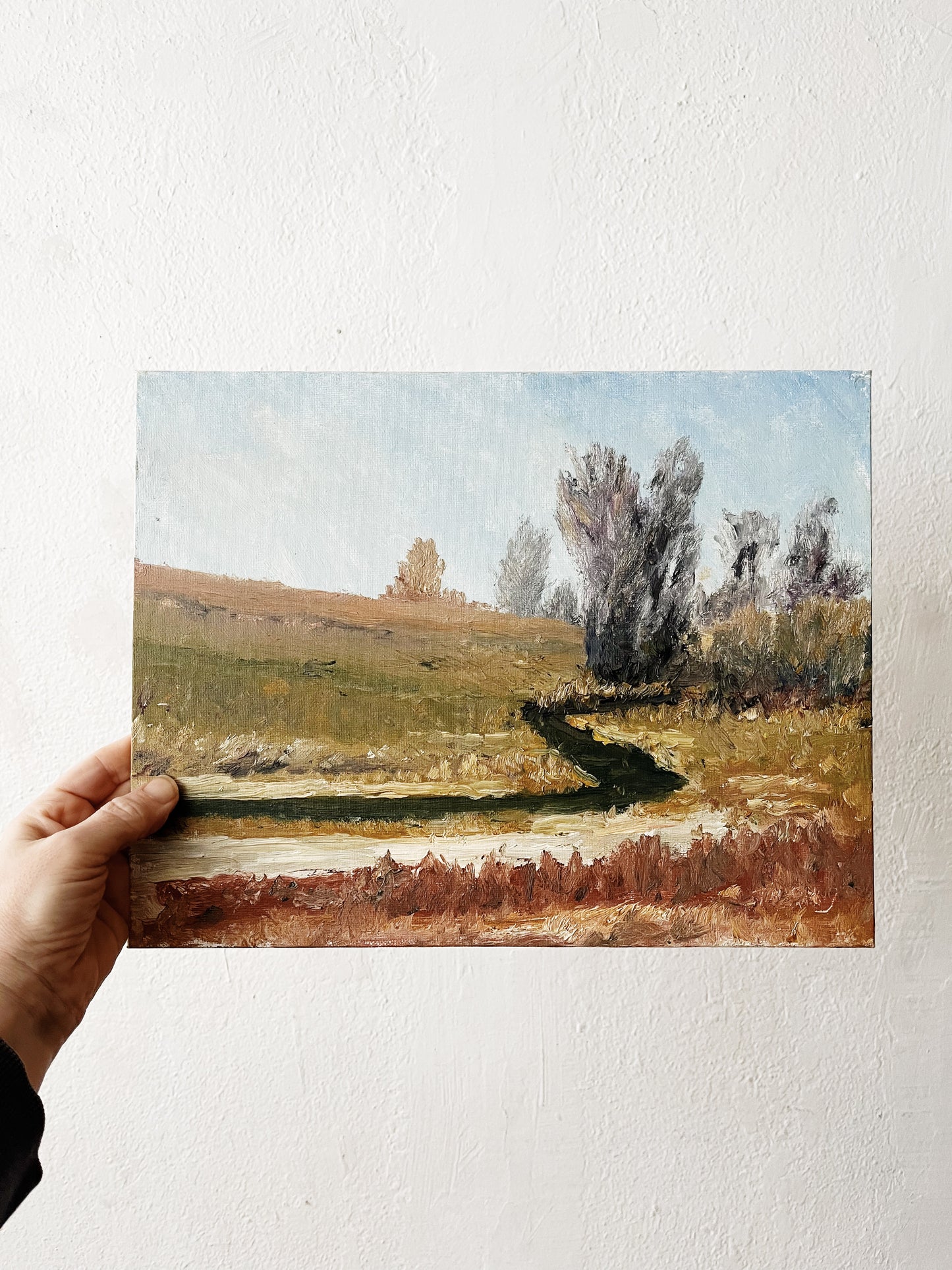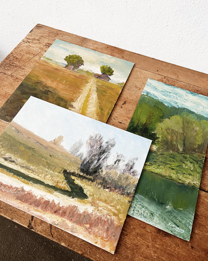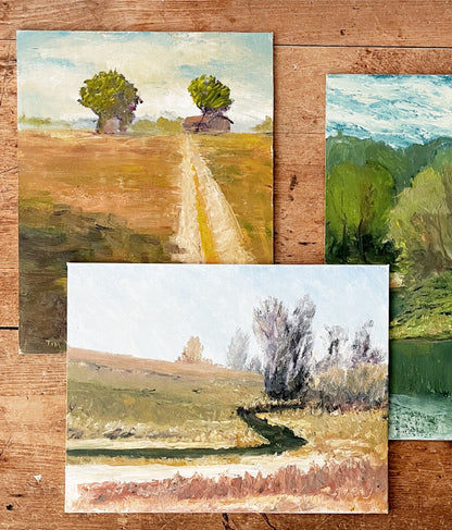 Three lovely Plein air landscapes. Serene use of colors. Oil on canvas or Masonite board which makes them easy to prop. All signed by artist