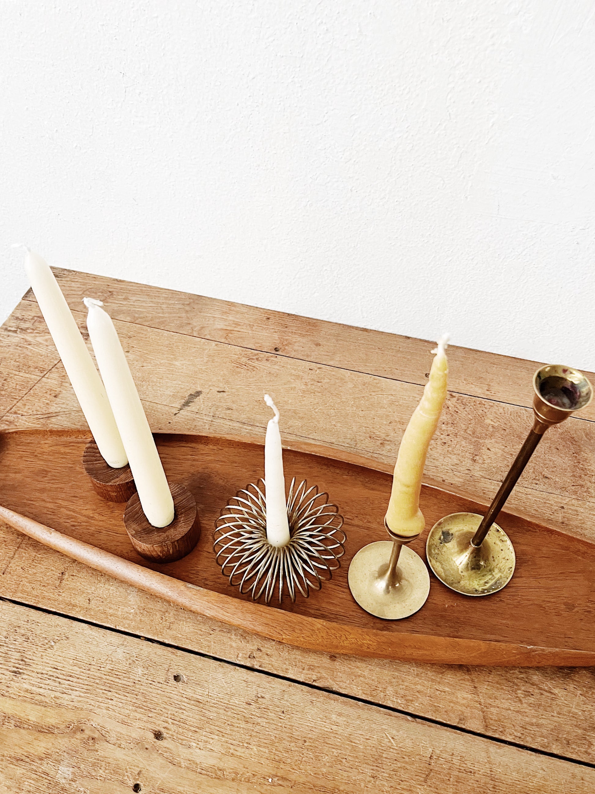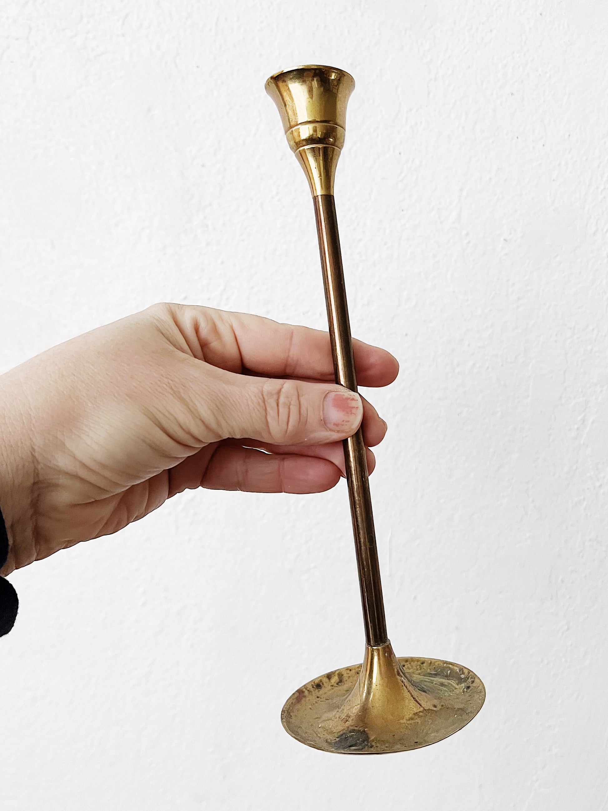 Charmingly mis matched brass candle sticks. Use them as part of a bigger arrangement but we love them as an asymmetric pair.