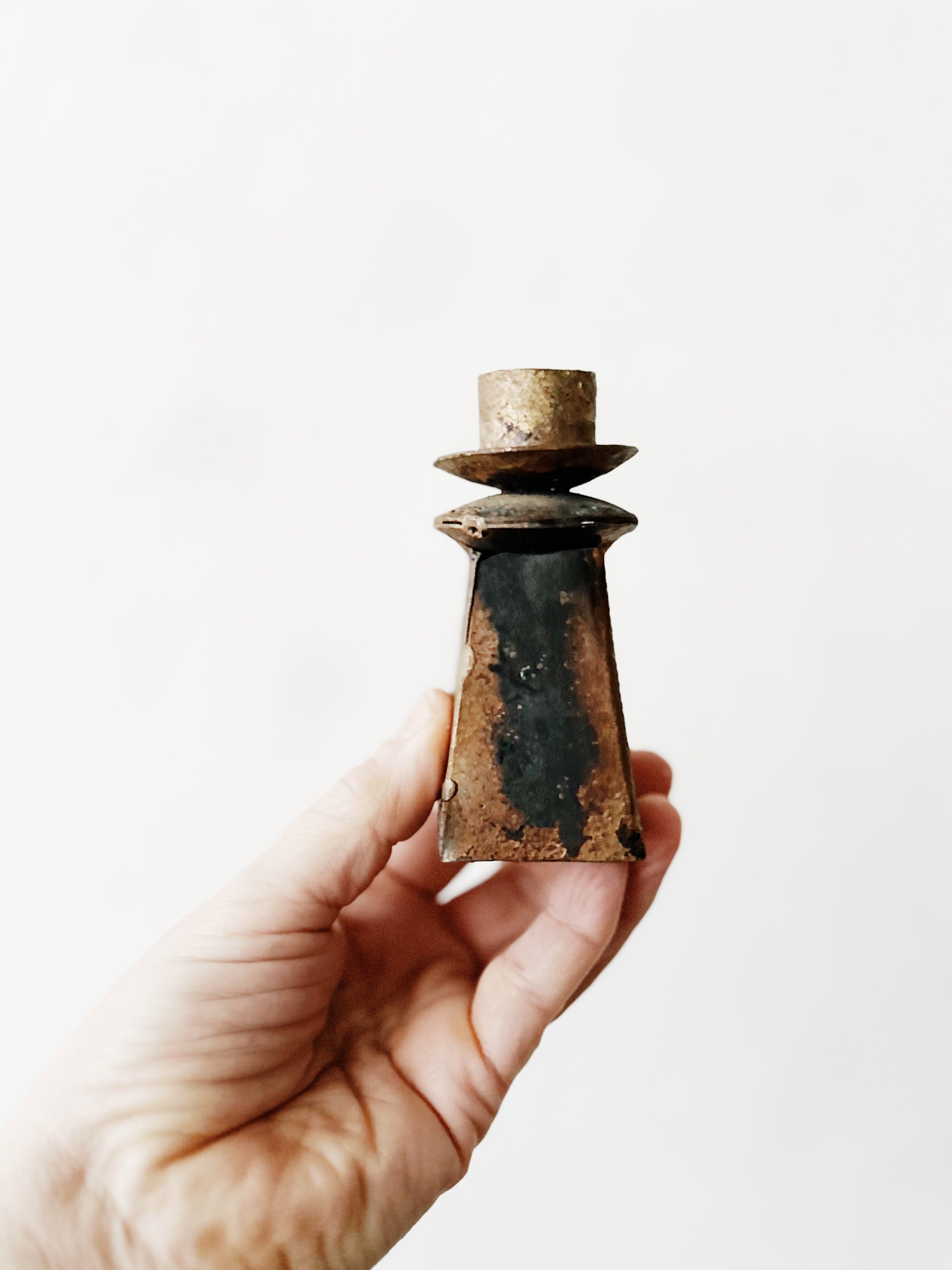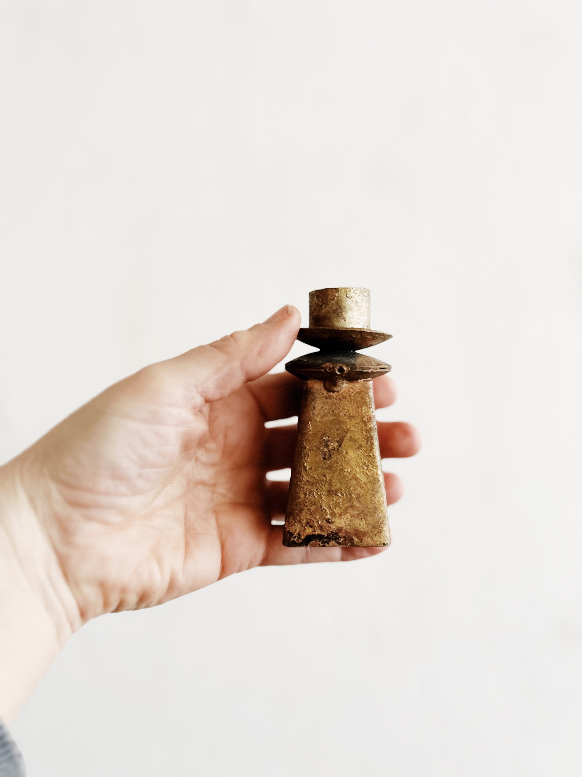 Heavy mixed metal candle holders in a great stacked shape. Material is a heavy tin? Weighty for their size