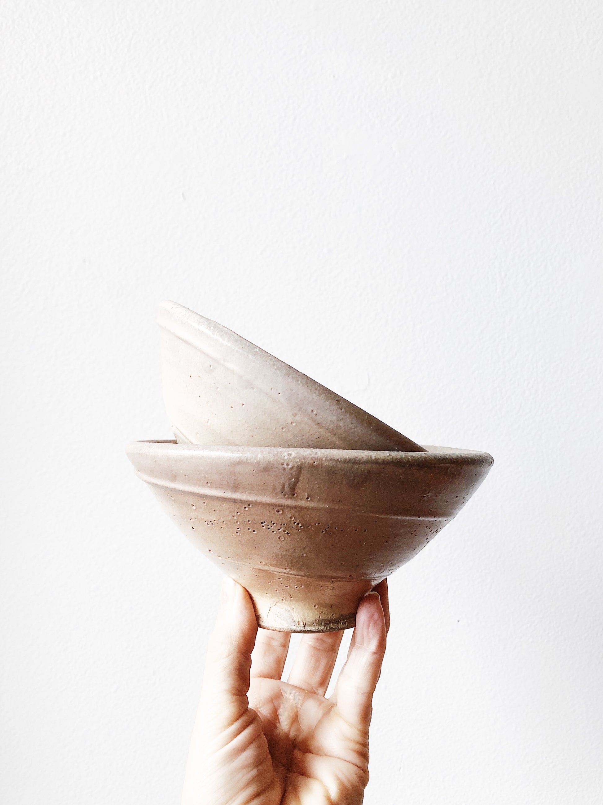 Beautiful ombré pinkish mauve glaze to these vintage stoneware bowls from japan. Subtle footed base. Nice for soups or tea
