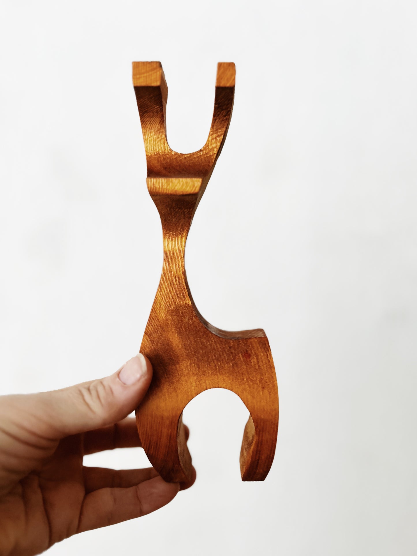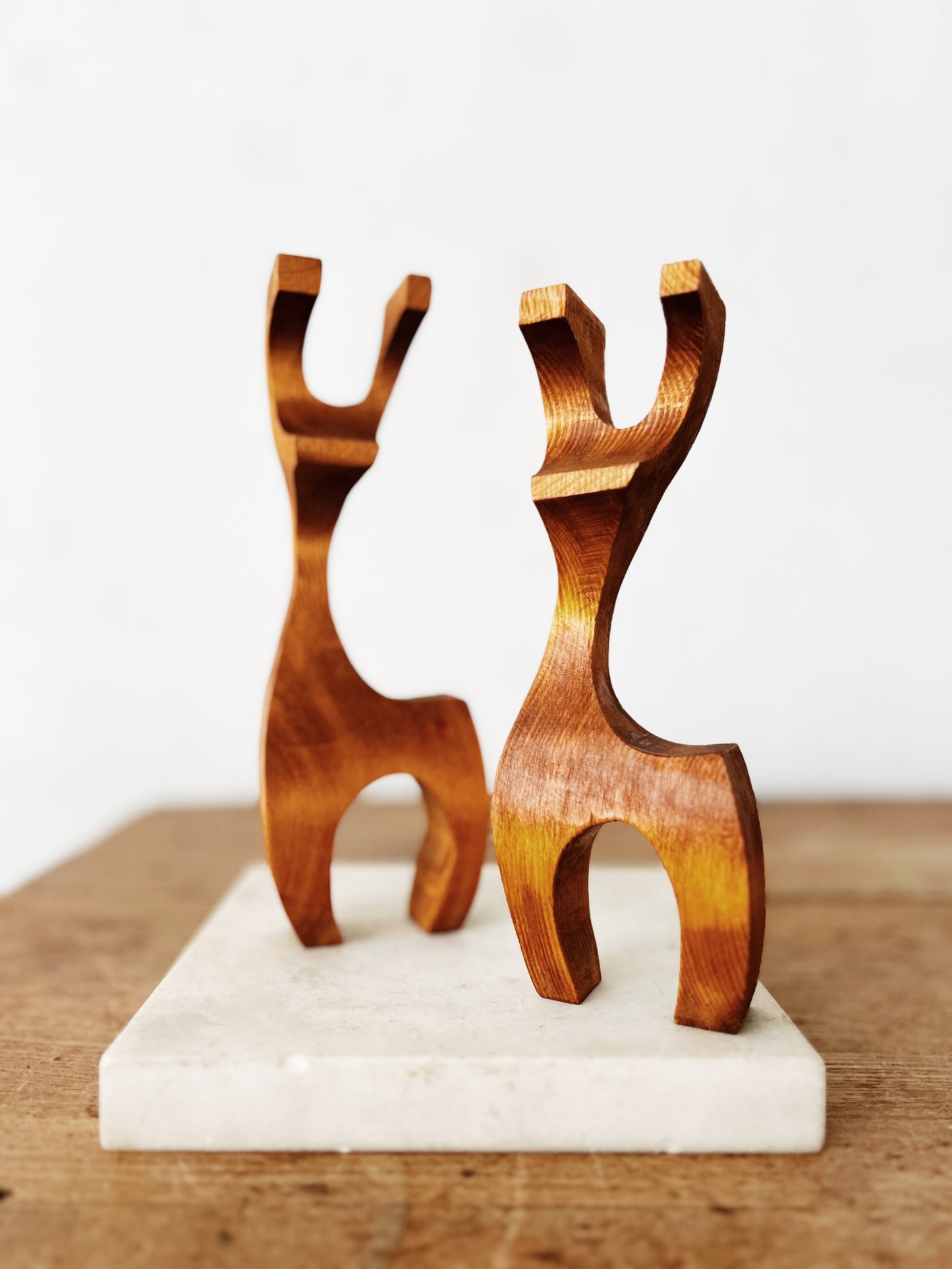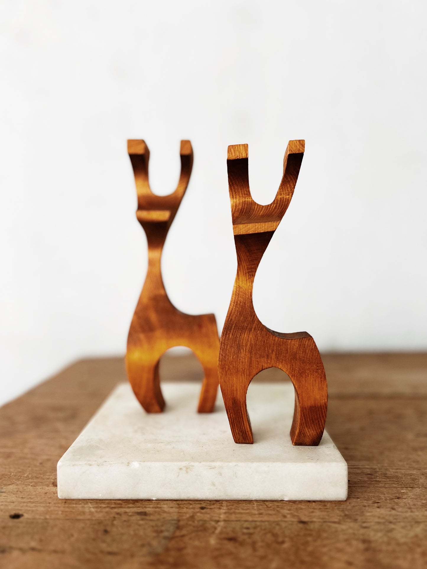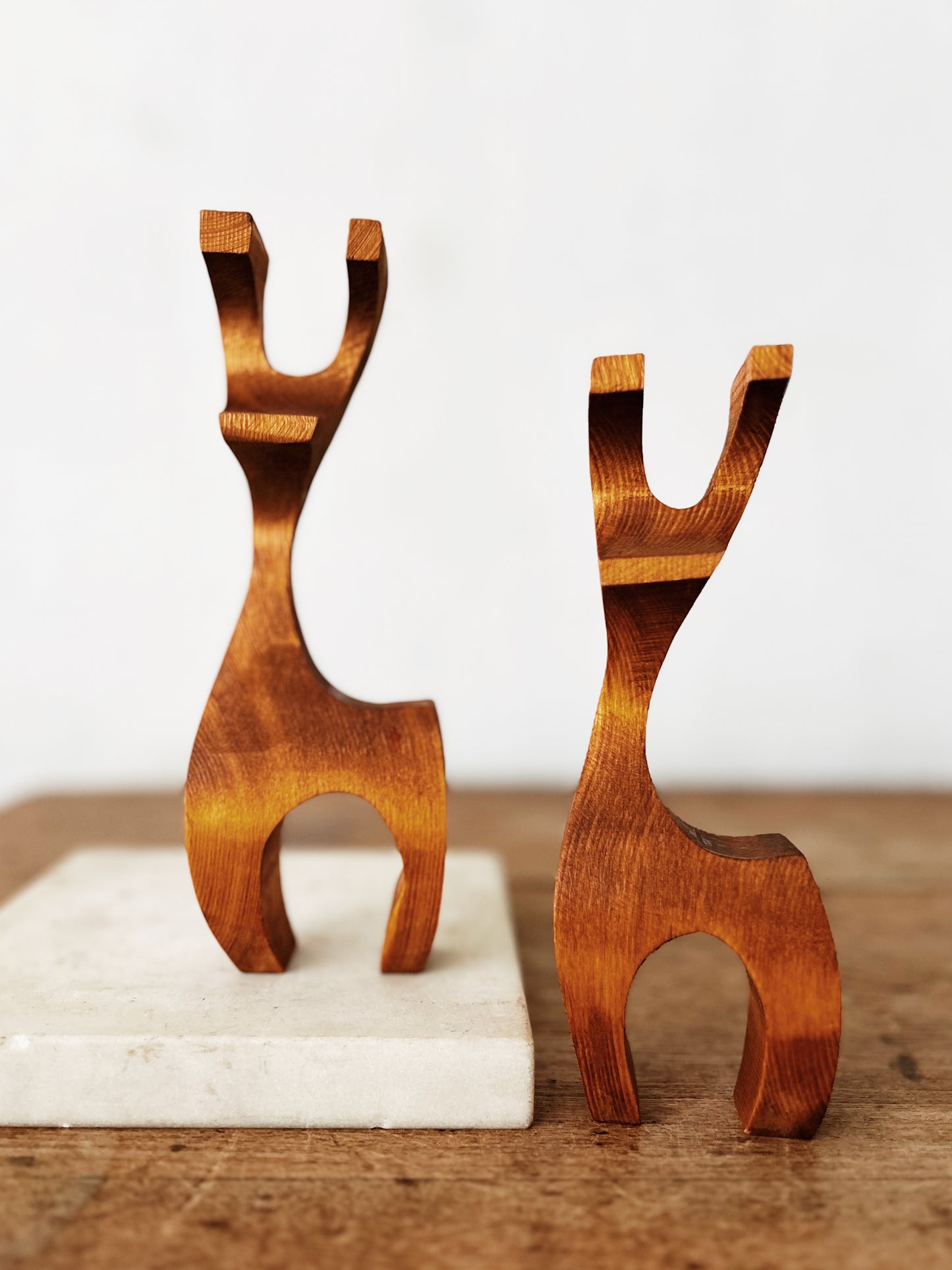 Handmade of wood. A pair of modernist deer. One slightly taller than the other