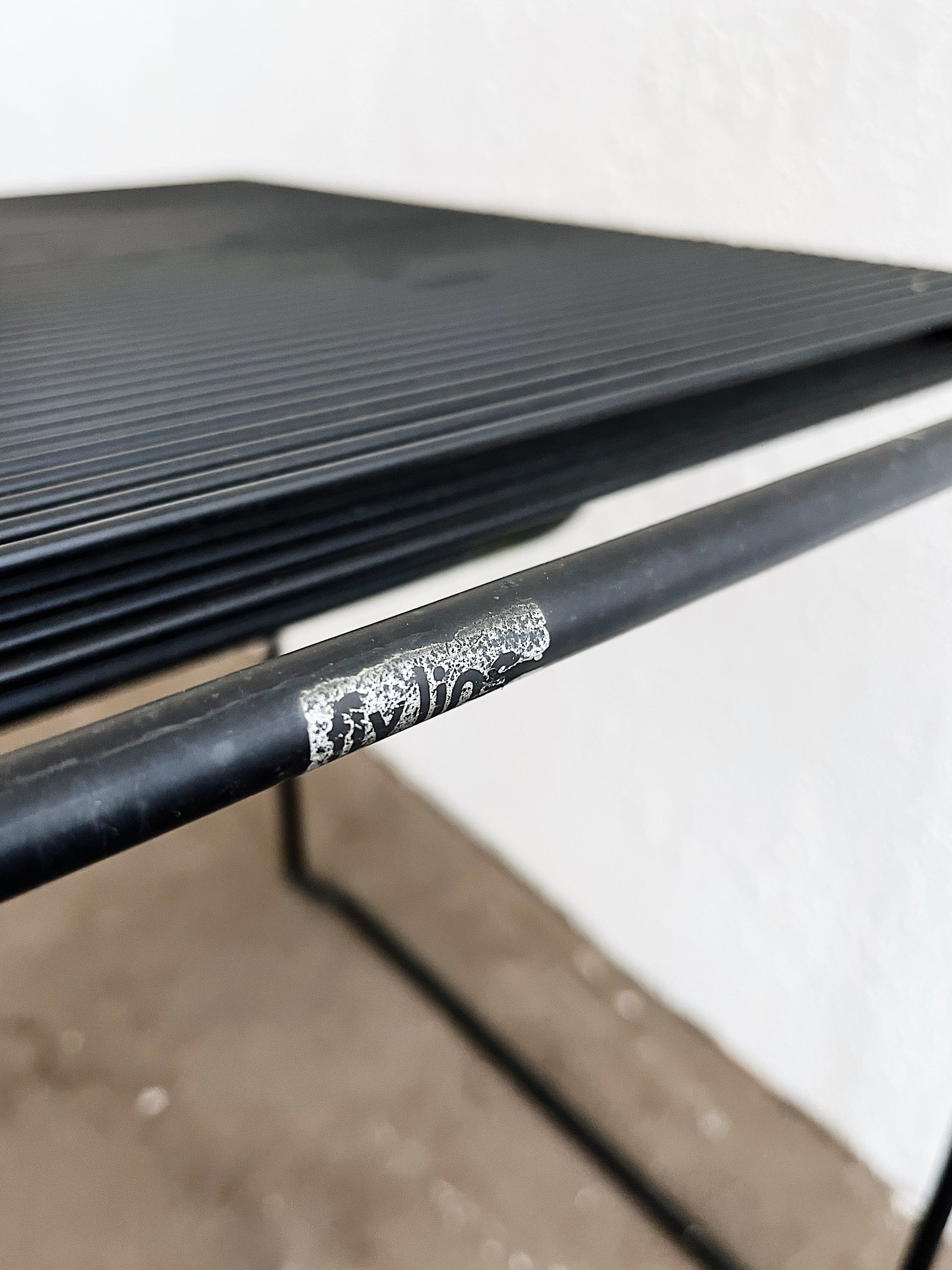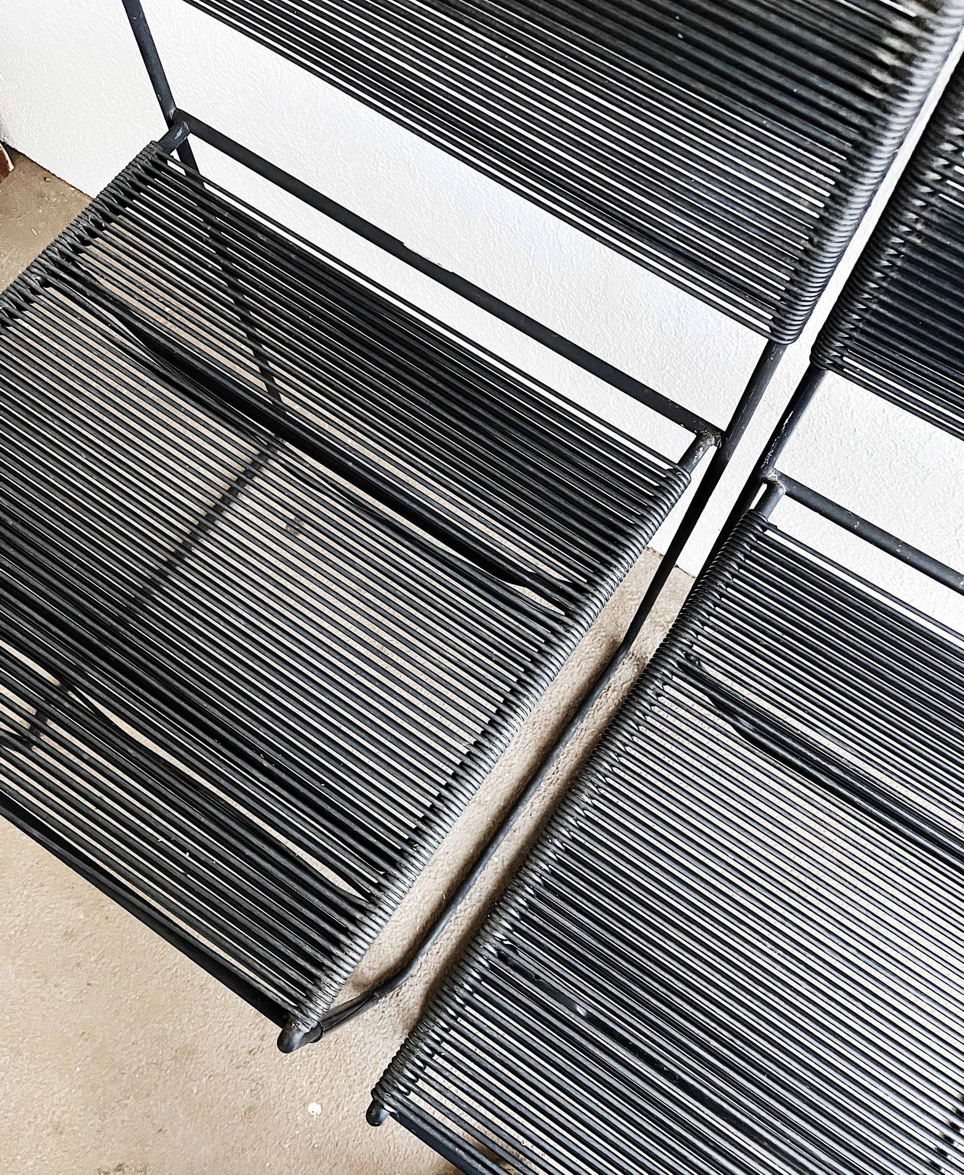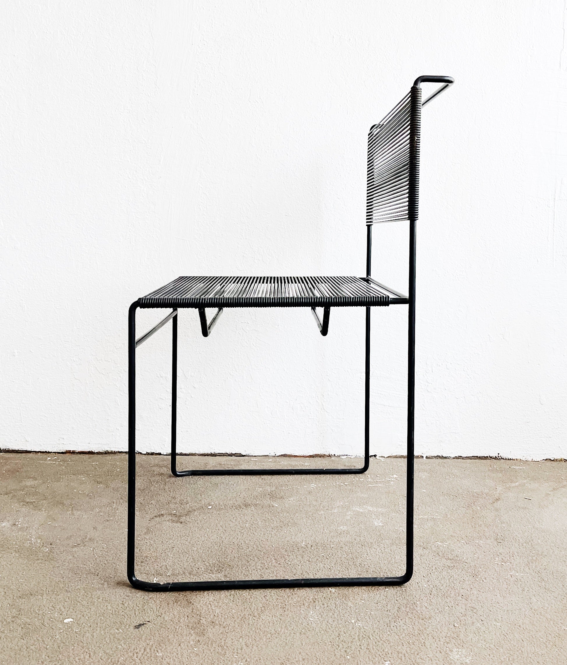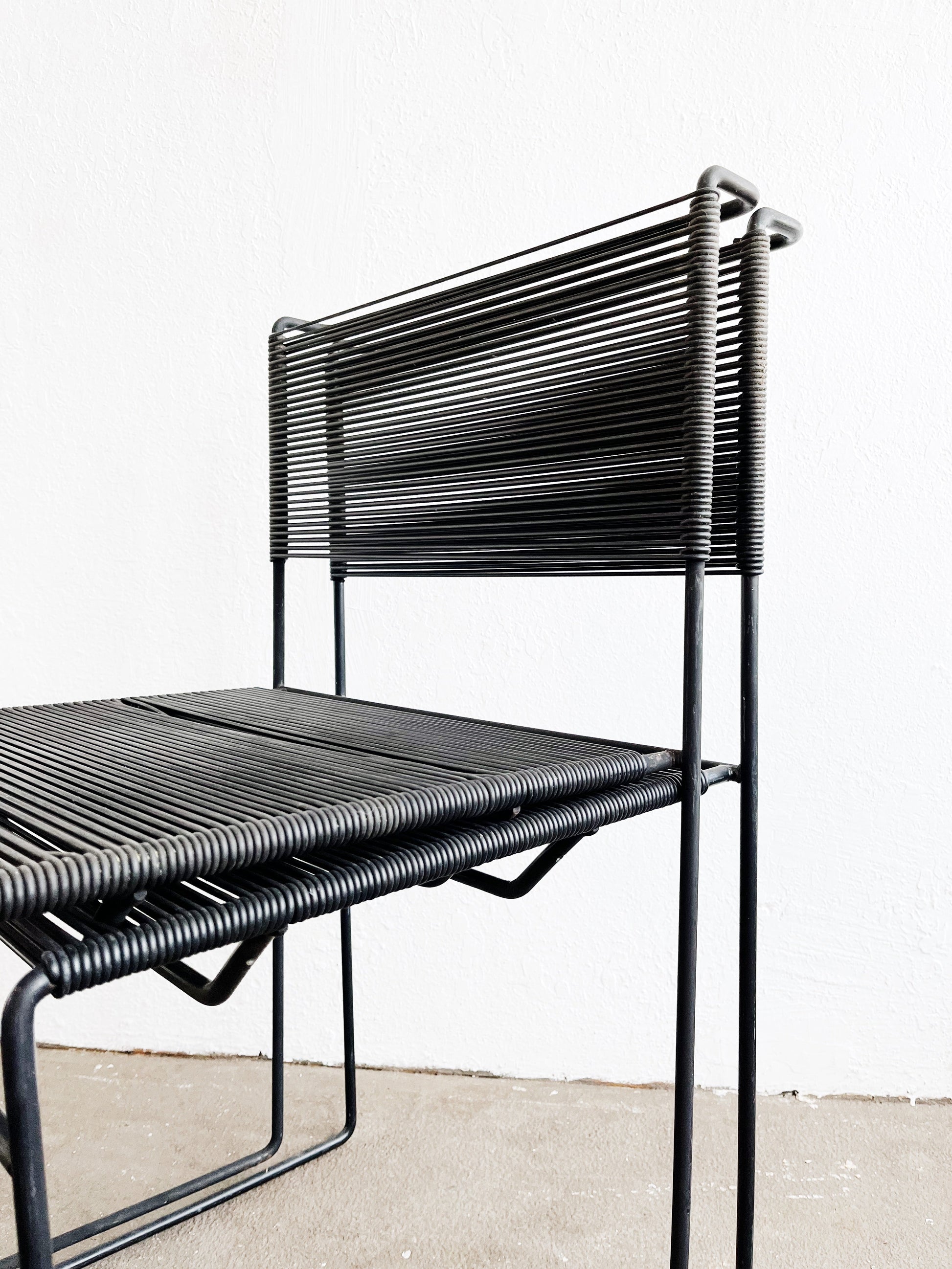 Iconic post modern design on these original Italian spaghetti chairs by Giandomenico Belotti for Fly Line. Simple metal square frames with rubbery roping. Stackable. A vintage mod look indoors or out