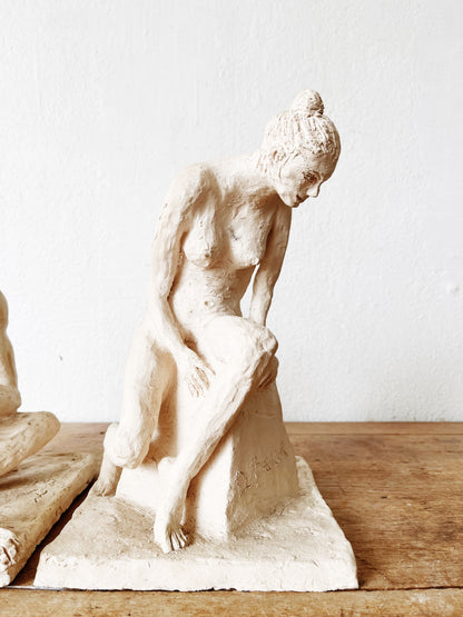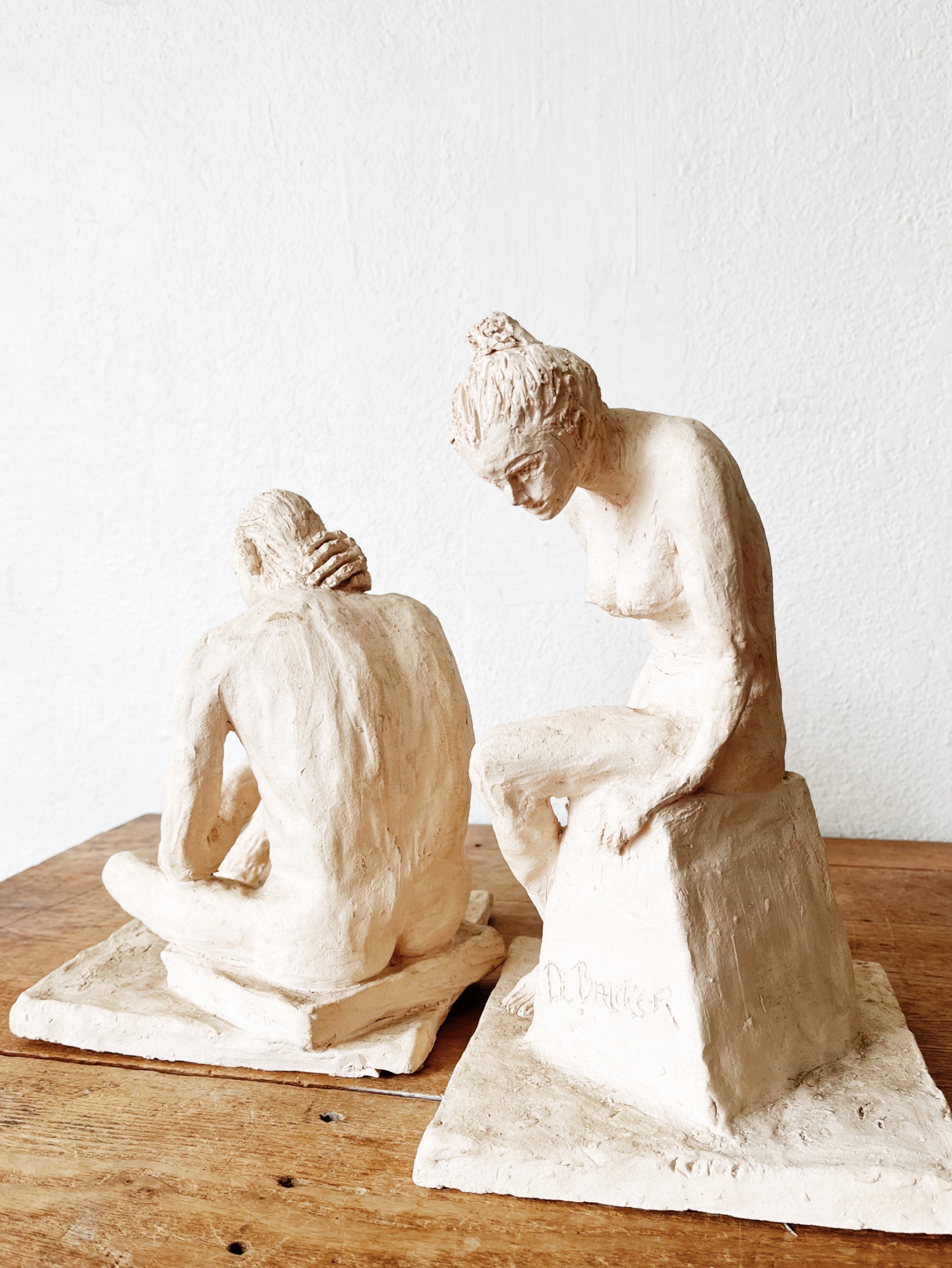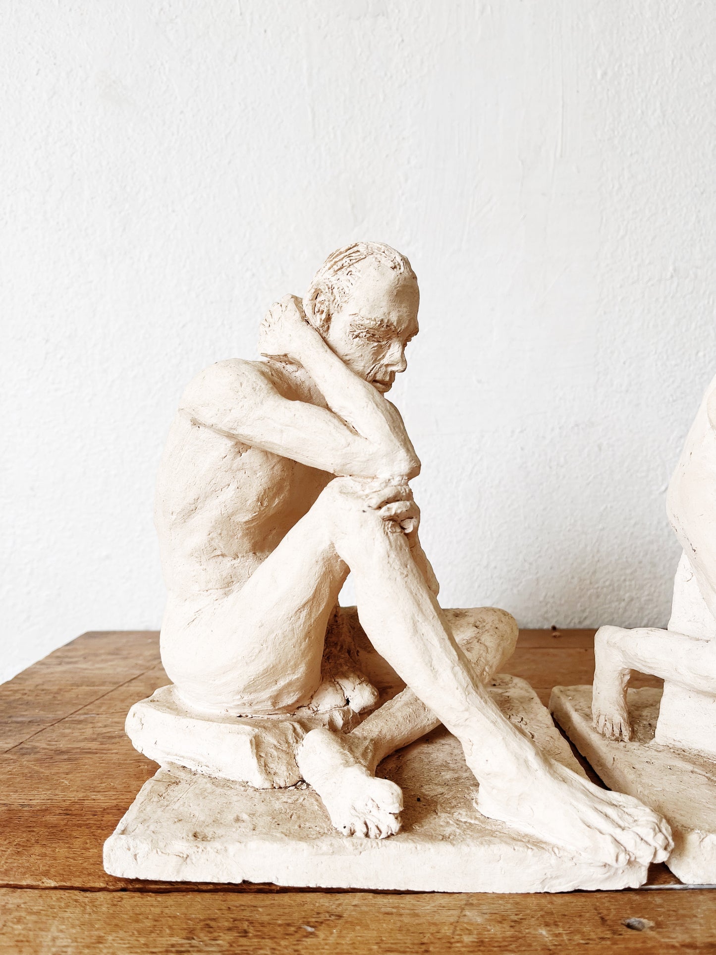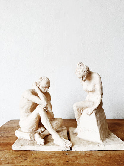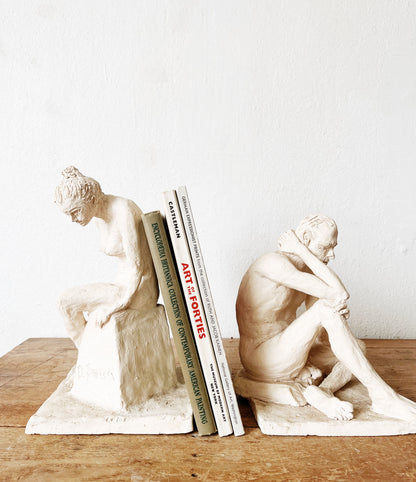 Unglazed clay nude figures. Rarely do we find a male and female together. Both made by the same artist. Weighty and solid with nice textural appeal. Large enough to hold the largest of books