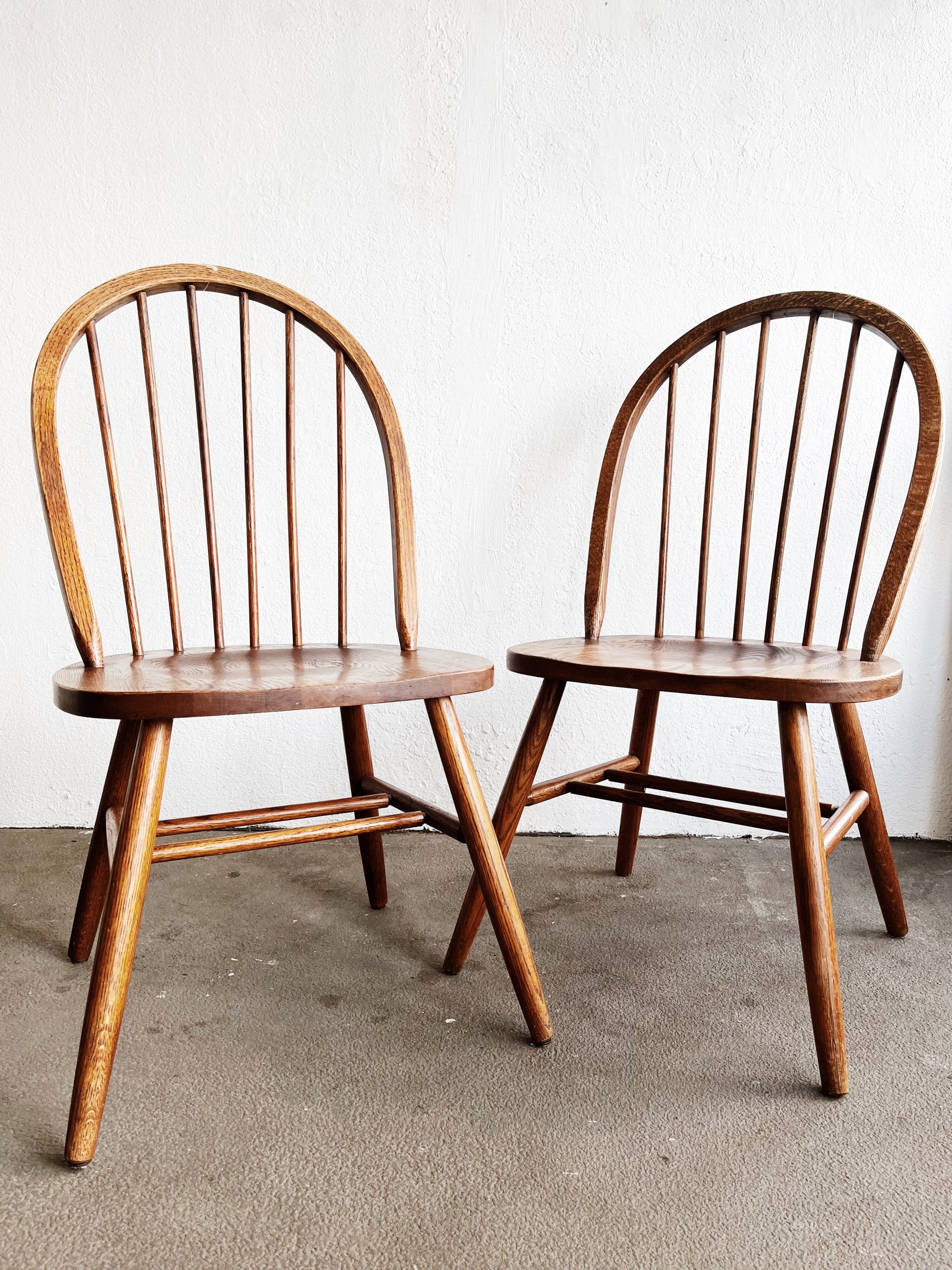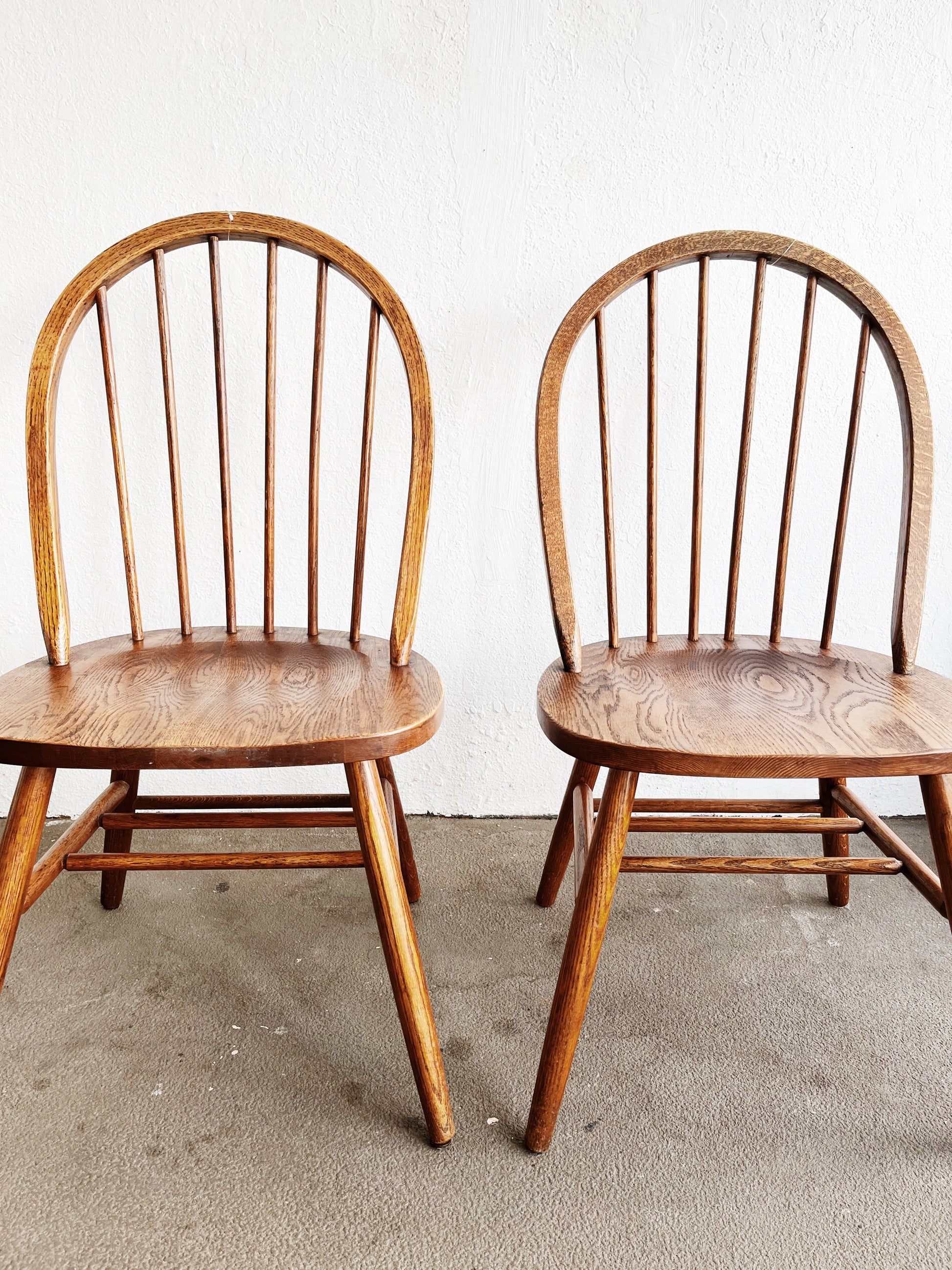 Vintage shaker style chairs in spindle back oak. The wood is mellowed with use. Comfortable to sit in and warm minimal design aesthetic