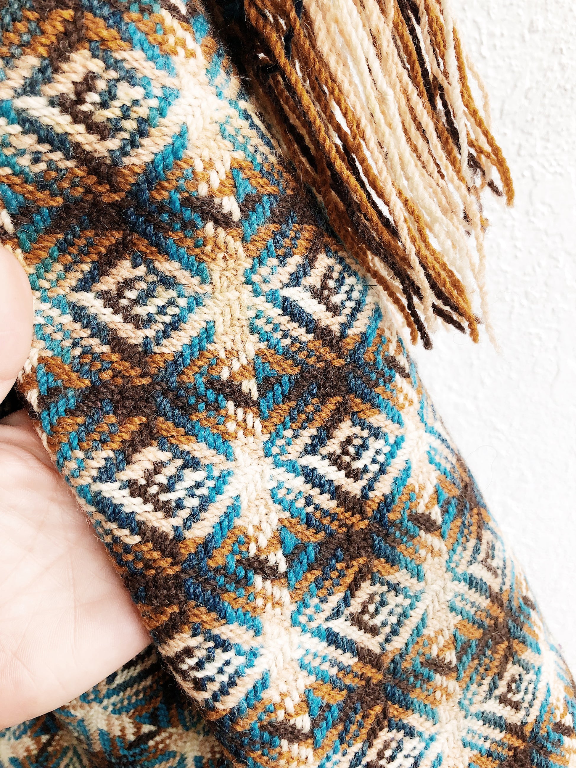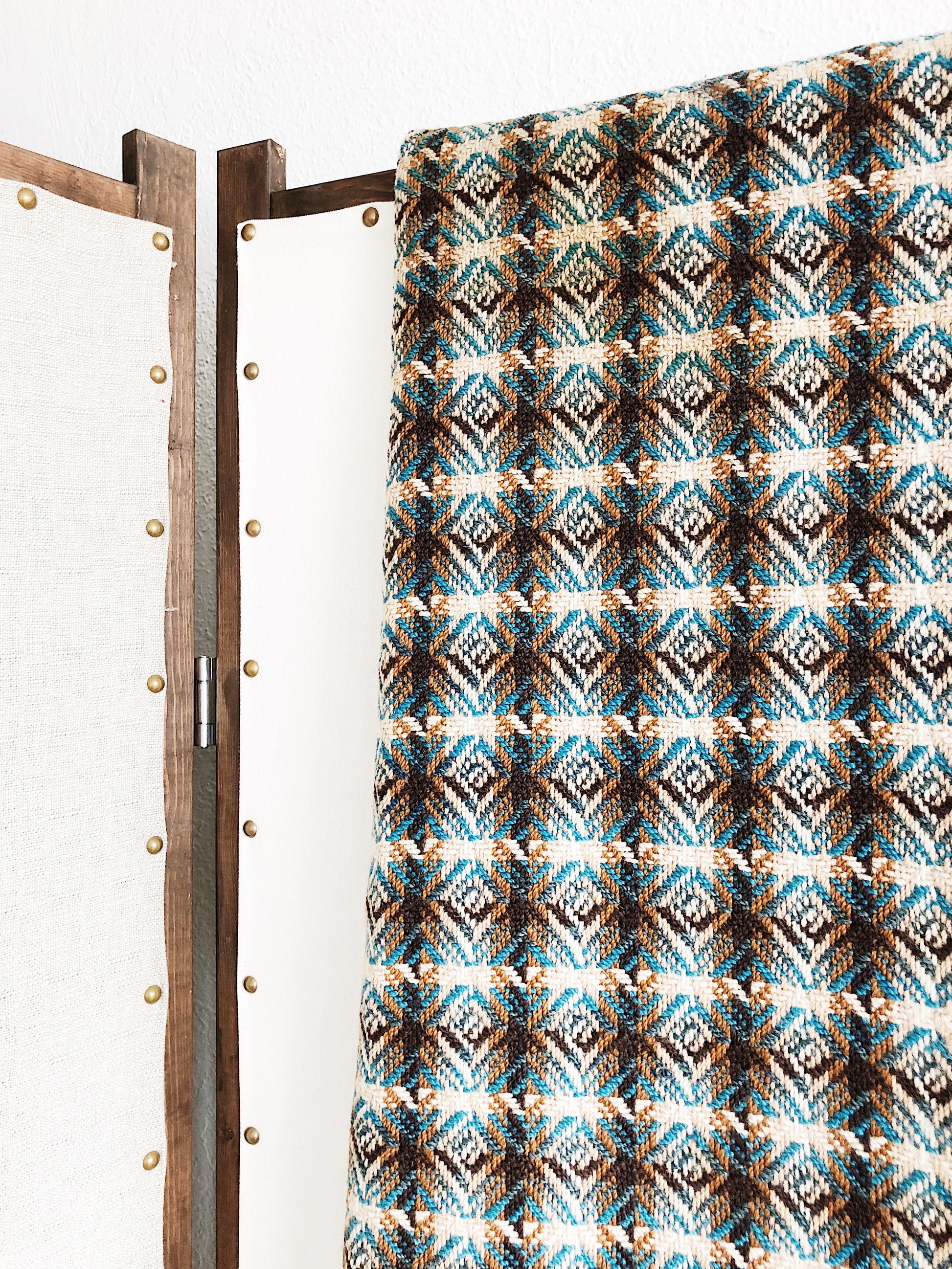 Fantastic weave to this vintage Pendleton wool throw. Earthy Turquoise with terracotta, cream brown and a lighter peach. Fringed ends. Great size for by the campfire
