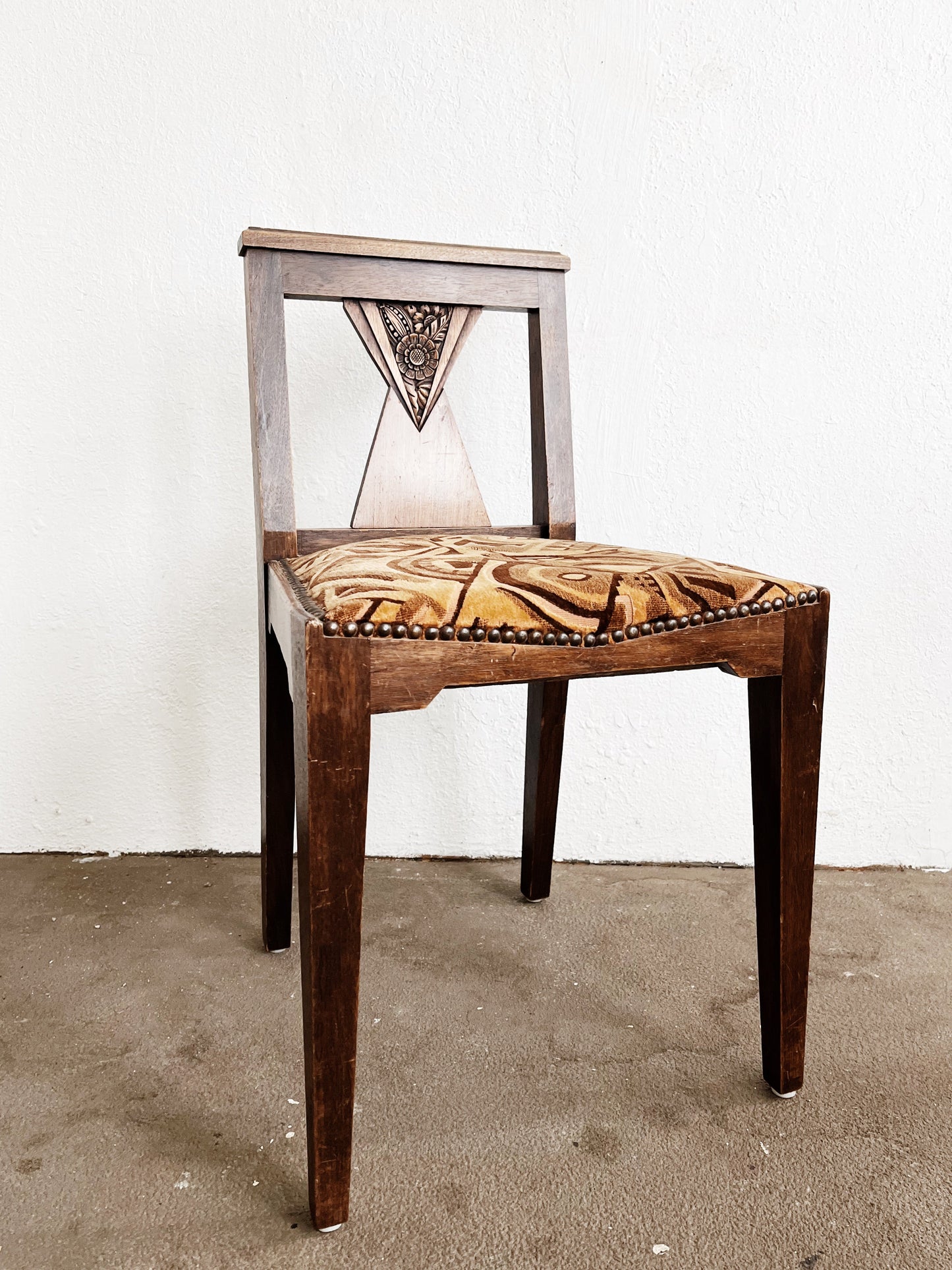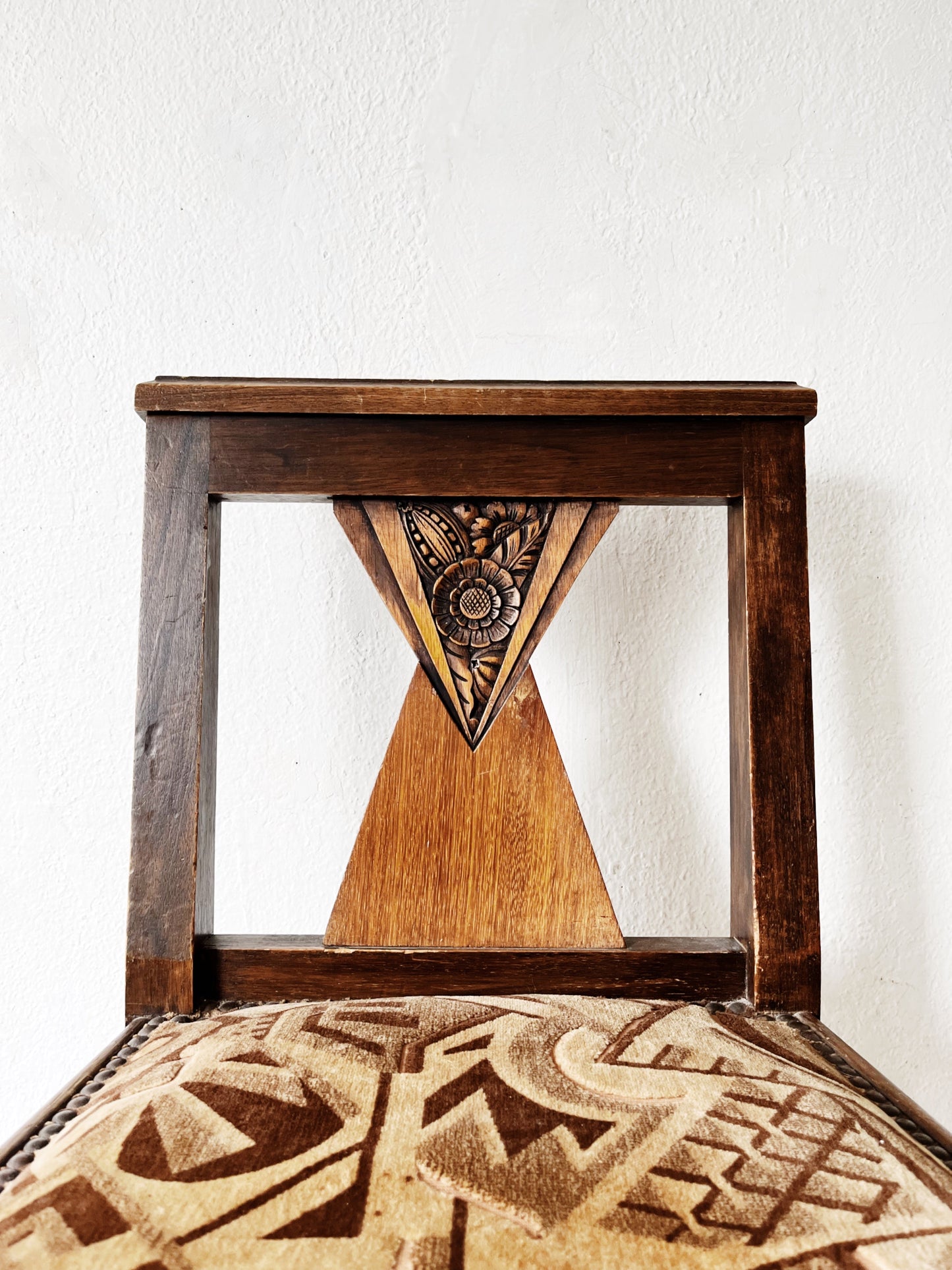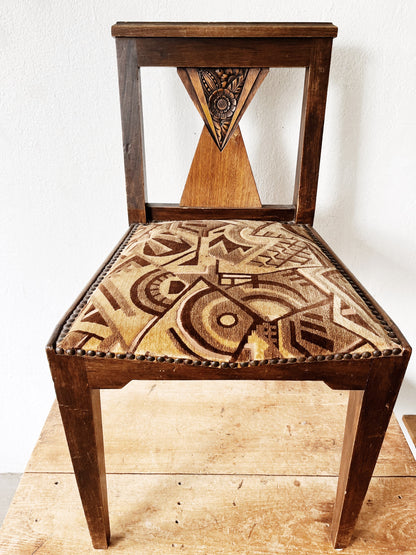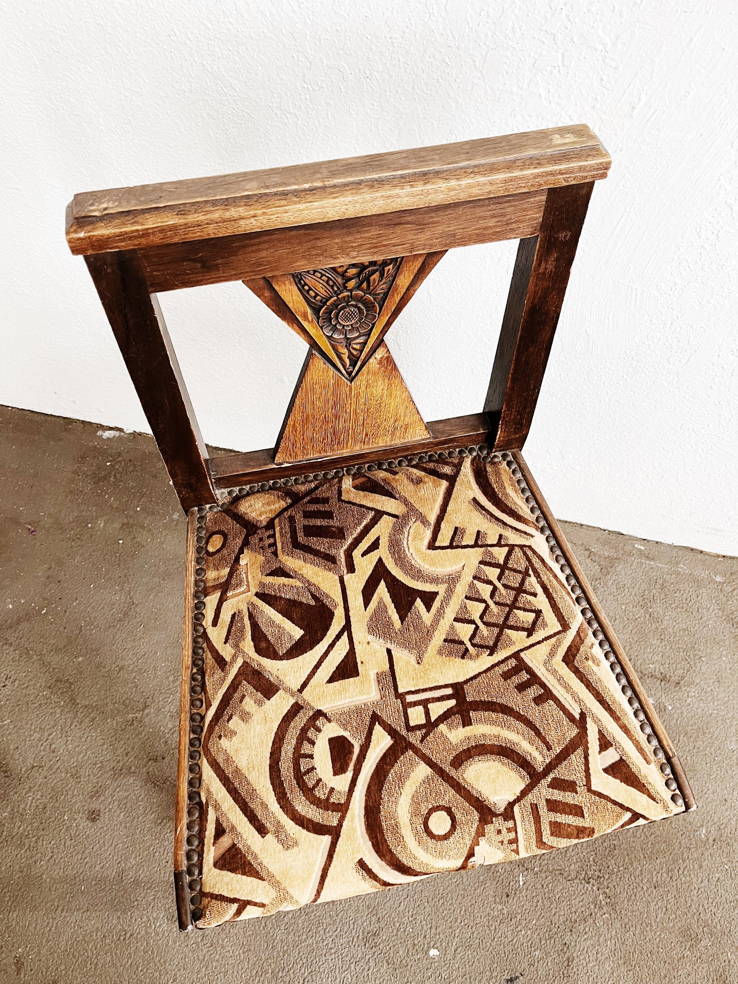 The most perfect little chair. Art deco era wood frame. Nail head trim surrounds a cut velvet fabric that we can only call outstanding. Carved details. It’s just a little gem of a seat.