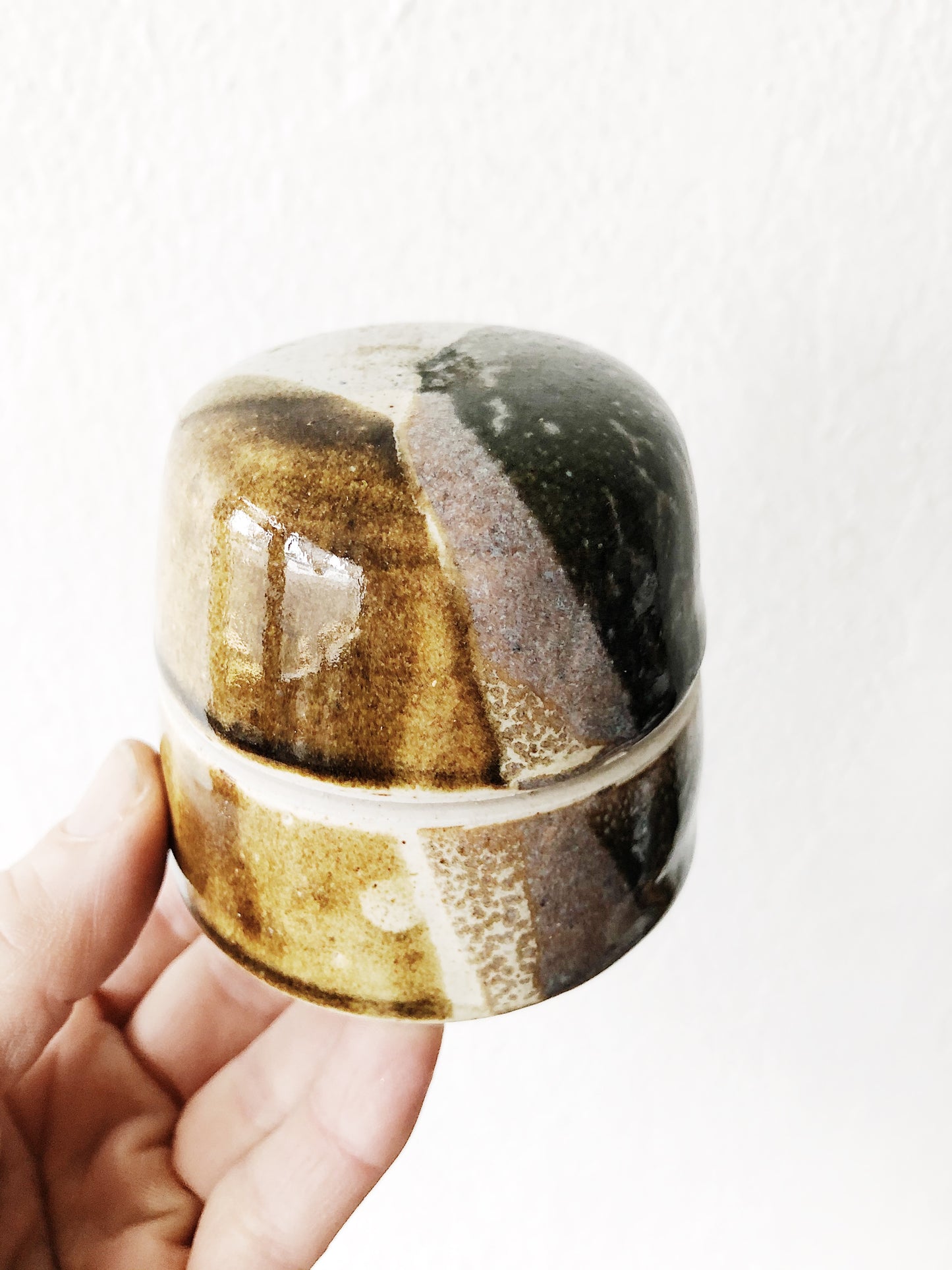 Beautifully glazed vessel with lid. Use as a stash container, ring box or store incense cones