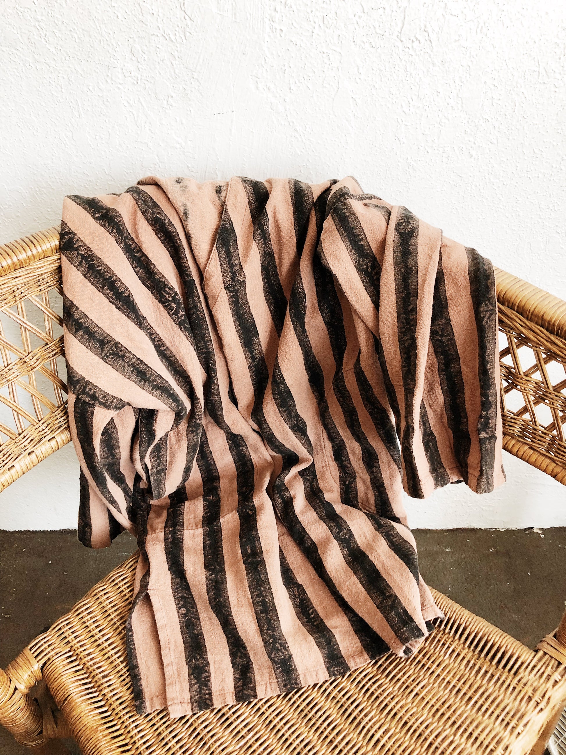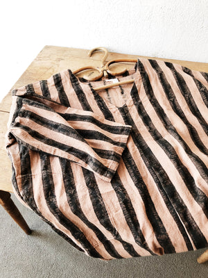 Fabulous Indian cotton tunic from UK brand PO-EM. Pockets. Drop shoulder sleeve. Rugged and sturdy, and yet soft. Block painted with Natural dyes. Terra/earthy rose and black. Retails for $150
