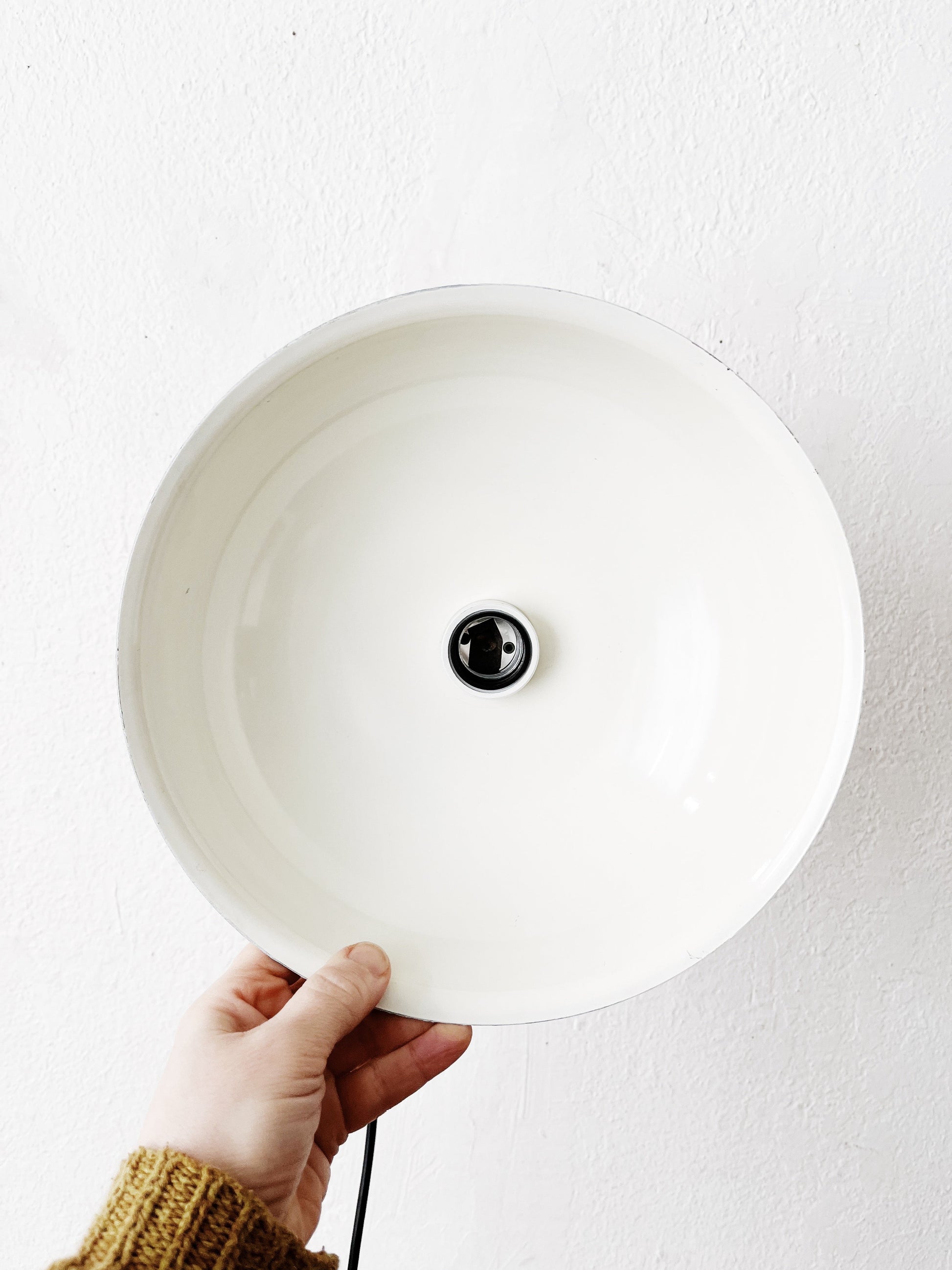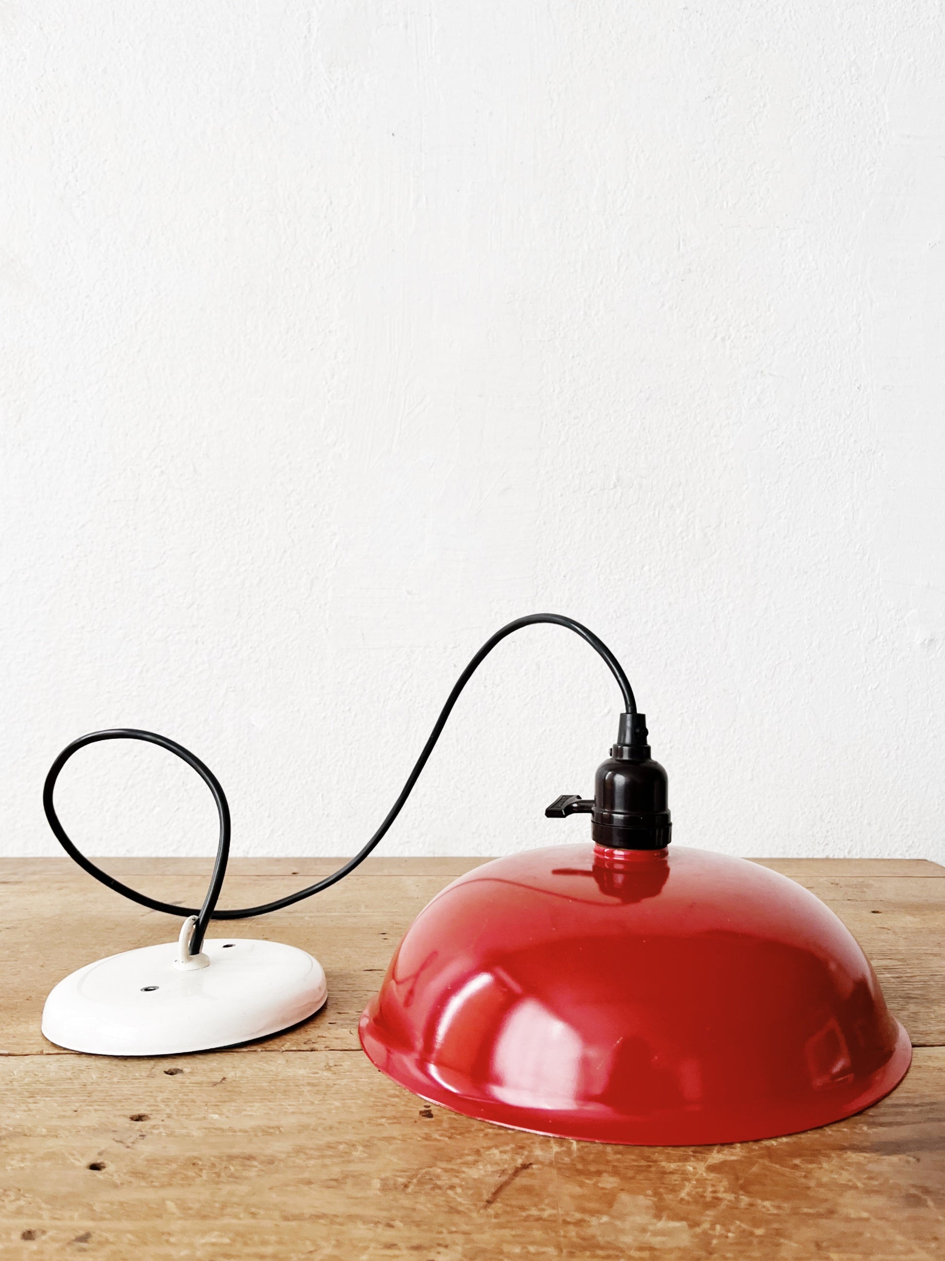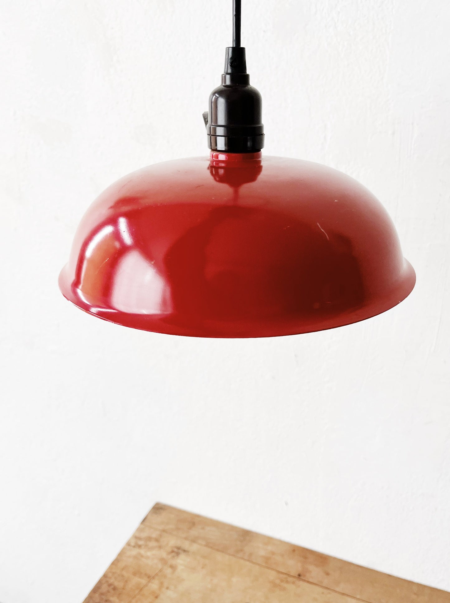 Early 1980s cherry red enamel pendant light. Exposed turn key switch adds charm. Great over a sink. Enamel underside in warm white. Takes a standard bulb. Hardwire installation required though this could be adapted to a plug end. In great condition