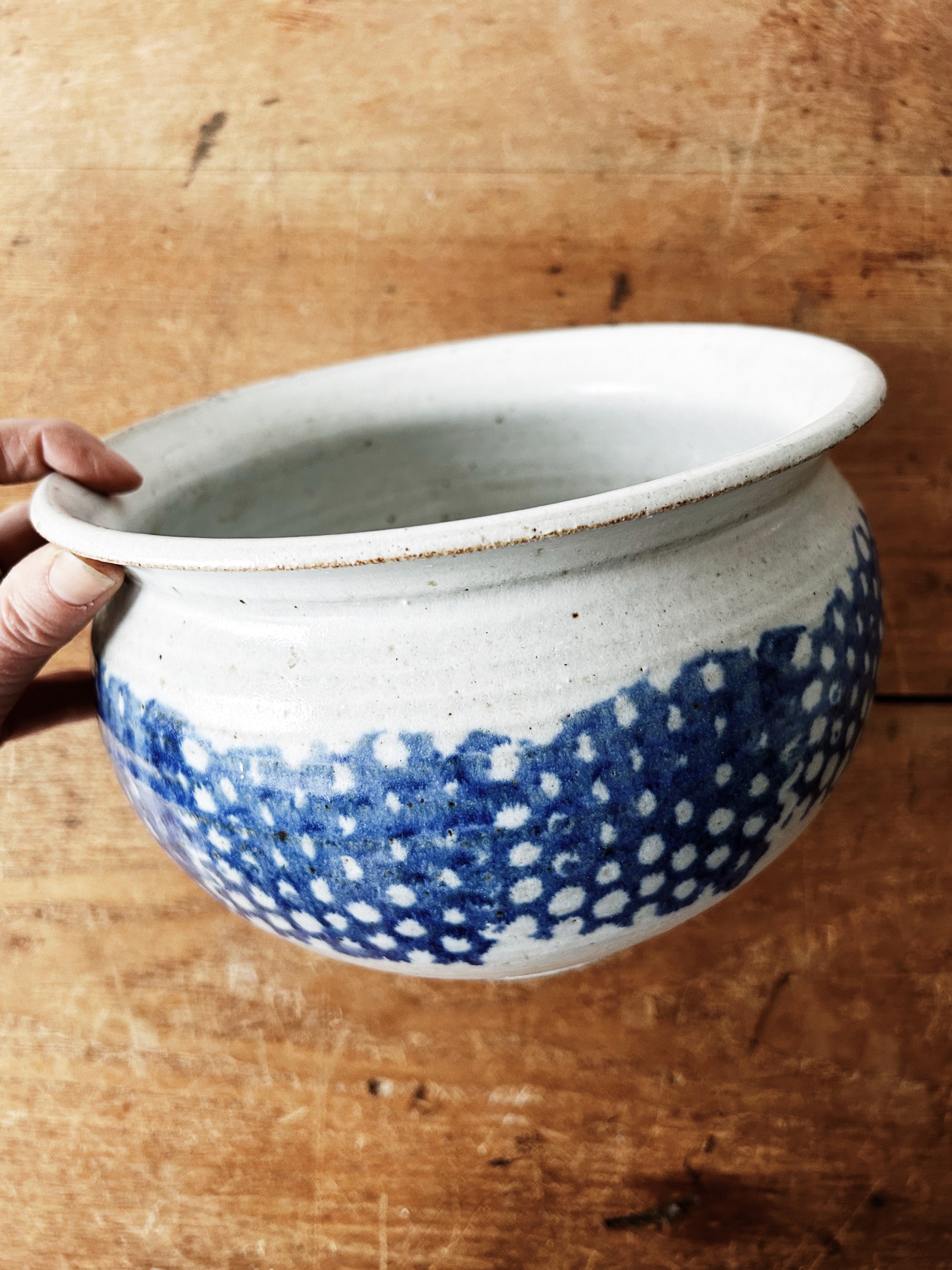 Beautiful large handmade ceramic plant pot with drainage, signed c1977. Lovely abstract indigo patterning