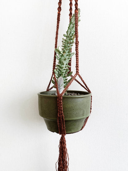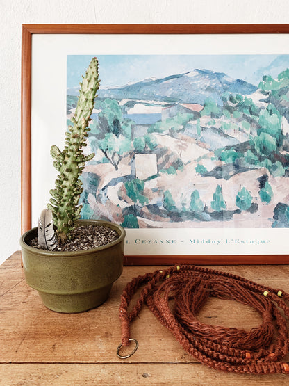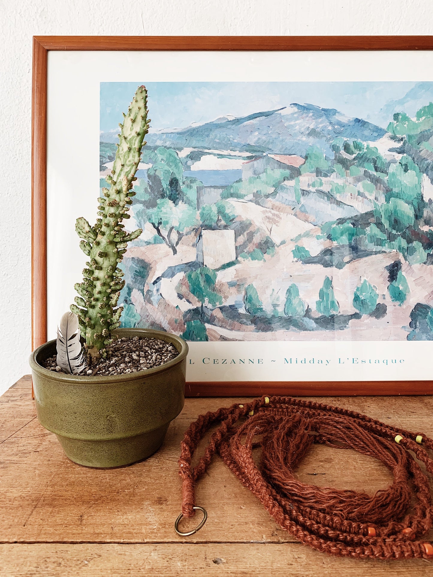 Healthy potted cactus in a vintage mossy green stoneware pot. looks like a bud may pop out the top before too long.