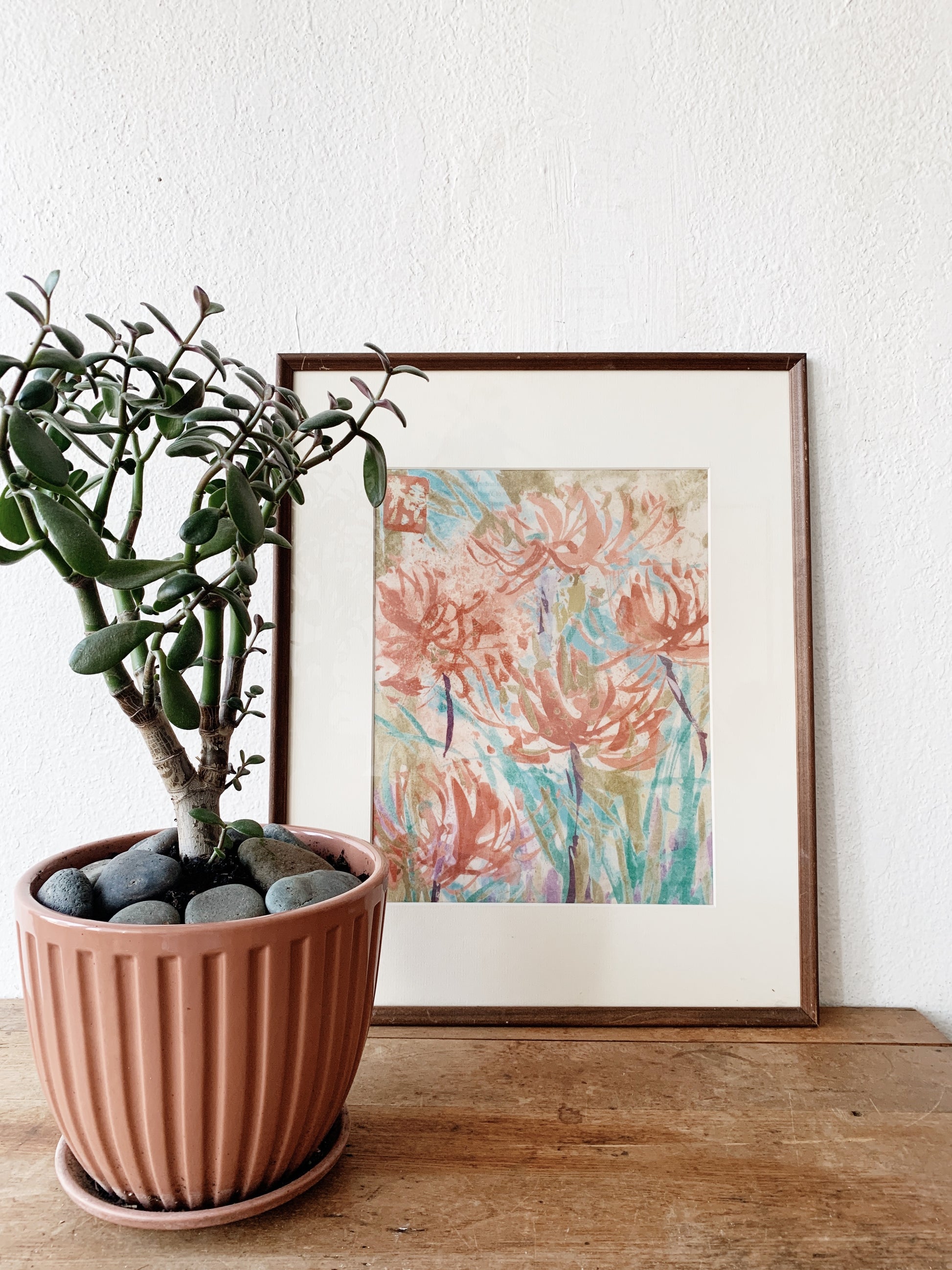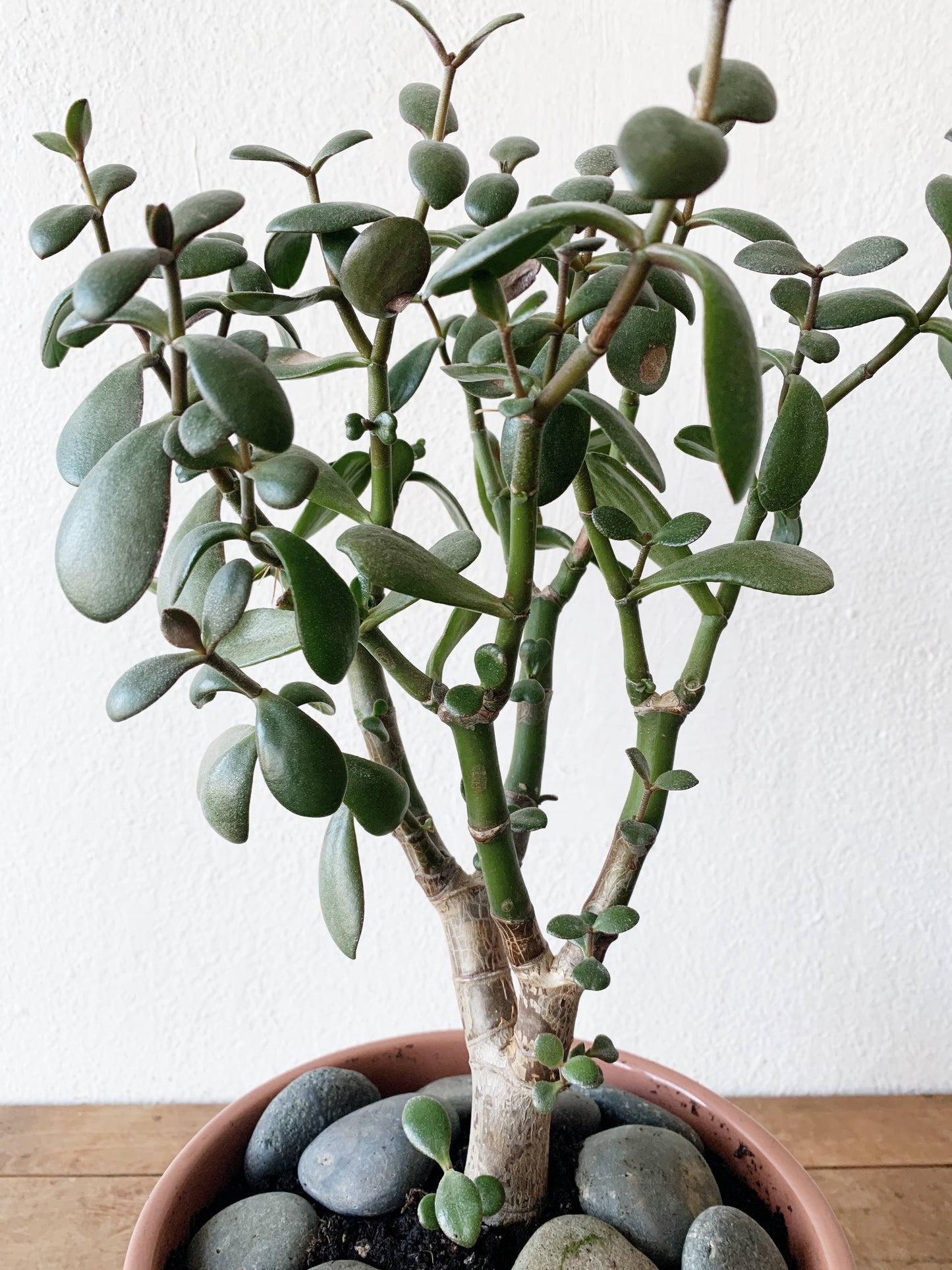 Lovely, healthy potted jade. The tray pot is vintage NorCal in a dusty pink. Also in great shape. River rocks on top.