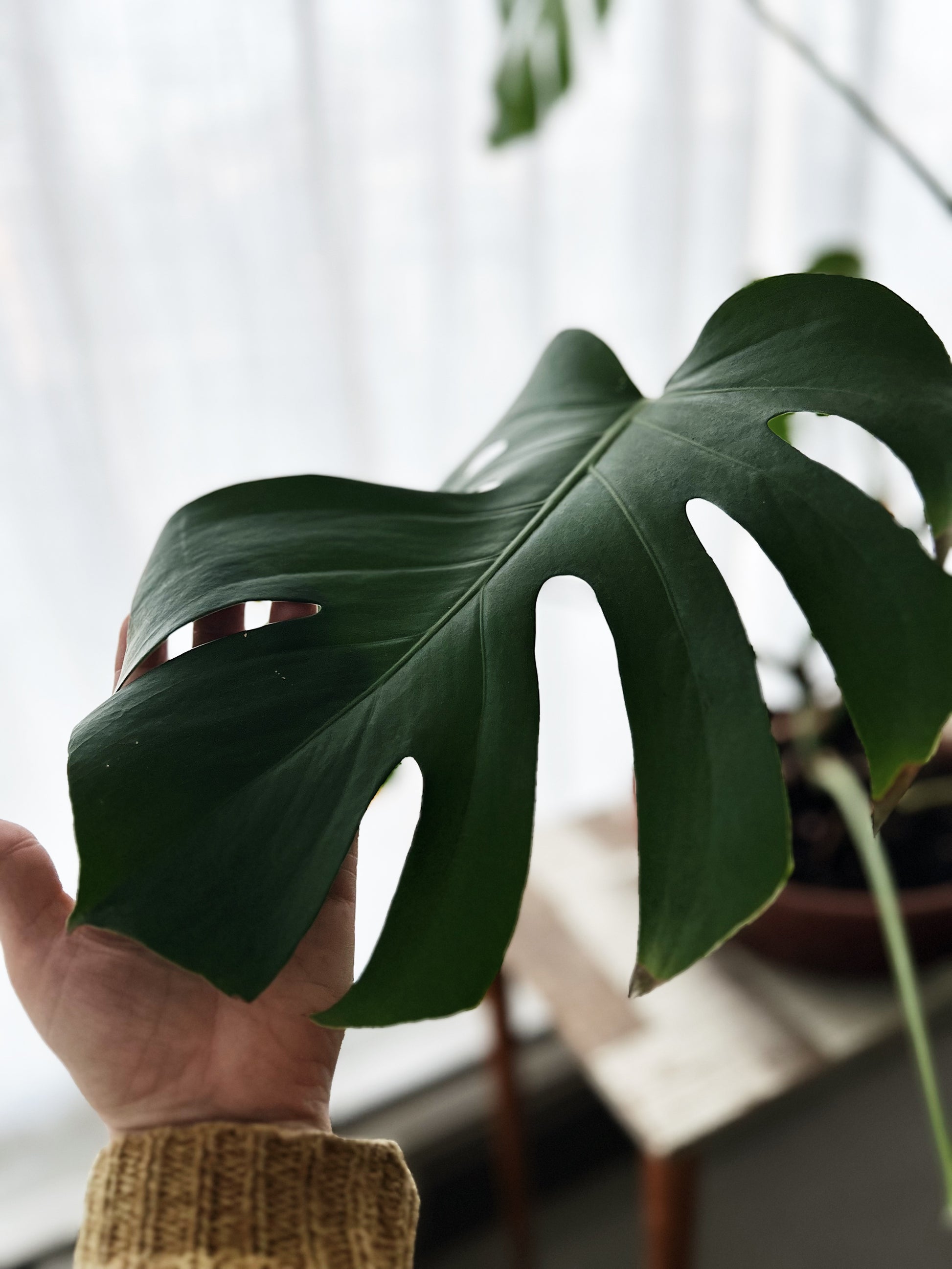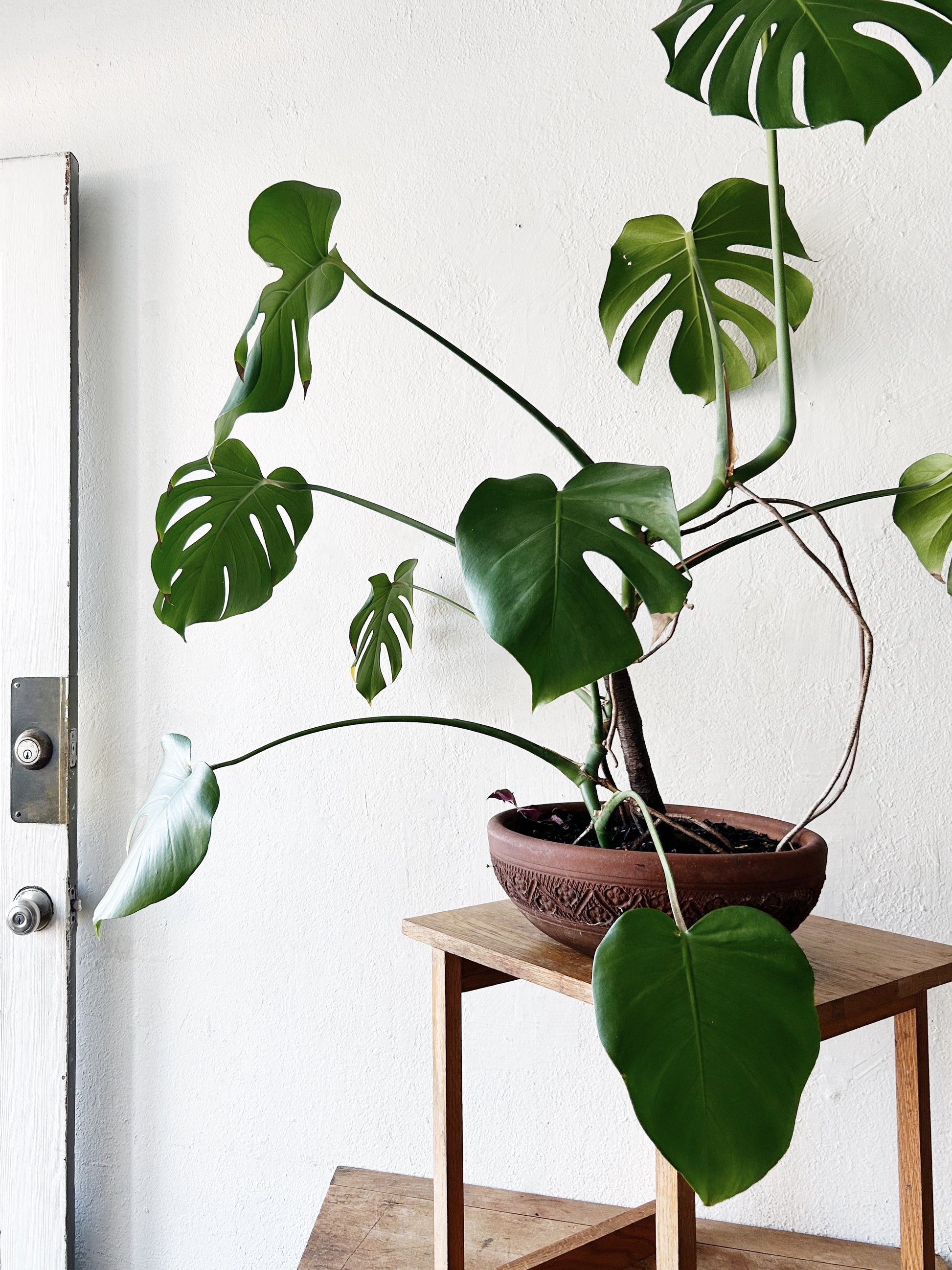 A large and stout specimen of Monstera deliciosa. Beautiful shape and leaf fenestration. Bonsai style growth with aerial roots. This is a healthy a thriving specimen. Potted in Mexican terra cotta with a special soil mix for aroids.