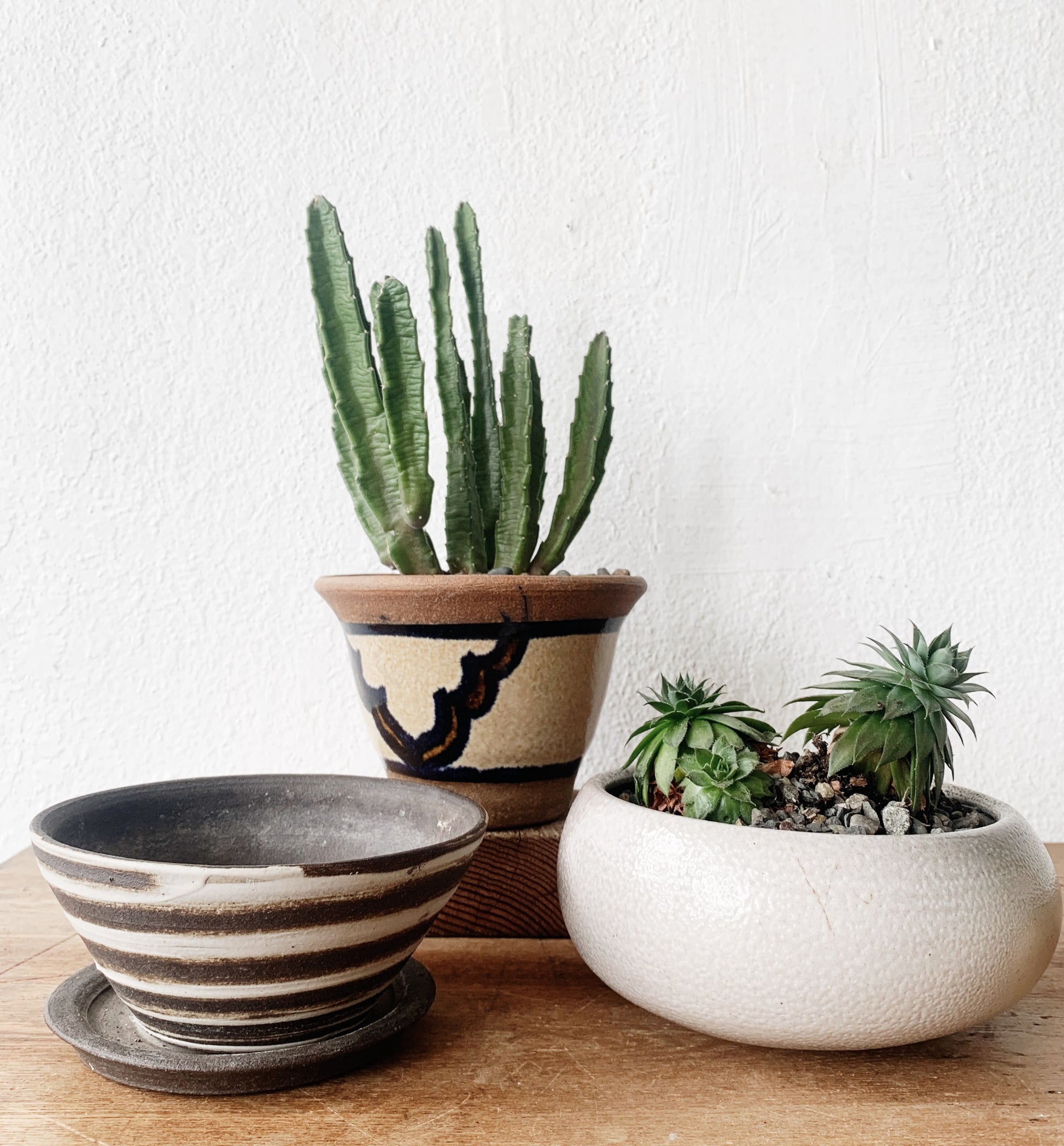 Echeveria Keegan’s, aka Chicks and hens, northwest succulents that grow happily outdoors. These two are potted up in a shallow handmade pot.
