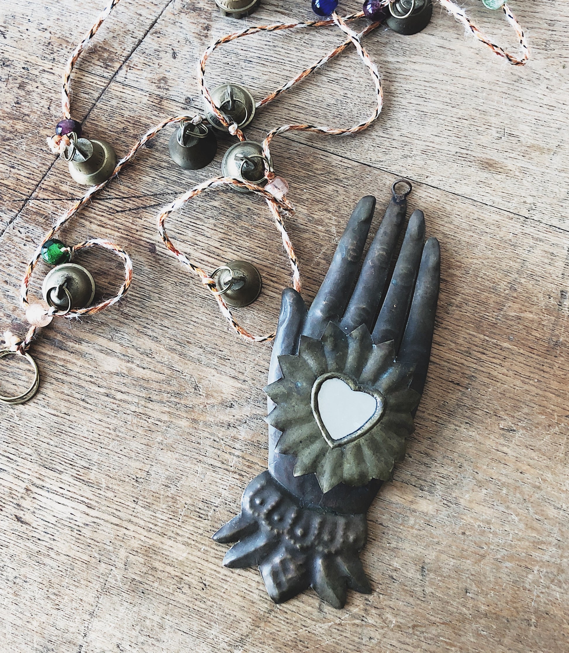 Pressed tin hand milagro with mirror, sacred heart and hand. We Love these and could easily collect them. Made in Mexico. A wire hanger on back