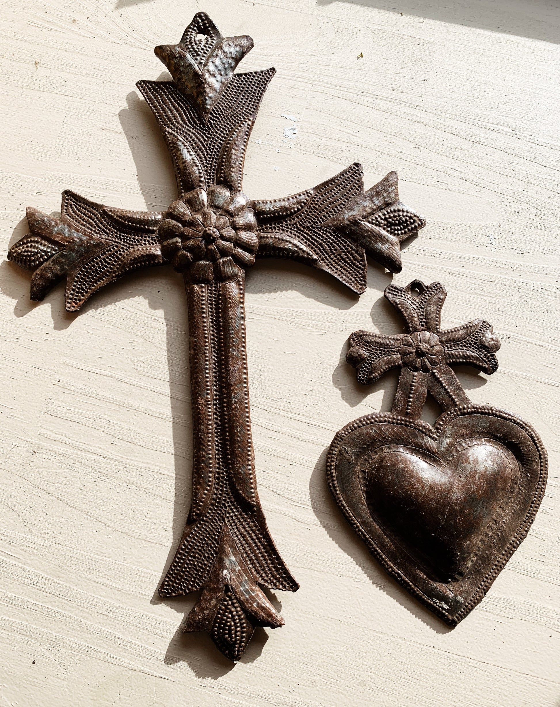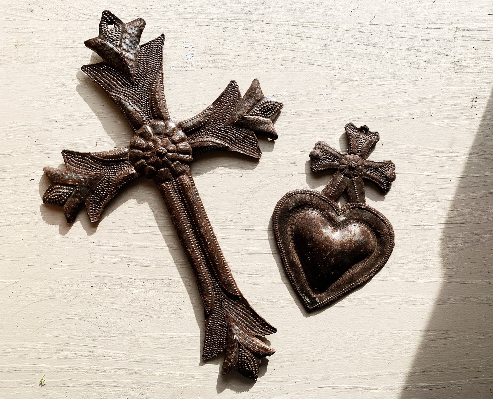 Wonderful aged pressed tin devotional folk art. A larger sized cross and sacred heart. Ready to hang on your wall or tree. Will come with cotton thread to hang.