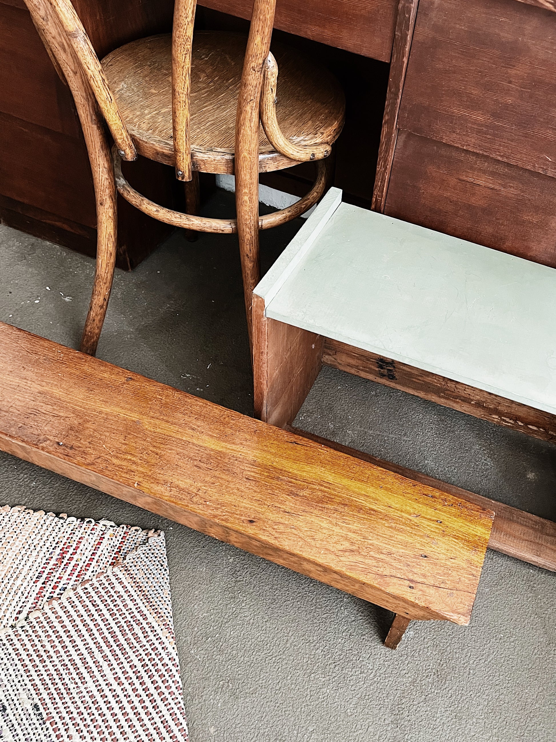 A very old wooden boot bench, primitive in style. Wood is mellow with age. Just perfect.