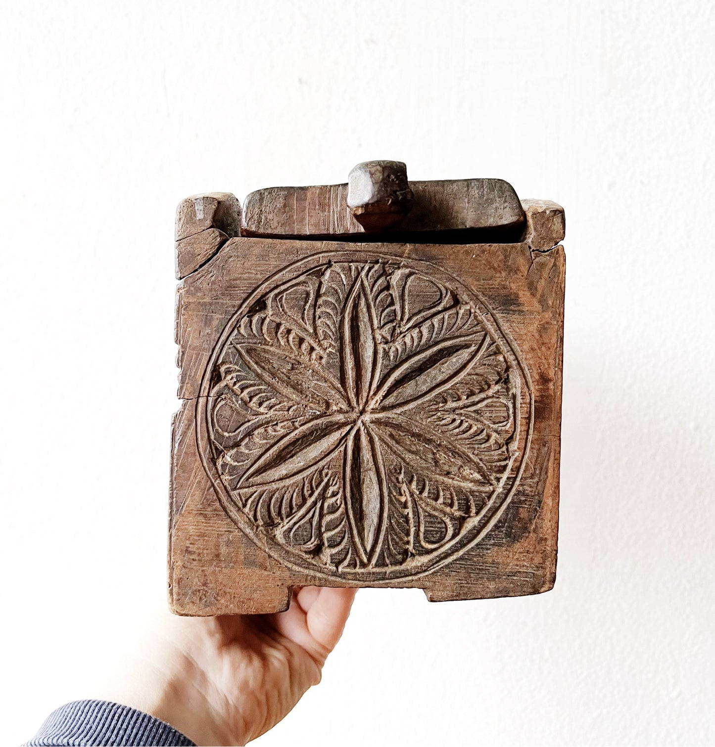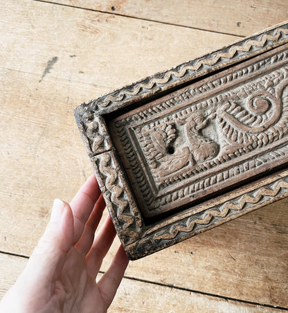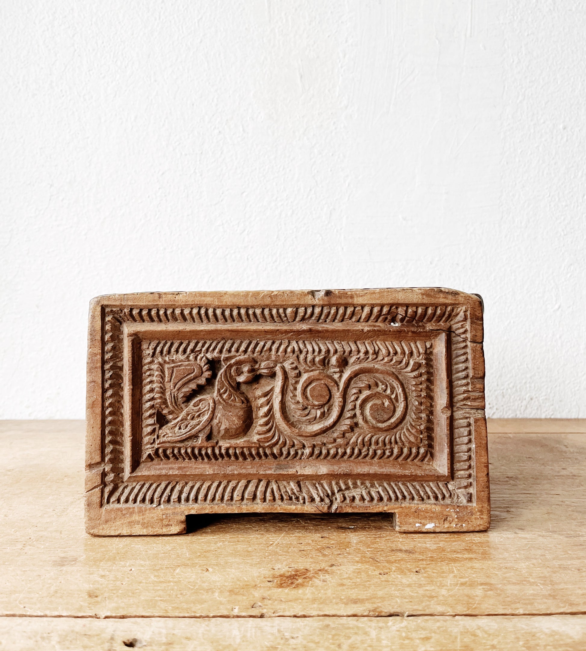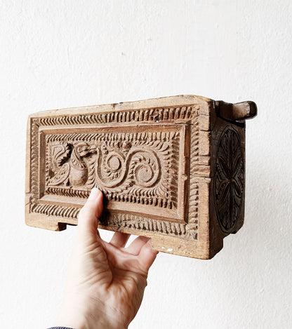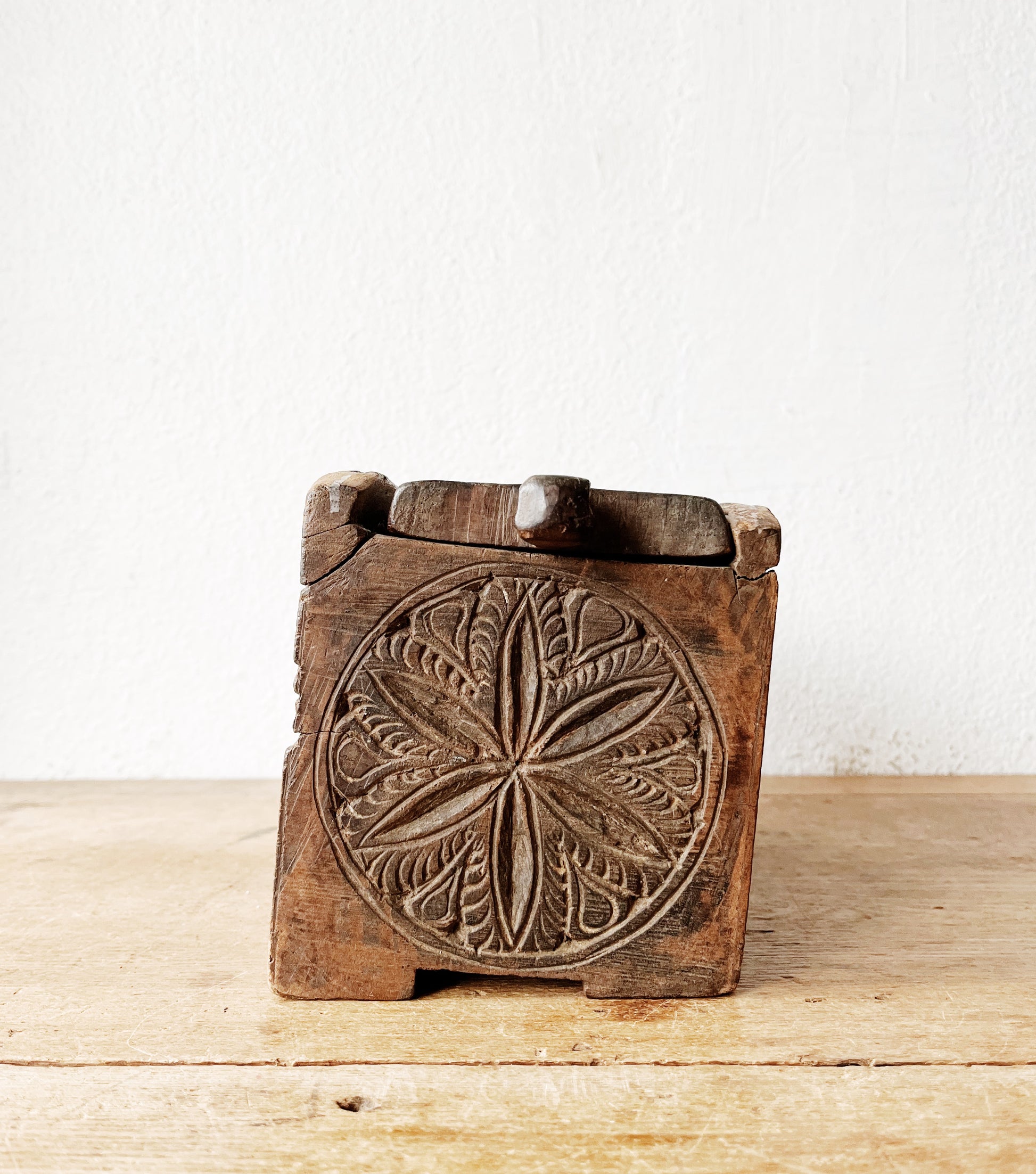 Deeply and beautifully carved box with sliding lid. There is a small hole for what we believe is to hold incense sticks, stored in the box below. Mandala on both ends. Weighty