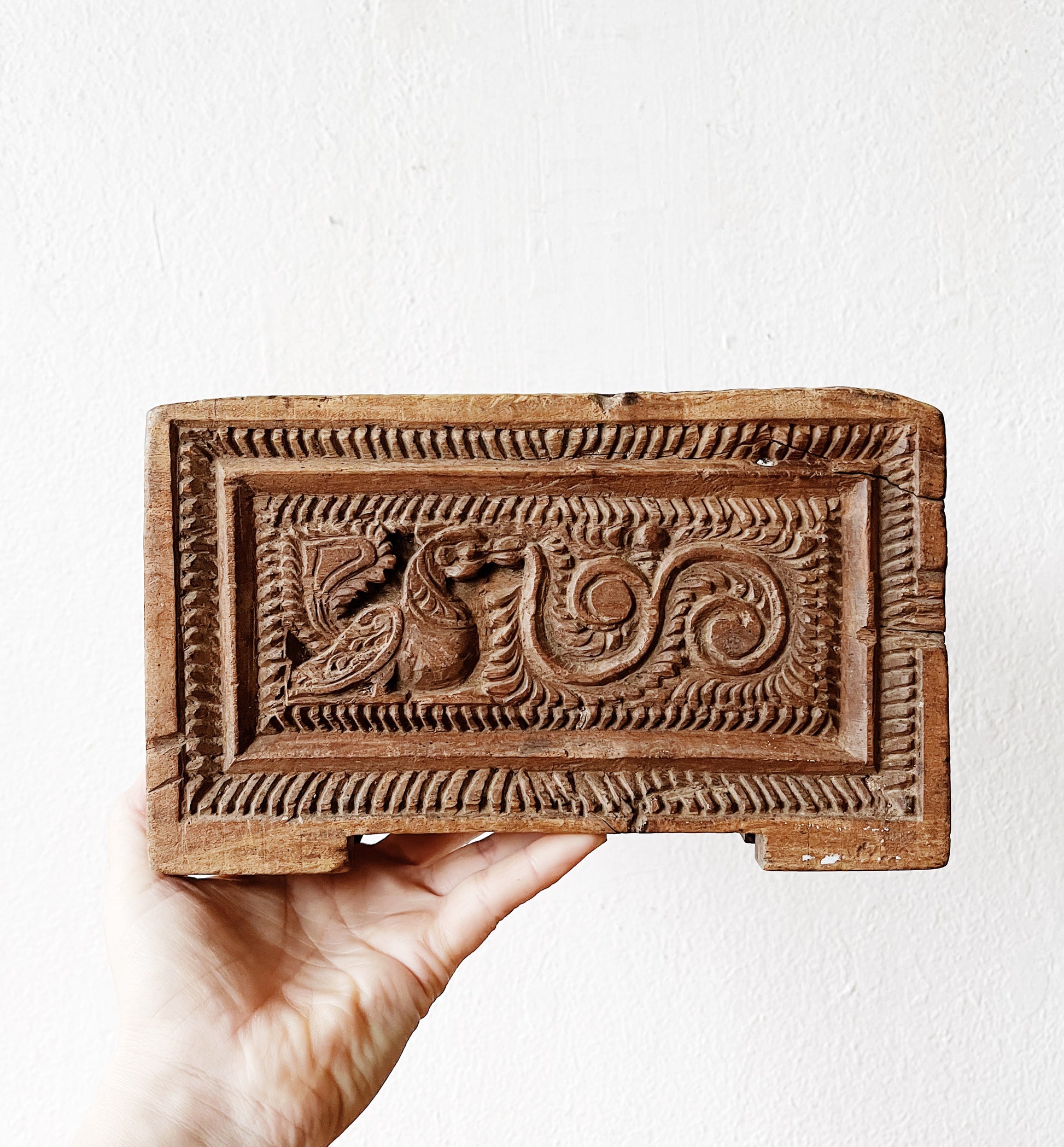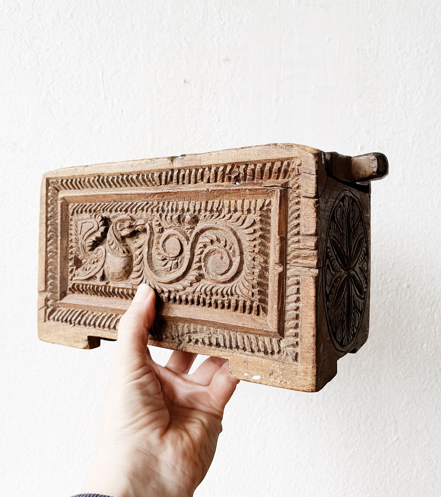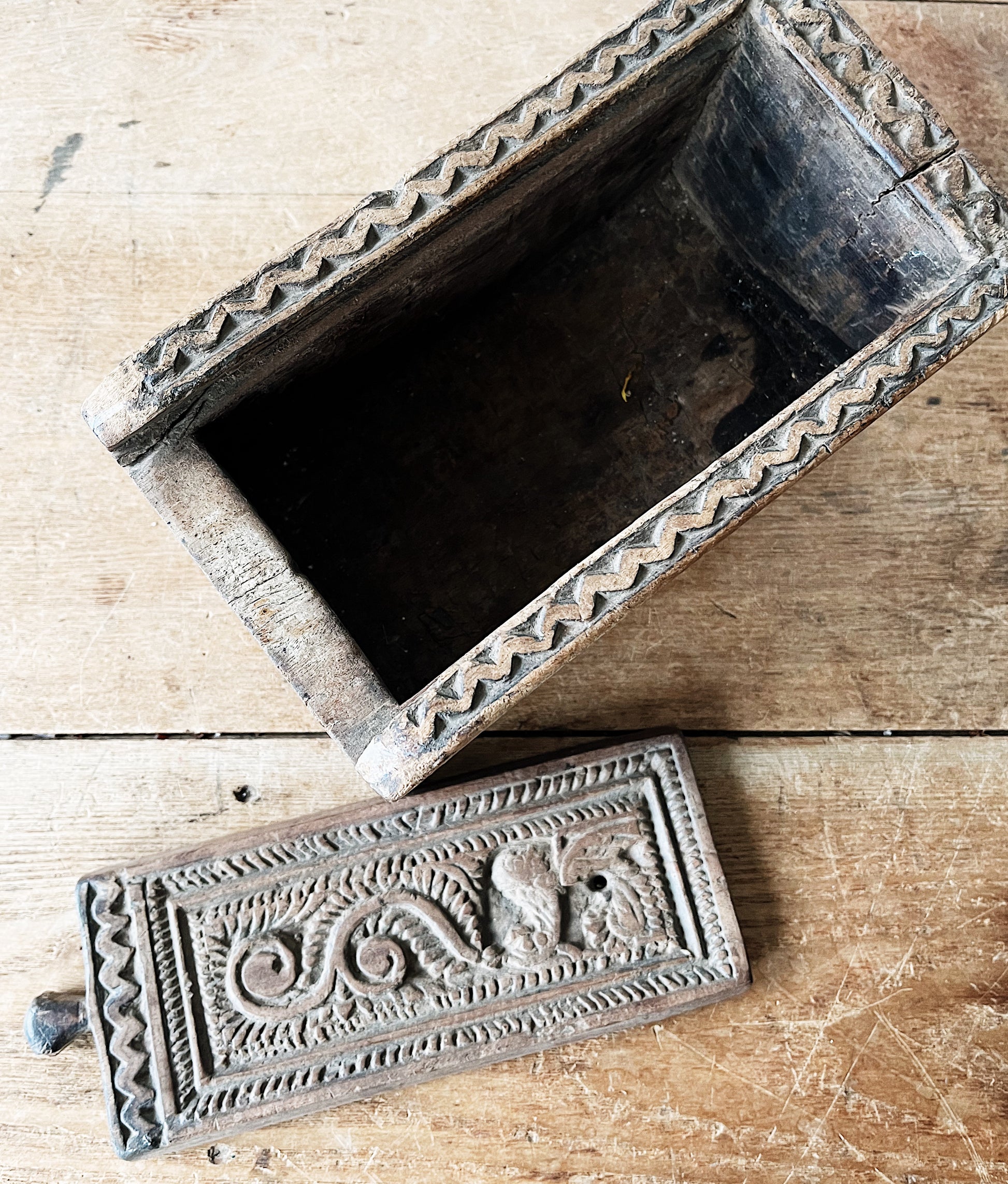 Deeply and beautifully carved box with sliding lid. There is a small hole for what we believe is to hold incense sticks, stored in the box below. Mandala on both ends. Weighty
