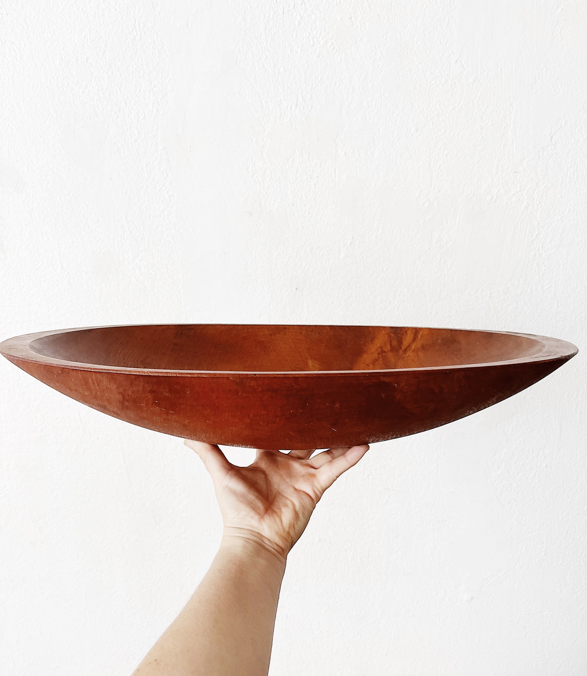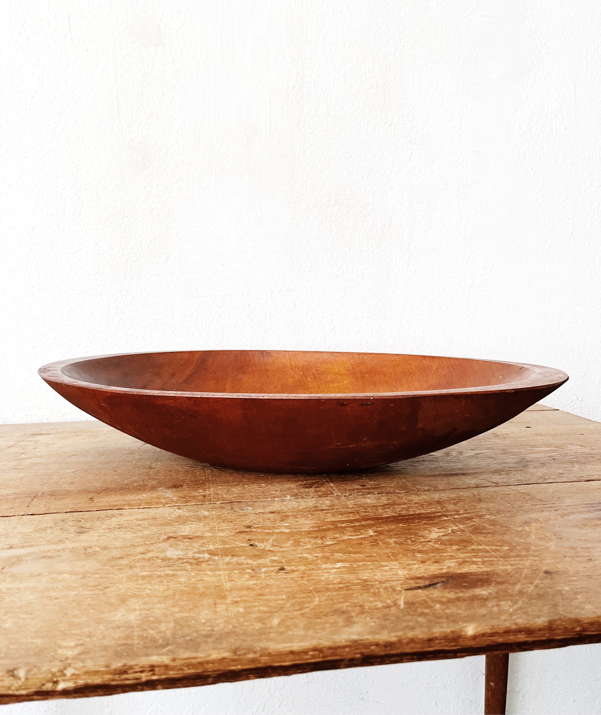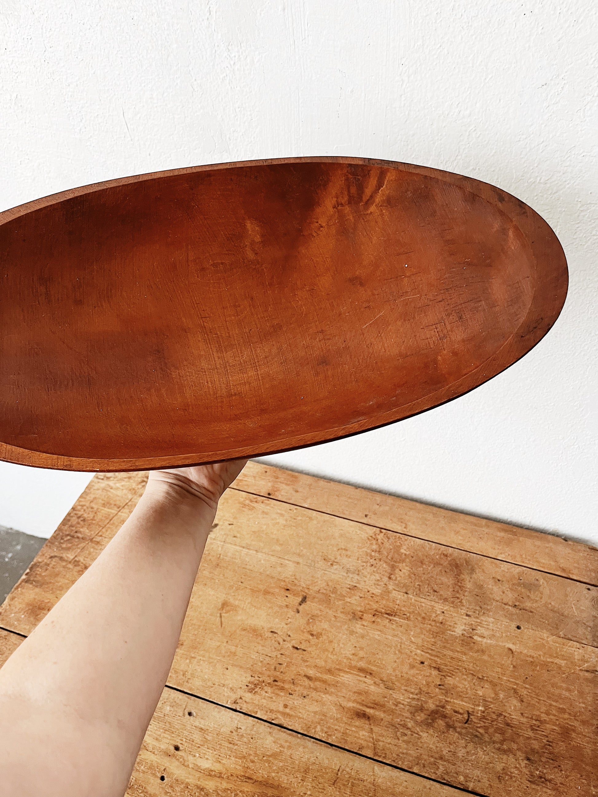 Hand carved old growth wood dough bowl. Nice boat shaped, with integrated handles. Imagine the loaf you could rise in this! Also nice down the center of a dining table filled with autumn fruits