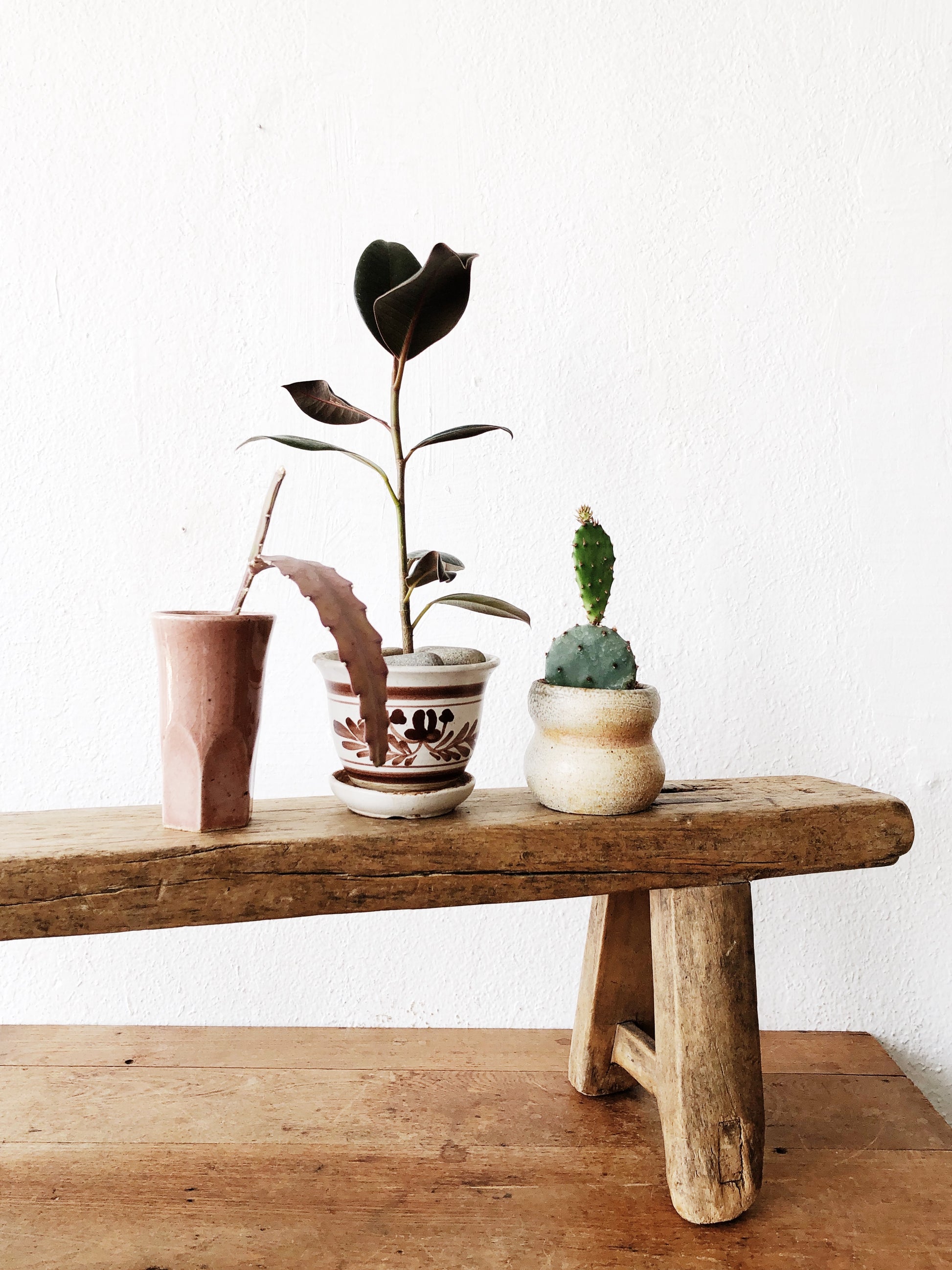A petite and simple primitive bench. Perfect for plants or decorative items. Nice faded wood and chunky legs