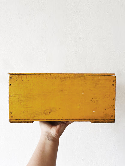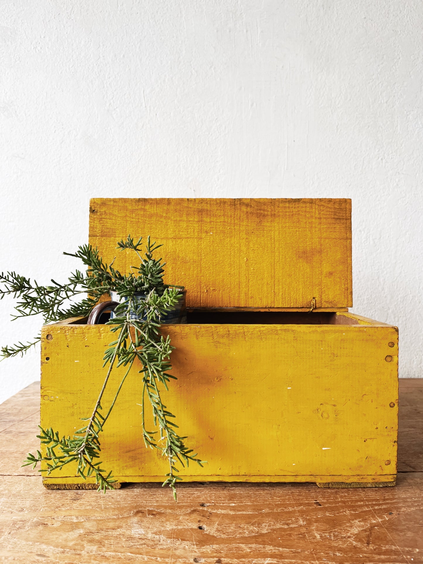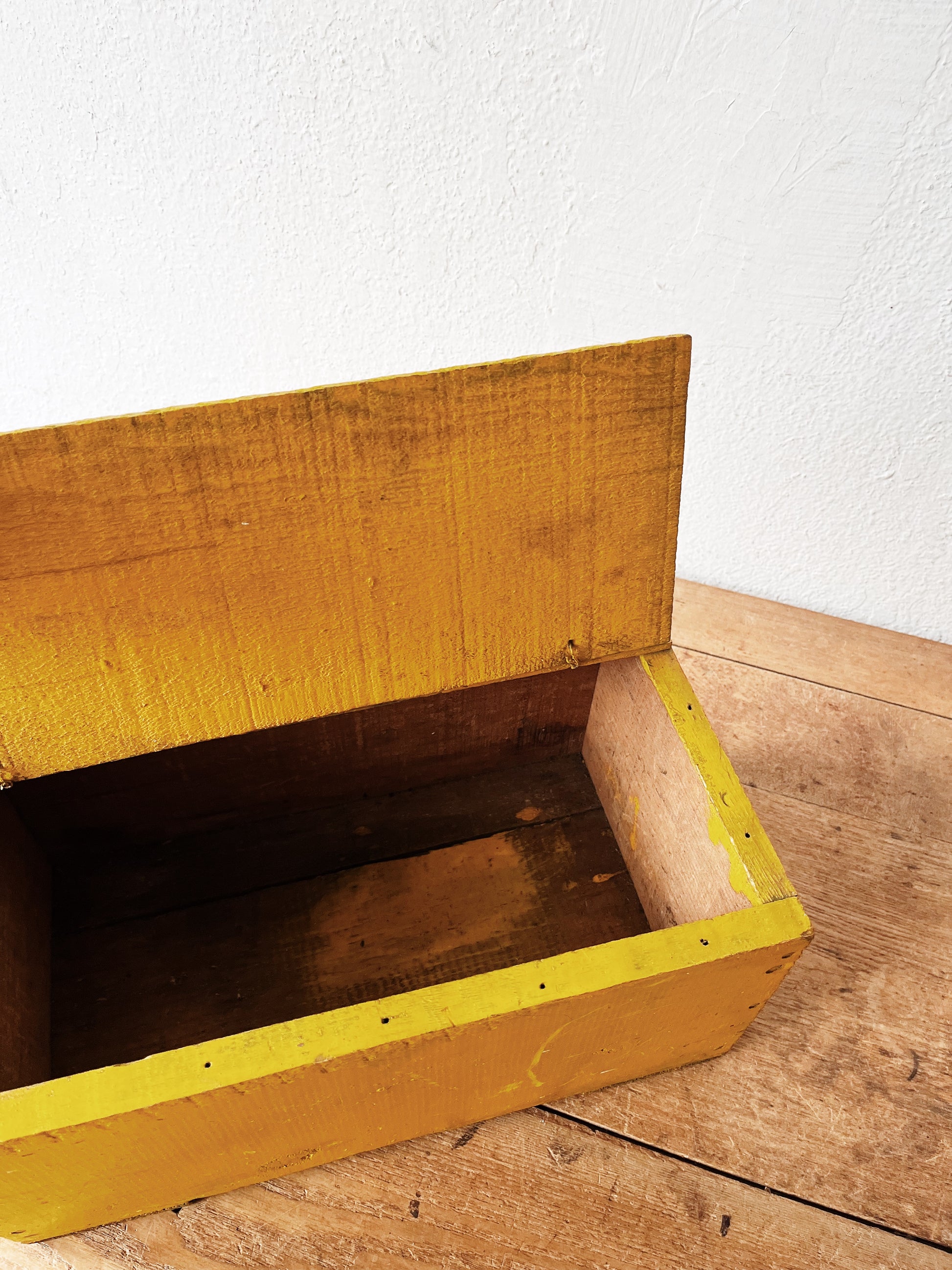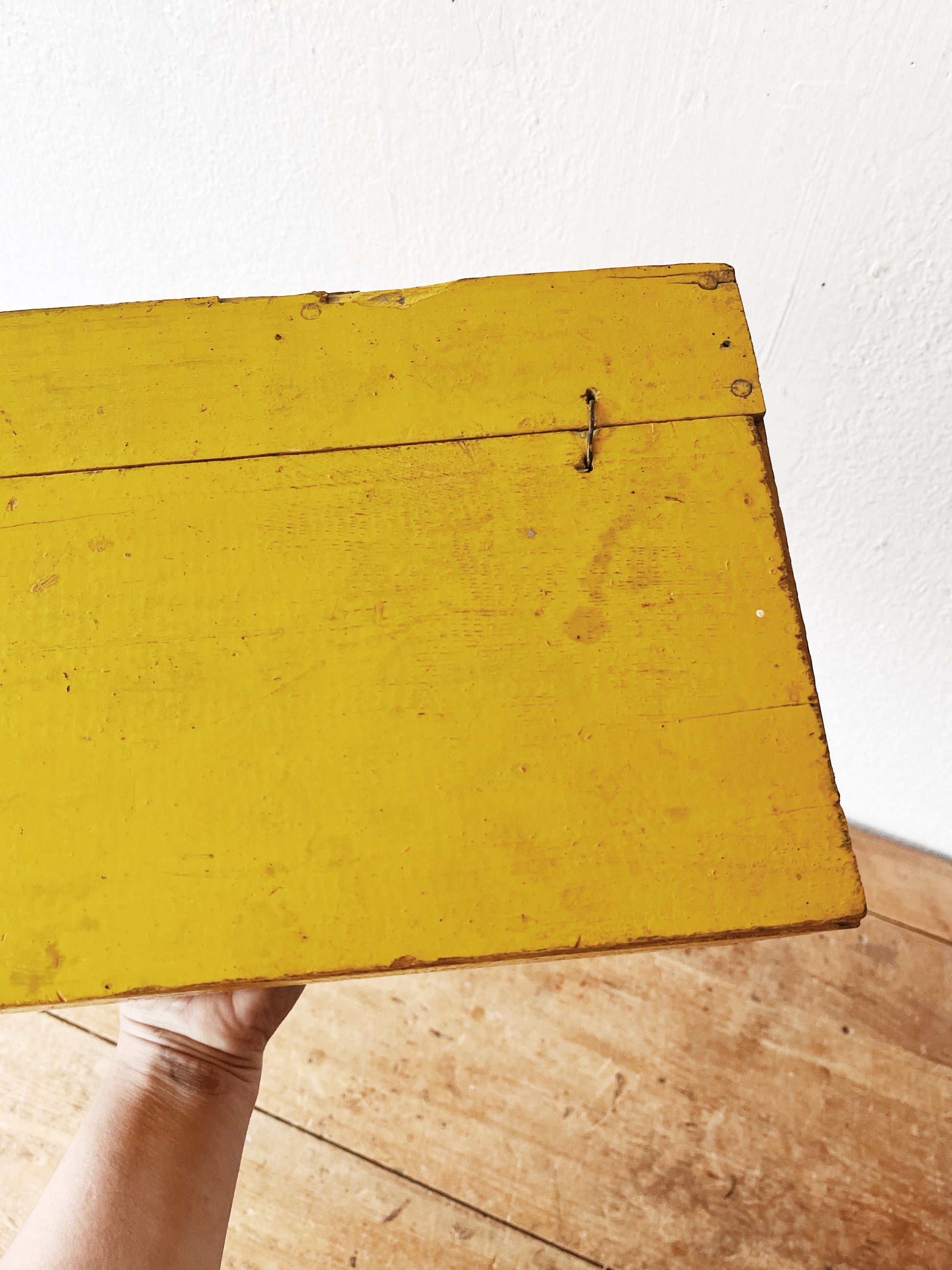 Primitive wood box in egg yolk yellow paint. Simple wired lid. A really great example of simple prim design.