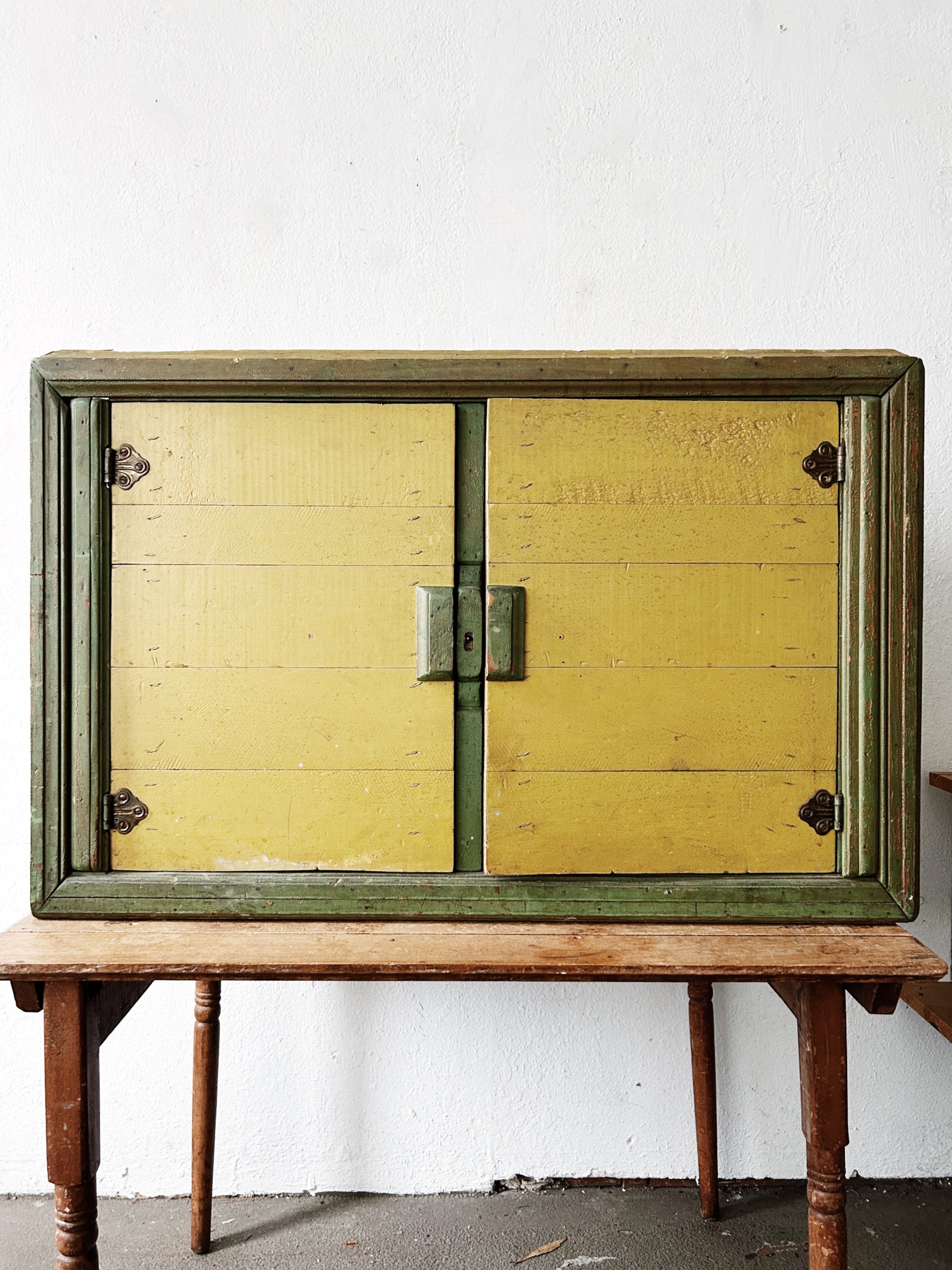 Got this fantastic cabinet from another dealer friend who used it for years on her front porch. Such a great piece. Sturdy, solid wood. The right side door doesn’t close all the way, see in photos. It did, but the latch is stuck in the out position preventing it from completely closing. With some muscle it could be pushed in (the latch)