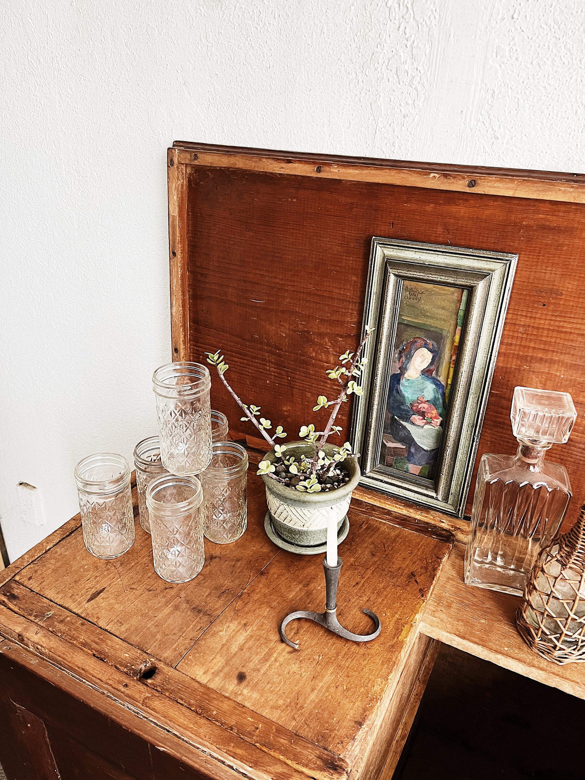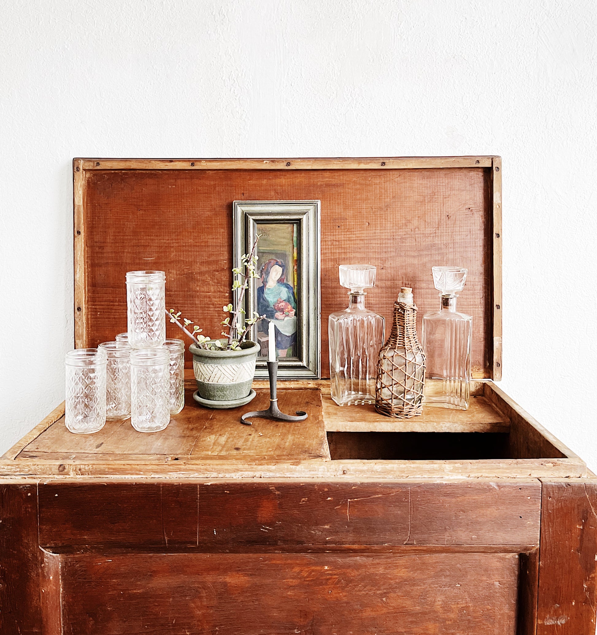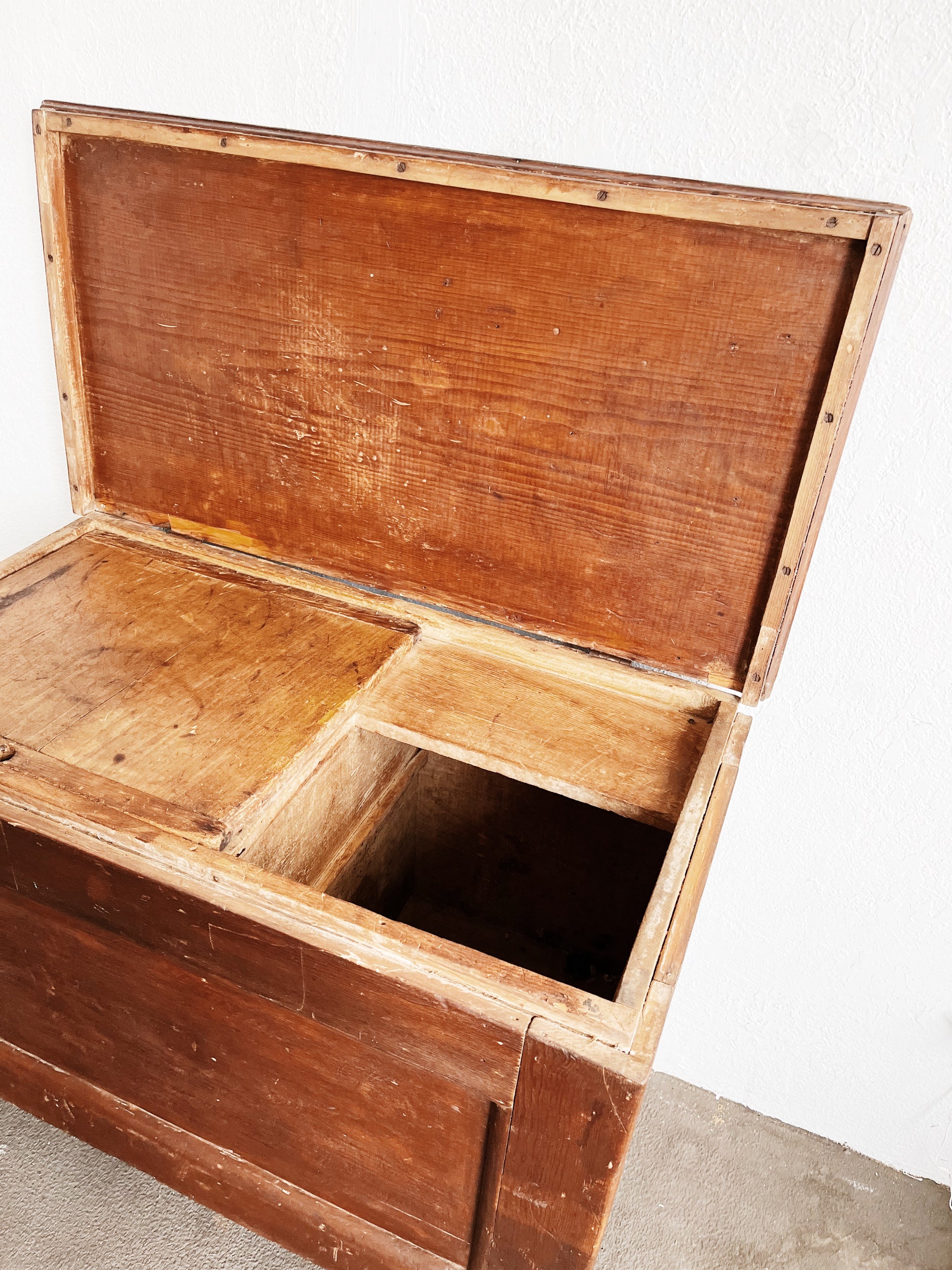 Amazing primitive wood chest that is waist high making this a wonderful candidate for a bar or usable surface. Paneled sides. And look at the inside! Cutting board that slides back-and-forth with two deep storage wells, one of which can accommodate an extra shelf if you choose to add it.