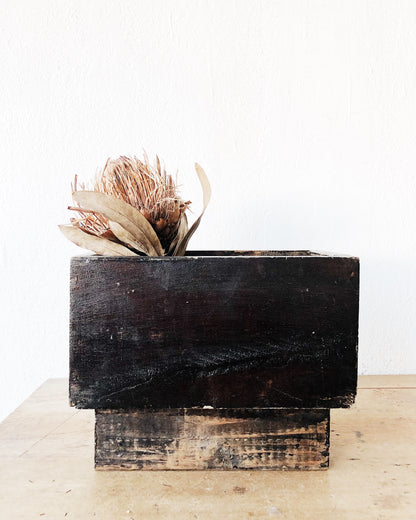 A chunky wood planter in the primitive style. Really loving the simple modern shape juxt with the weathered wood