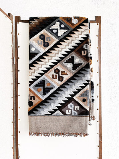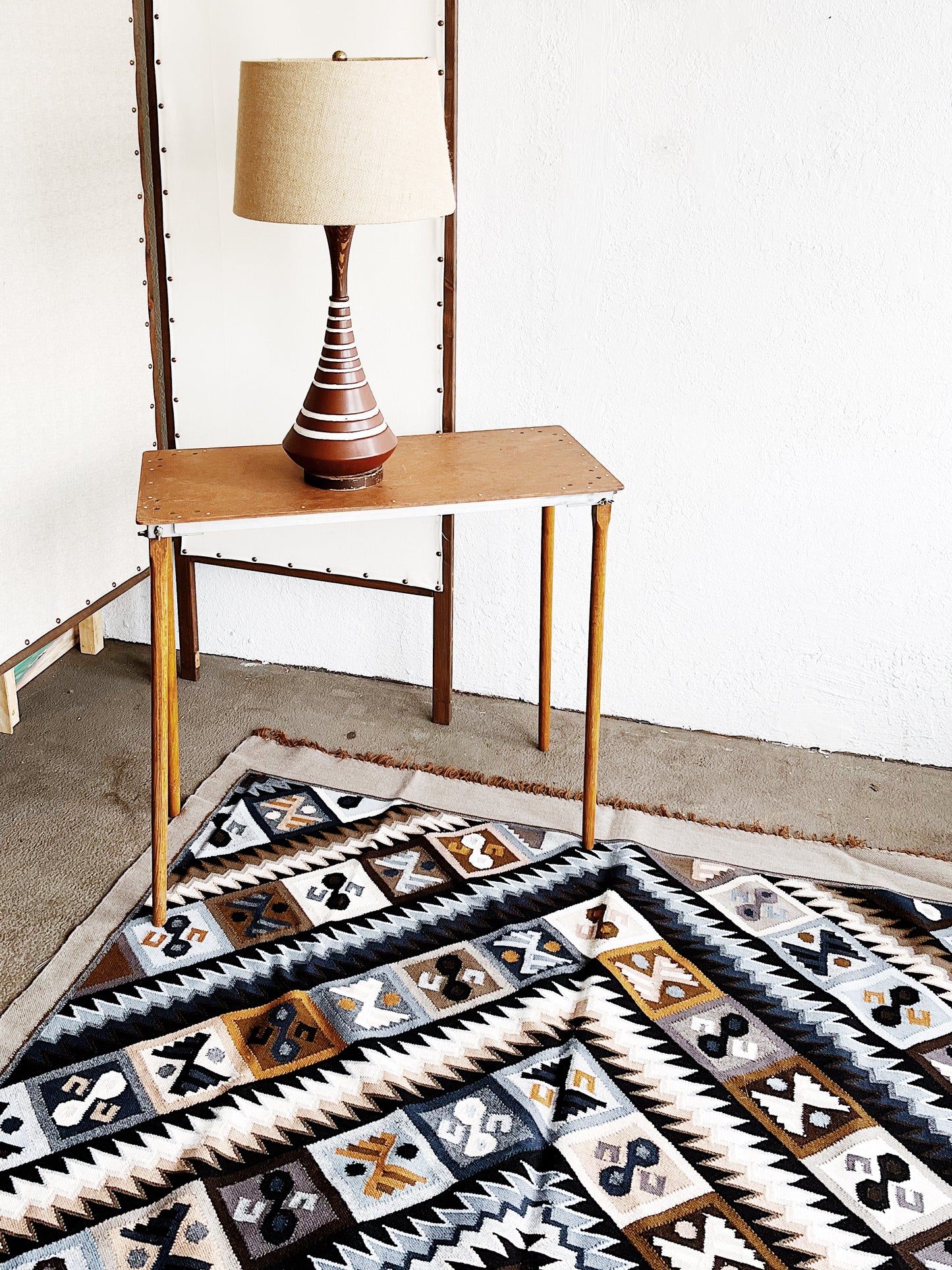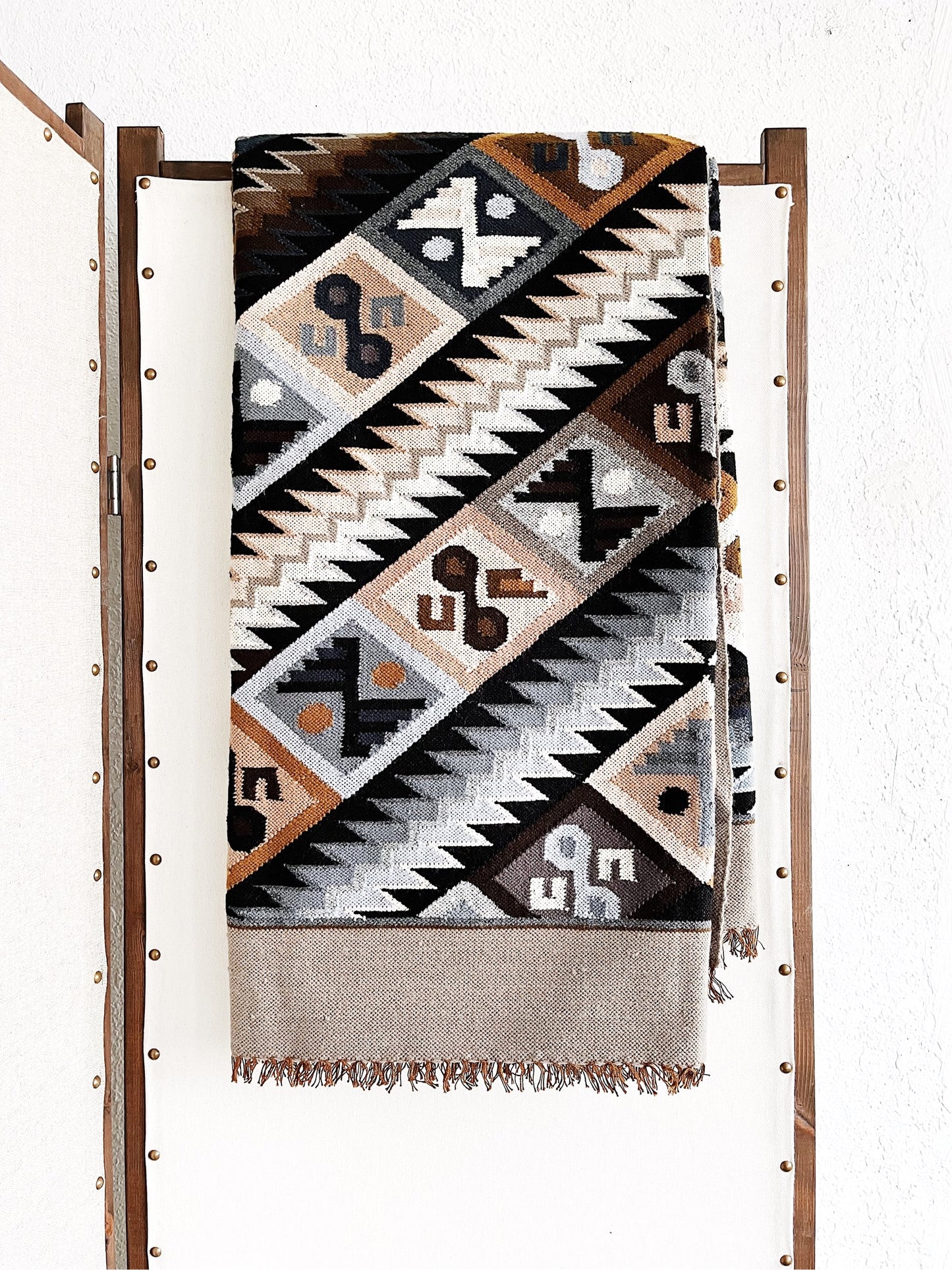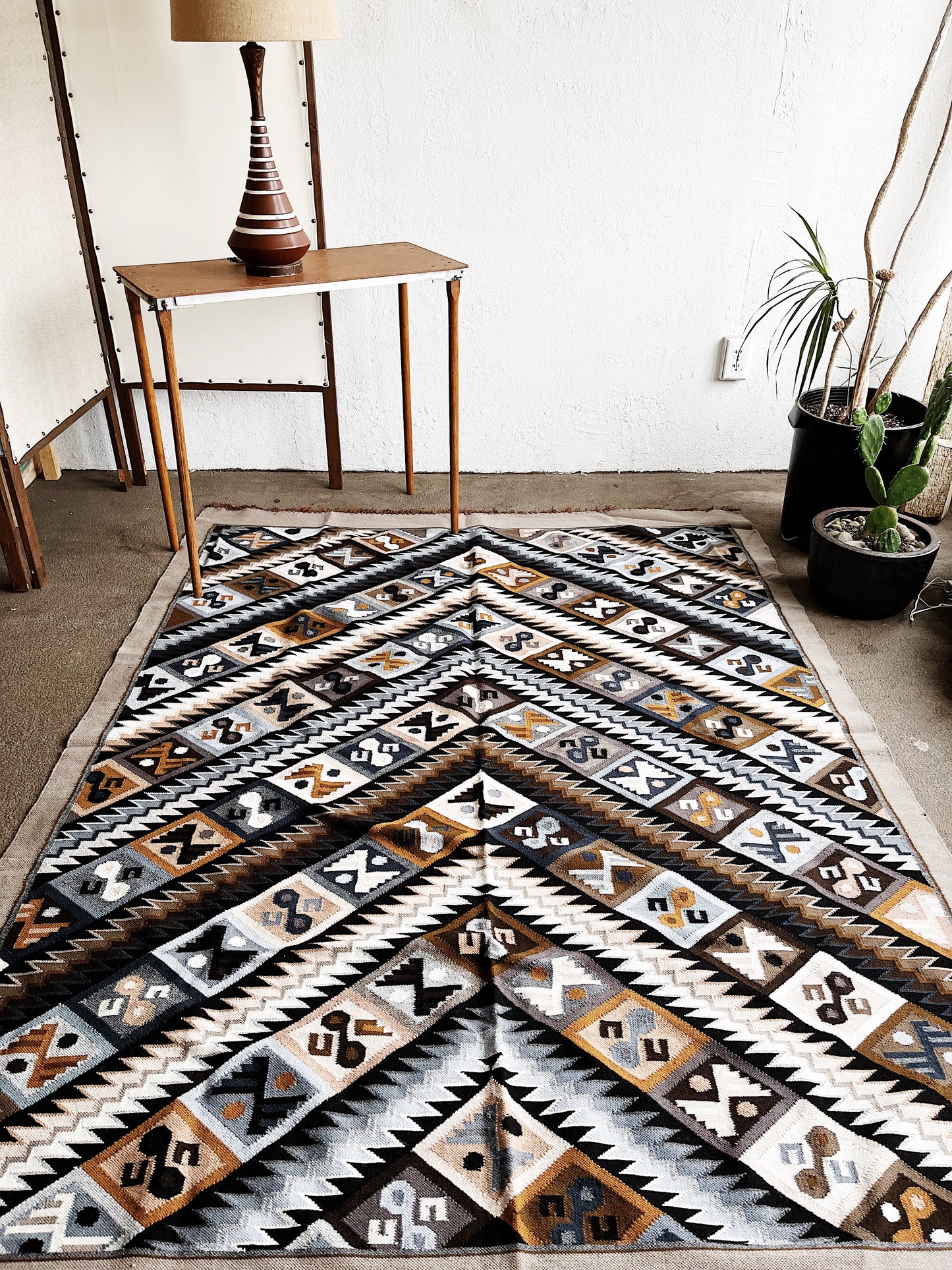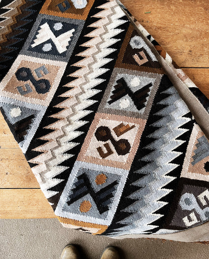 Flat weave rug in a geometric design. Reverses to the same colors and pattern. Mid weight allows this to be used as a coverlet too. Wool blend