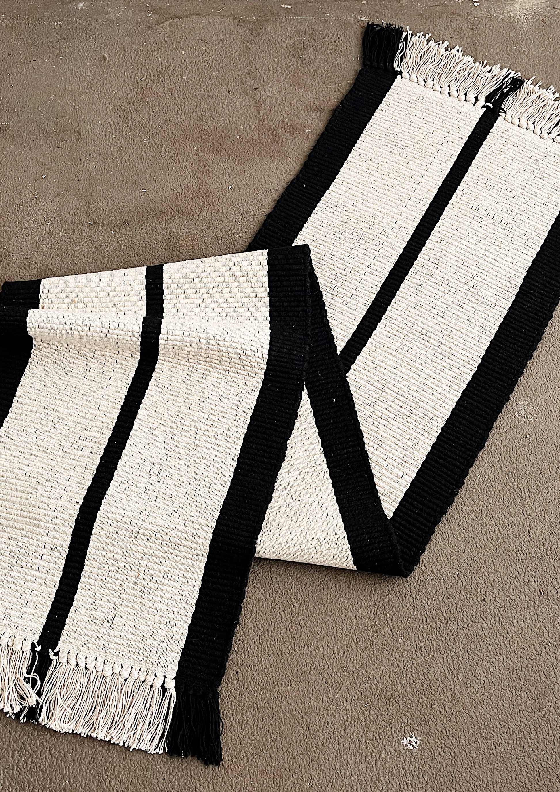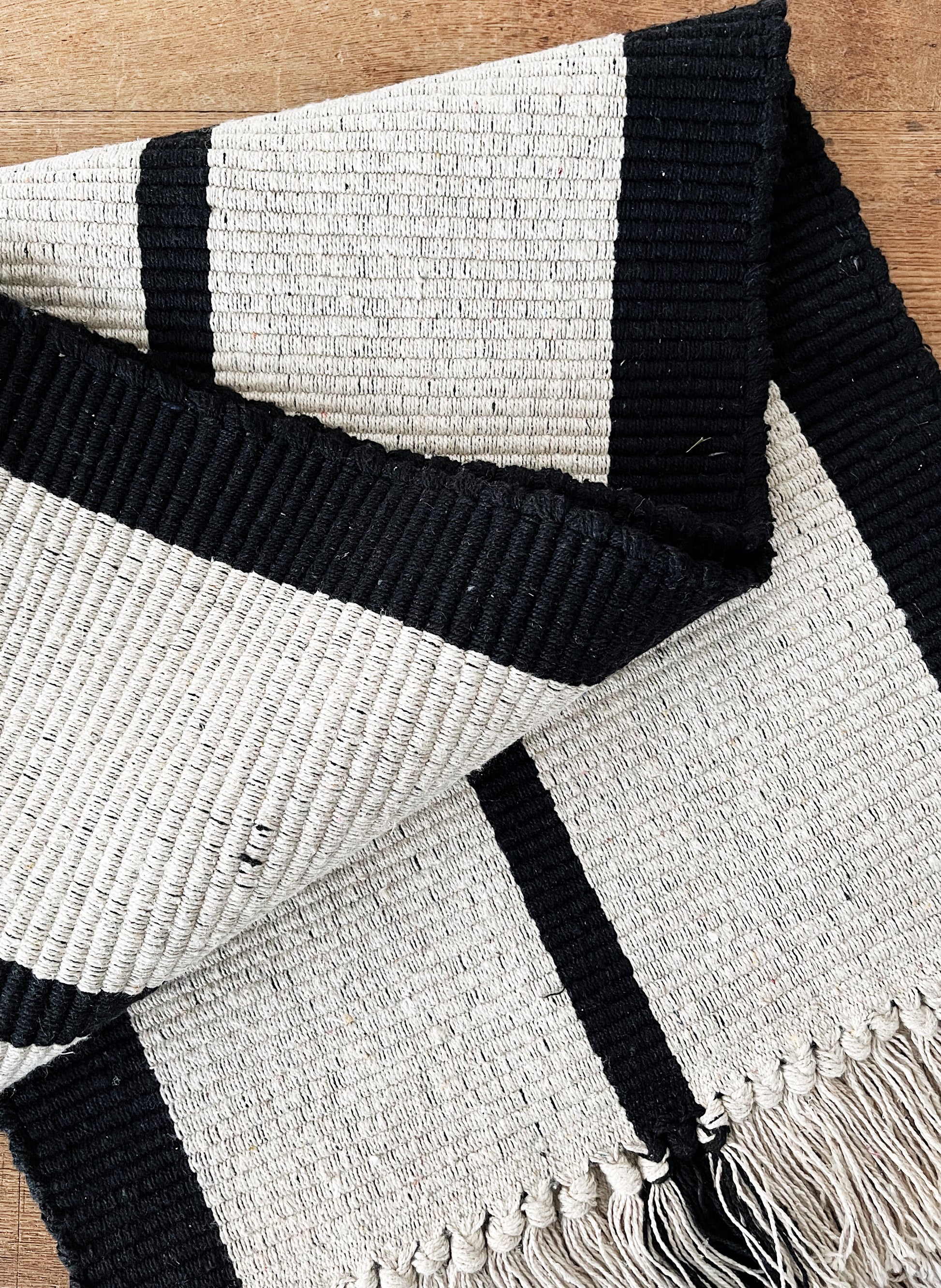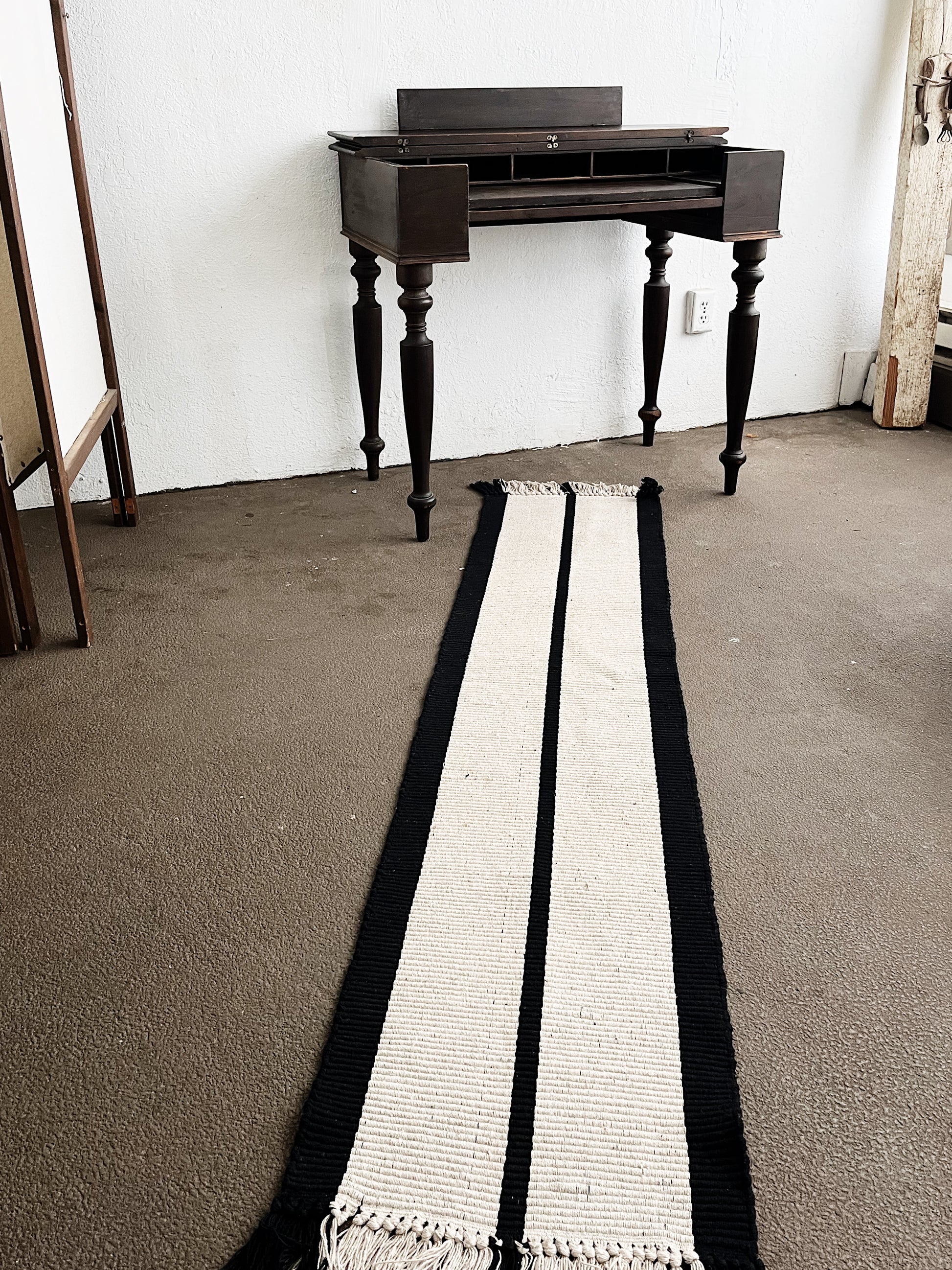 Simple cotton striped runner in black and ecru. Long, skinny and tightly woven, it would look good either on the floor or draped over a bench. Some overall faint staining from use, but perfect for a high use area. Washable