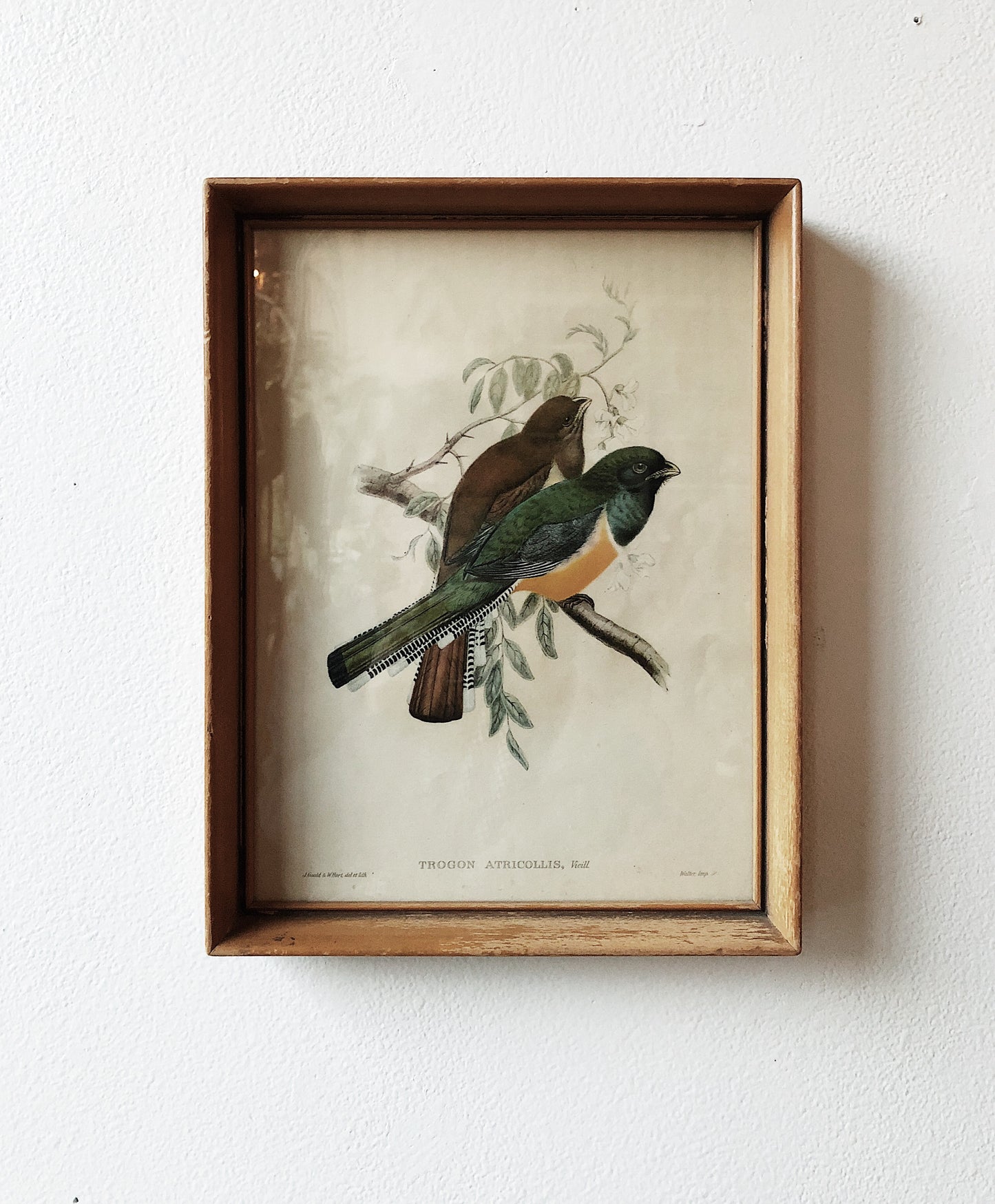 Extremely lovely antique hand colored litho of Trogon Atricollis. Artist John Gould was an ornithologist, a contemporary and admirer of Darwin, and studied/ drew birds in the early 1800s. Framed in wood. This is a collectible and rare print.