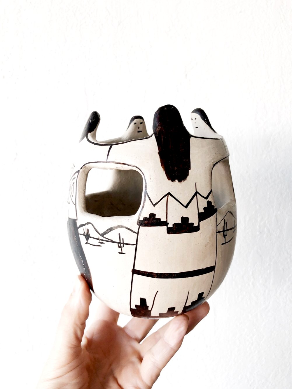 A rare friendship vase from the southwest Indian tribe Papago Tohono O’odham. The friendship vase, a 20th century creation, represents a social dance in which all are invited to join. Most of the pottery of this tribe was and is made by women, with a couple of men who produced as well.